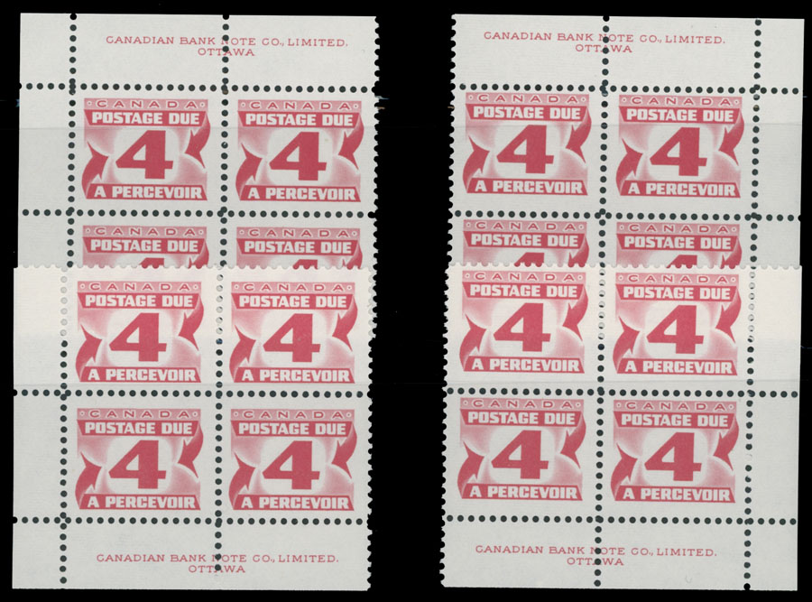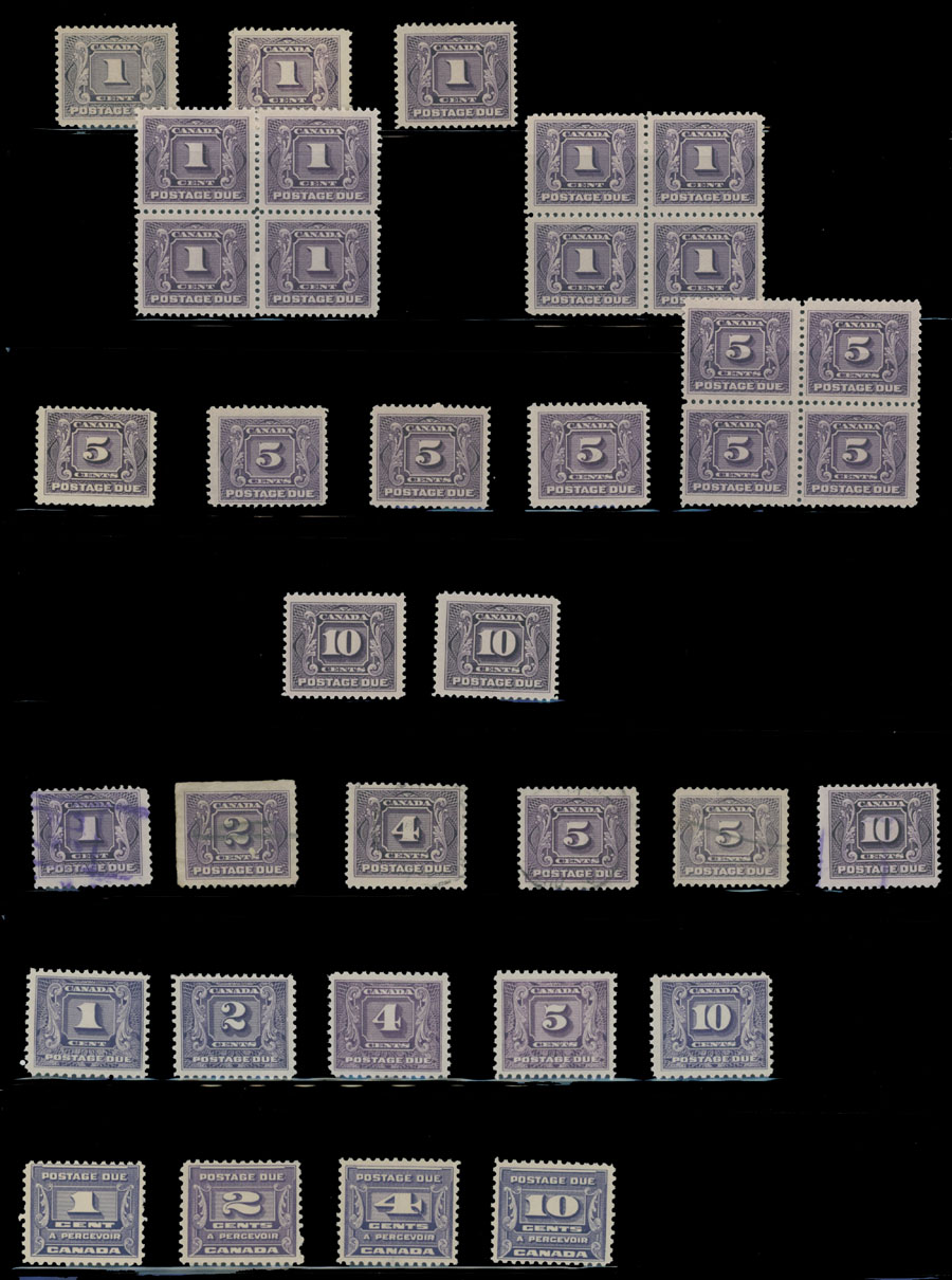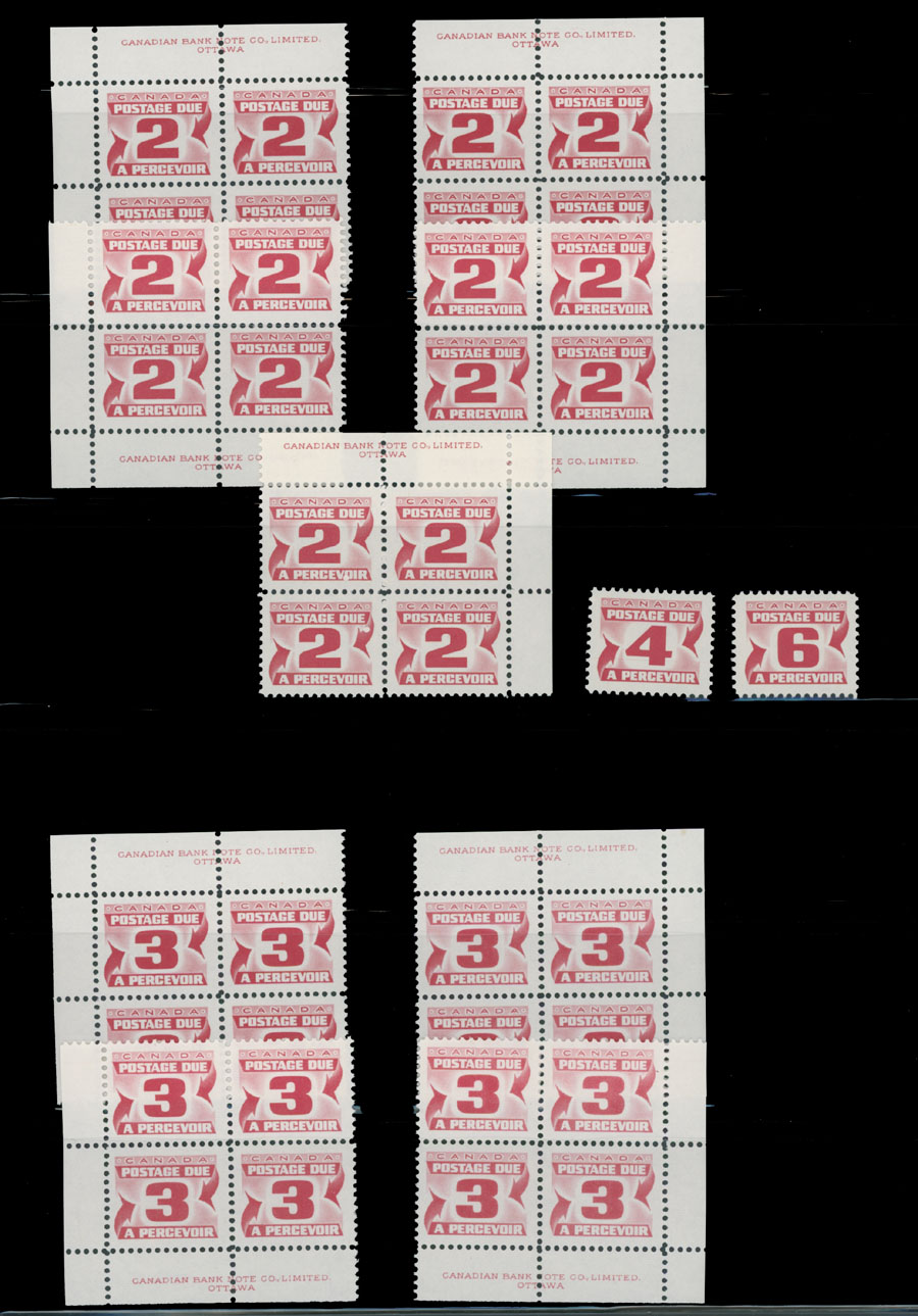 COLLECTION BALANCE: 1906-74, 117 mostly mint stamps (8 – used), representing seven different issues, including 20 blocks of four (17 – from the 3rd issue of ”red” dues), some color shades, especially of the 1st issue are included, fresh condition, full/part of OG or used, many NH stamps, F/VF, C.v. is about $1,700, Unitrade C.v. CAD$2,600, Est. $300-$400, Scott #J1/J31