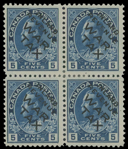1915, black overprint ”Inland Revenue. War Tax” on Admiral stamp of 5c blue, block of four, full OG, hinged centrally, fine, Unitrade #MR2B i, C.v. CAD$480 as singles, Est. $120-$150 , Scott #MR2 var