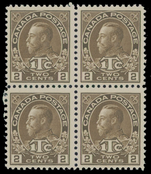 1916, ”1Tc”, 2c+1c yellow brown, unfolded block of four, full OG, NH, VF, C.v. $330++, Unitrade #MR4 i, C.v. CAD $480 as singles, Est. $120-$150 , Scott #MR4 var