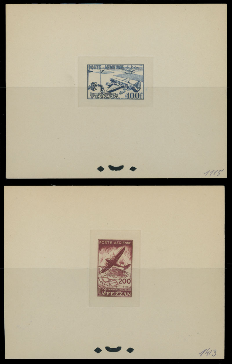 1948, Airplanes, 100fr red and 200fr deep blue, perforated complete set of two and two epreuves de luxe in colors of issued stamps, both with typical punches and French imprint at the bottom right; plus two trial color proof sheets in reversed colors (100fr in blue and 200fr dark carmine) with punches, but instead of imprint with written color identification numbers ”1115” and ”1413” respectively, all are fresh, VF, the last two sheets are rarities, only a few exists, Est. $500-$600, Scott #2NC1-2