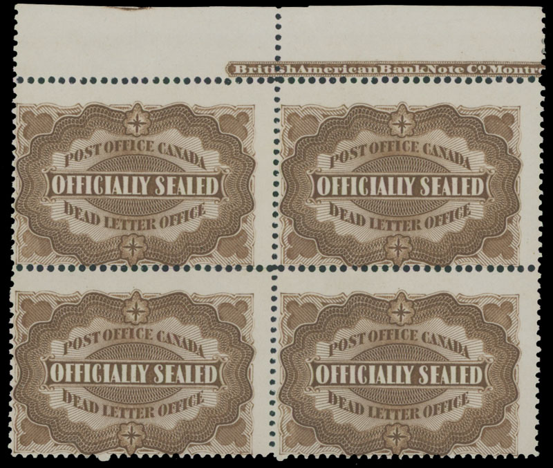 1879, Dead Letter Office, light brown shade, top sheet margin block of four with B.A.B.N. imprint, some perf separation in the middle, full OG, NH (hinged only in selvage), fine and rare multiple, V. Greene certificate, Unitrade C.v. CAD$3,000, w/o 3x premium for plate block, Est. $1,200-$1,500, Scott #OX1