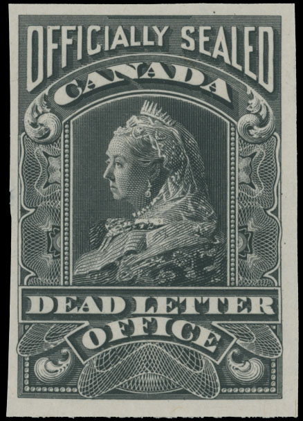 1902-07, Queen Victoria, Dead Letter Office, imperforate proof in black printed on India paper, no gum as produced, VF, Unitrade C.v. CAD$1,000, Est. $350-$400 , Scott #OX2