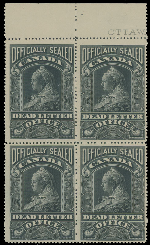 1907, Queen Victoria, Dead Letter Office, black on white paper, top sheet margin block of four, partial imprint on selvage, full OG, NH, F/VF, $1,800++, Unitrade C.v. CAD $2,200 (two stamps fine, two – VF), both values as singles, Est. $600-$700 , Scott #OX3
