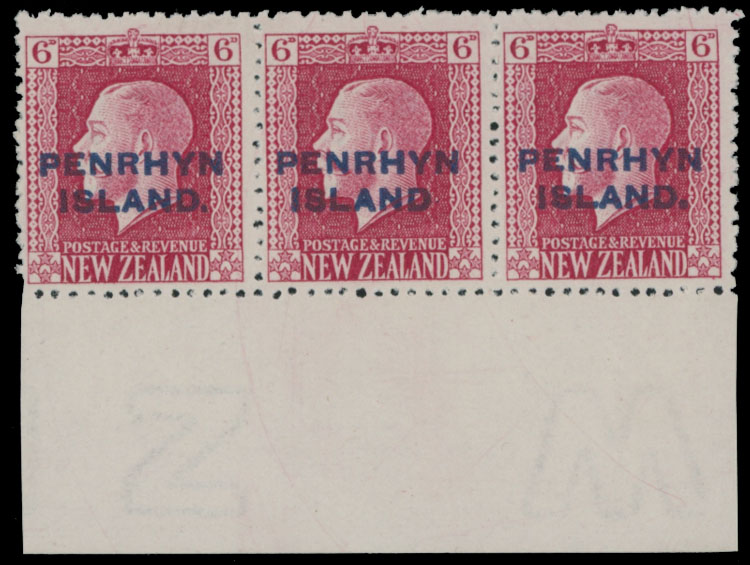 1918, King George V, blue overprint on New Zealand 6p carmine, perforation 14×14½, bottom sheet margin horizontal strip of three, middle stamp without period after ”Island” variety (position R.10/8), full OG, NH (error stamp) or LH, VF and scarce, only 197 such errors possible, SG #26a, ab, C.v. £460 as hinged singles, Est. $500-$600, Scott #23, var