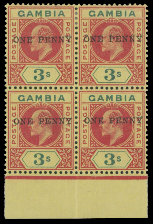 1906, black surcharge ”ONE PENNY” on King Edward VII stamp of 3s carmine and green, bottom sheet margin block of four, full OG, NH (bottom stamps) or hinged, VF, BPA certificate, C.v. $240++, SG #70, C.v. £260 as hinged singles, Est. $300-$350, Scott #66