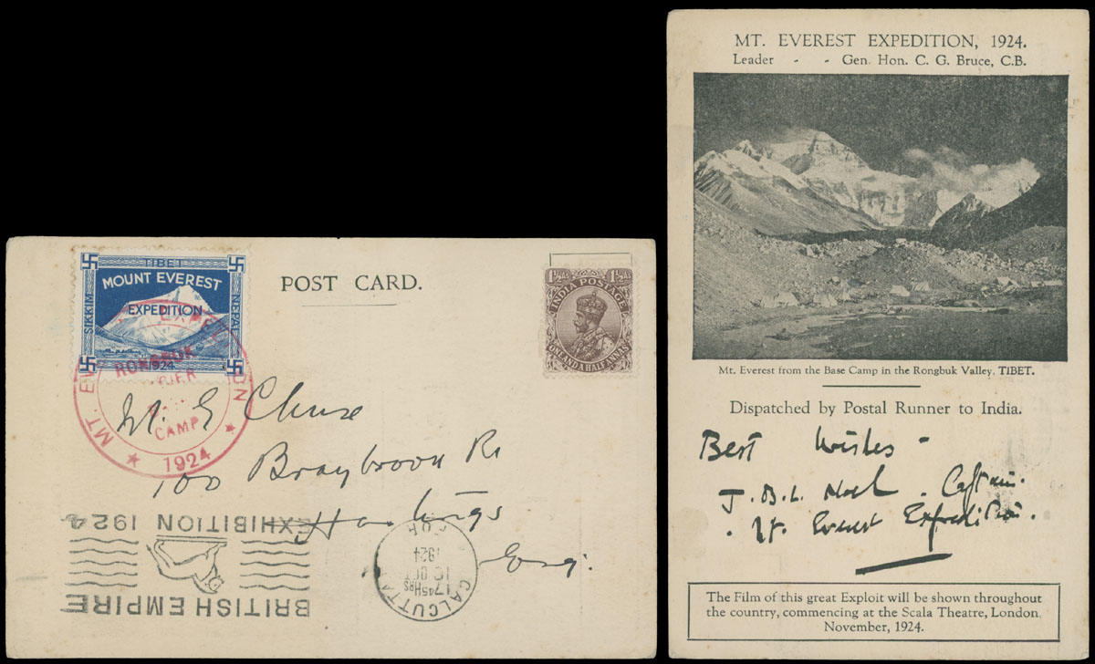 1924 (October 16), specially printed illustrated postcard, franked by King George V stamp of 1½a chocolate, by mistake Calcutta ”16.OCT.1924” machine marking place upside down, ”Mount Everest Expedition” label in blue is along side and tied by red ”Rongbuk Glacier Base Camp” cancellation, mostly VF and rather scarce, Est. $300-$350, Scott #102