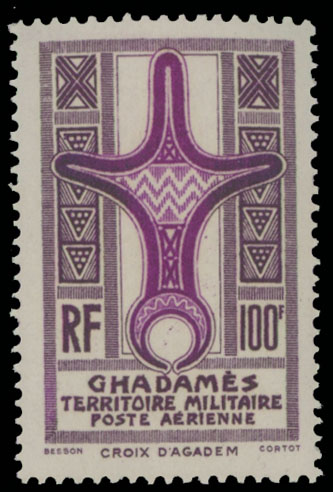 1949, Cross of Agadem, 100fr in violet and lilac (colors close to issued stamp of 50fr), full OG, NH, VF and rare, neat pencil sign on reverse, Sassone #A6E, C.v. €6,000, Est. $1,200-$1,500 , Scott #3NC2 var