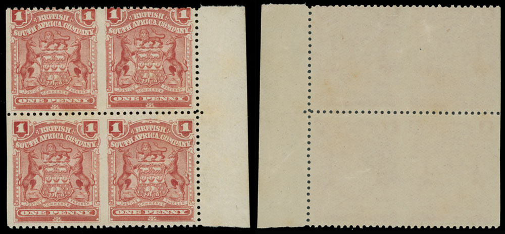 1905, Arms, 1p red, perforation 14, right sheet margin block of four, imperforate vertically at left and between stamps, nice and very fresh, upper perforation touched top of the design, while bottom pair is extremely fine, full OG, NH and scarce multiple, C.v. $900, SG #78a, C.v. £800, both catalog values as hinged two horizontal pairs imperforate between stamps, Est. $1,000-$1,200, Scott #60e var
