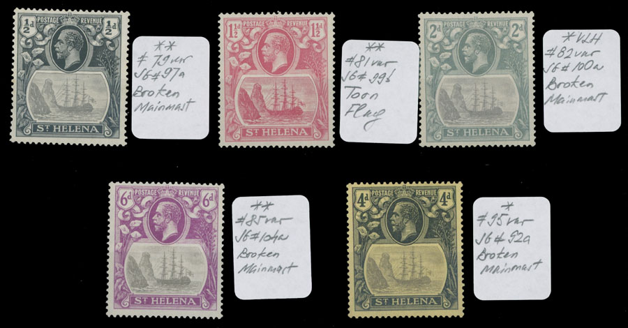 PLATE VARIETIES ON THE KING GEORGE V AND SEAL OF THE COLONY ISSUE: 1922-23, five errors, ½p, 1½p, 2p, 6p, watermark Multiple Script CA; 4p with watermark Multiple Crown CA, four values with Broken Mainmast and one has Torn Flag varieties, full OG, NH or VLH (2p and 4p), VF, SG #92a, 97a, 99b, 100a, 104a, C.v. £820 as hinged, Est. $500-$600, Scott #79/95 var