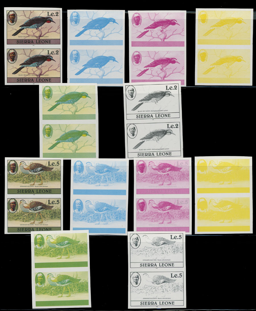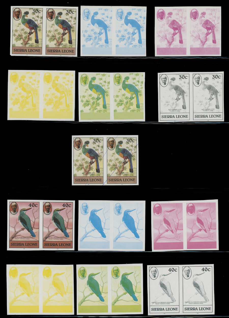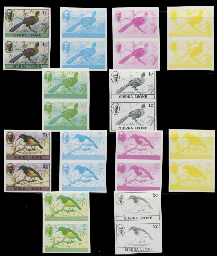 1980-83, Birds, 1c-5Le, imperforate proofs of complete design and stage proofs in cyan, magenta, yellow, yellow and blue, black; horizontal or vertical pairs, seven denominations with imprint ”1982” or ”1983”, printed on gummed stamp paper, NH, VF and rare group, which is great for the ”Birds” topic specialist, Est. $400-$500, Scott #463-76