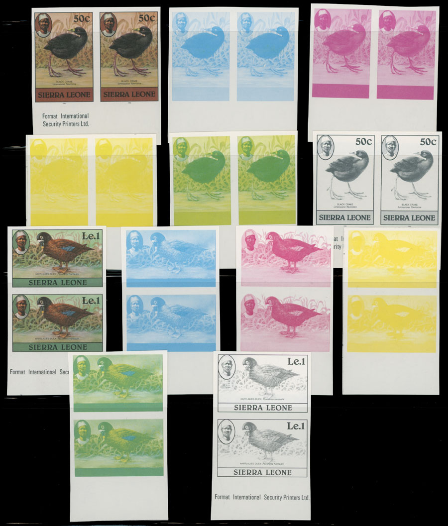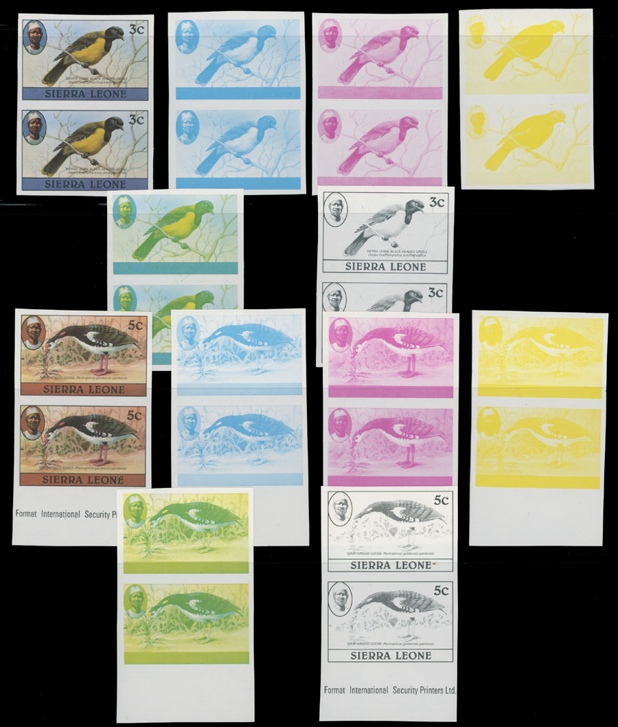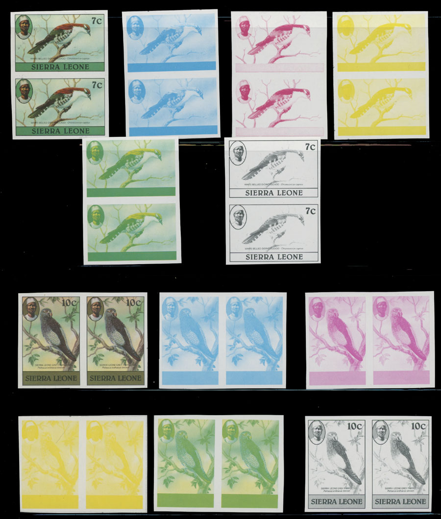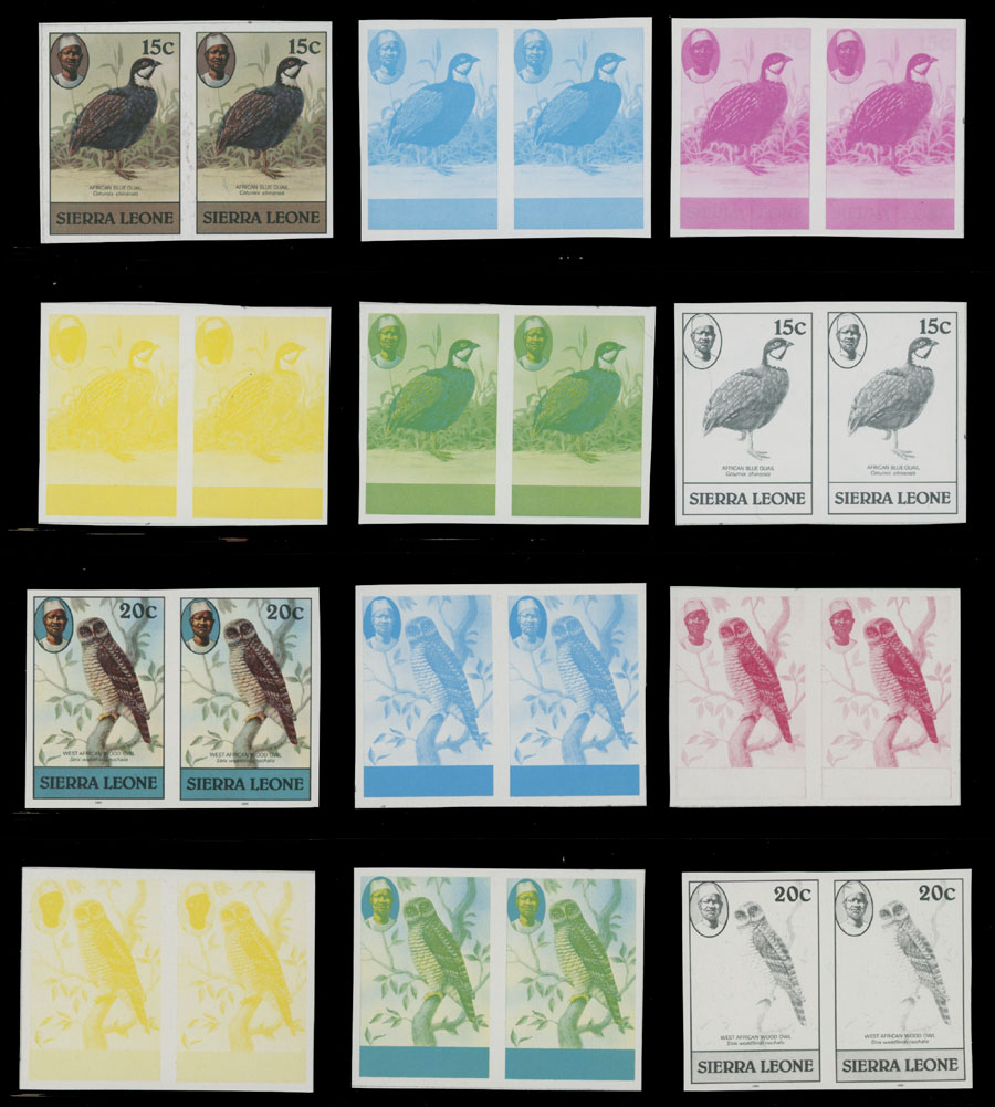 1980-83, Birds, 1c-5Le, imperforate proofs of complete design and stage proofs in cyan, magenta, yellow, yellow and blue, black; horizontal or vertical pairs, seven denominations with imprint ”1982” or ”1983”, printed on gummed stamp paper, NH, VF and rare group, which is great for the ”Birds” topic specialist, Est. $400-$500, Scott #463-76
