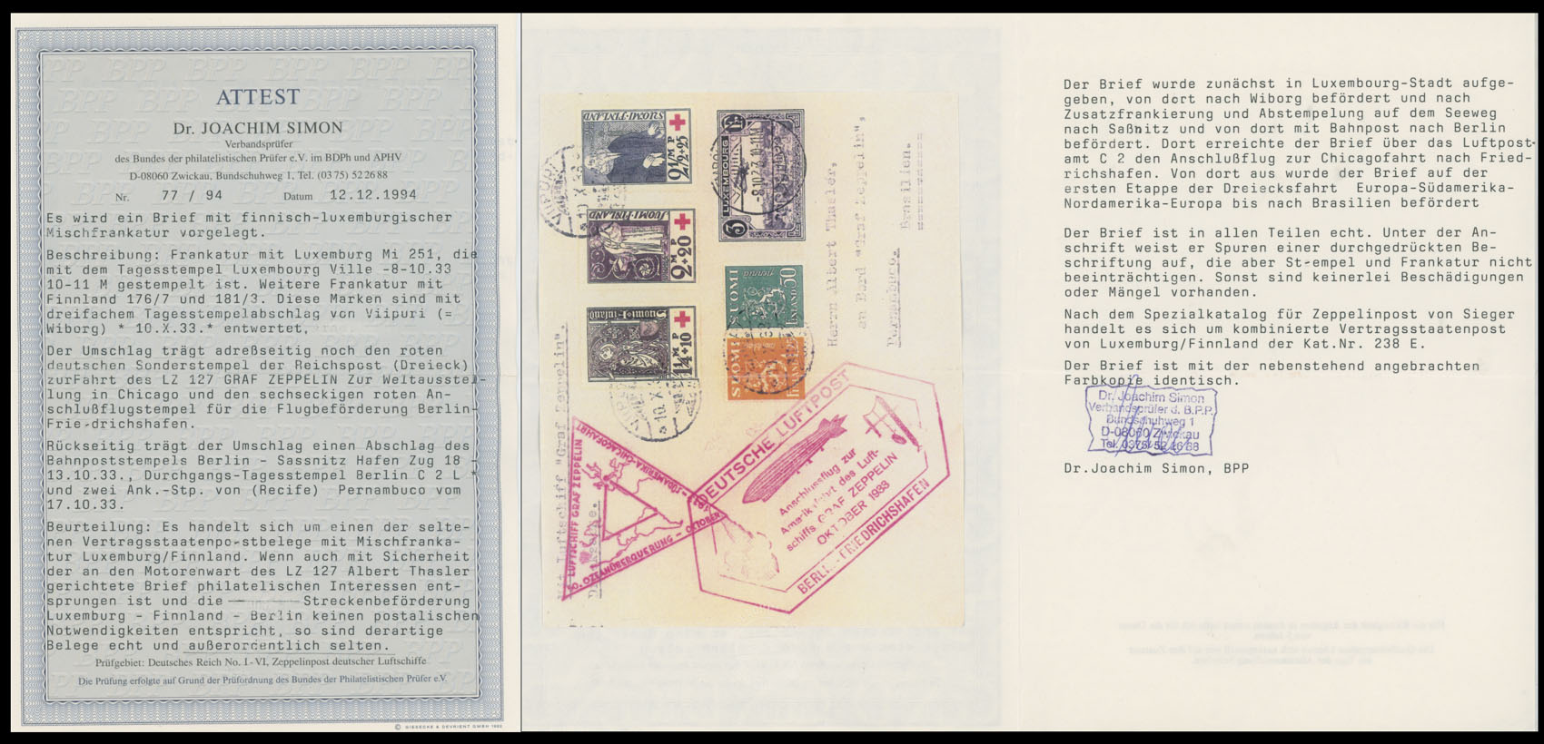 1933 (October 14-17), Chicago (Century of Progress) Flight mixed franking cover, originated from Luxembourg and bearing air post stamp of 3fr (Scott #C6), cancelled on October 8, upon arrival to Viipuri (now Vyborg, Russia) uprated by five adhesives, including complete semi-postal issue of 1933, tied on October 10, red Berlin-Friedrichshafen connection and red flight marking, Pernambuco ”17.X.33” receiver on the back, VF and probably unique cover, Dr. J. Simon certificate, Sieger #238, C.v. €500 either for cover originated Luxembourg or Finland, Est. $1,000-$1,200, Scott #B12-14