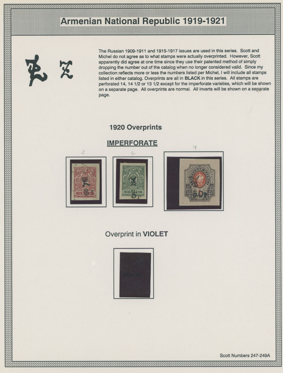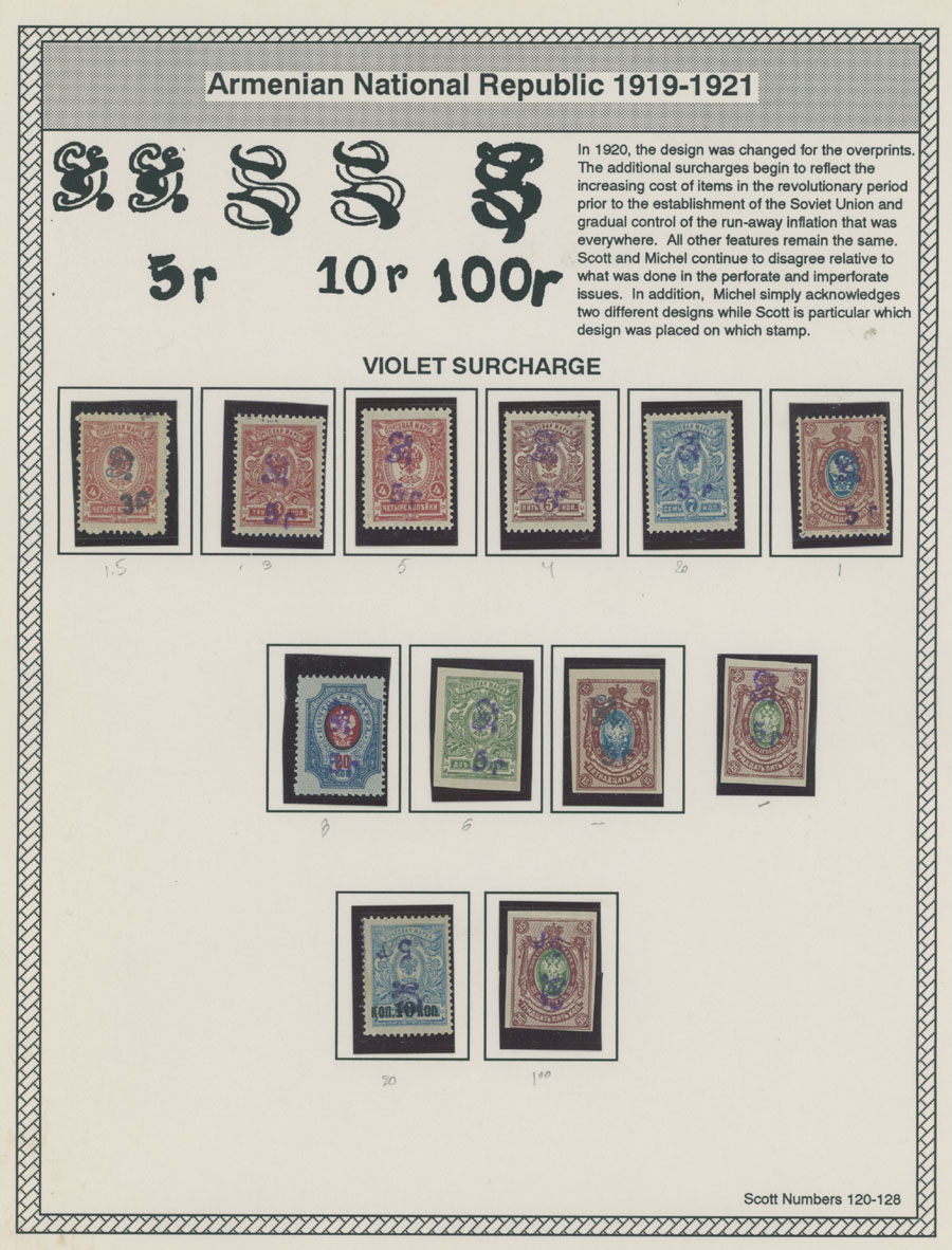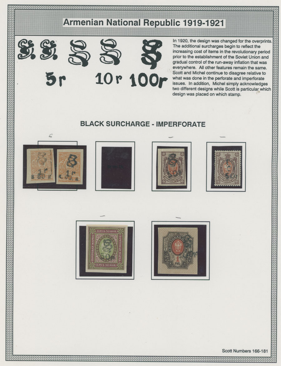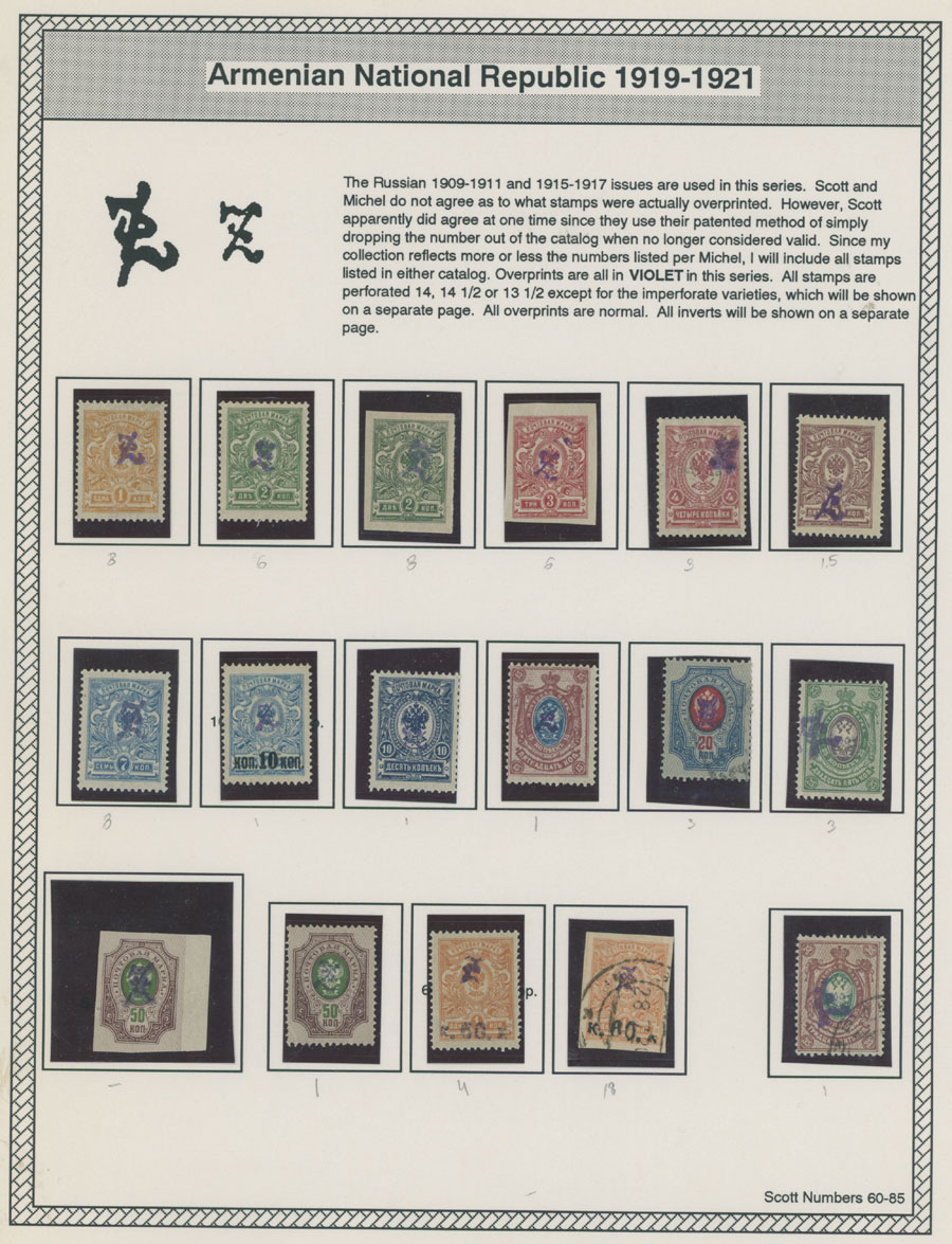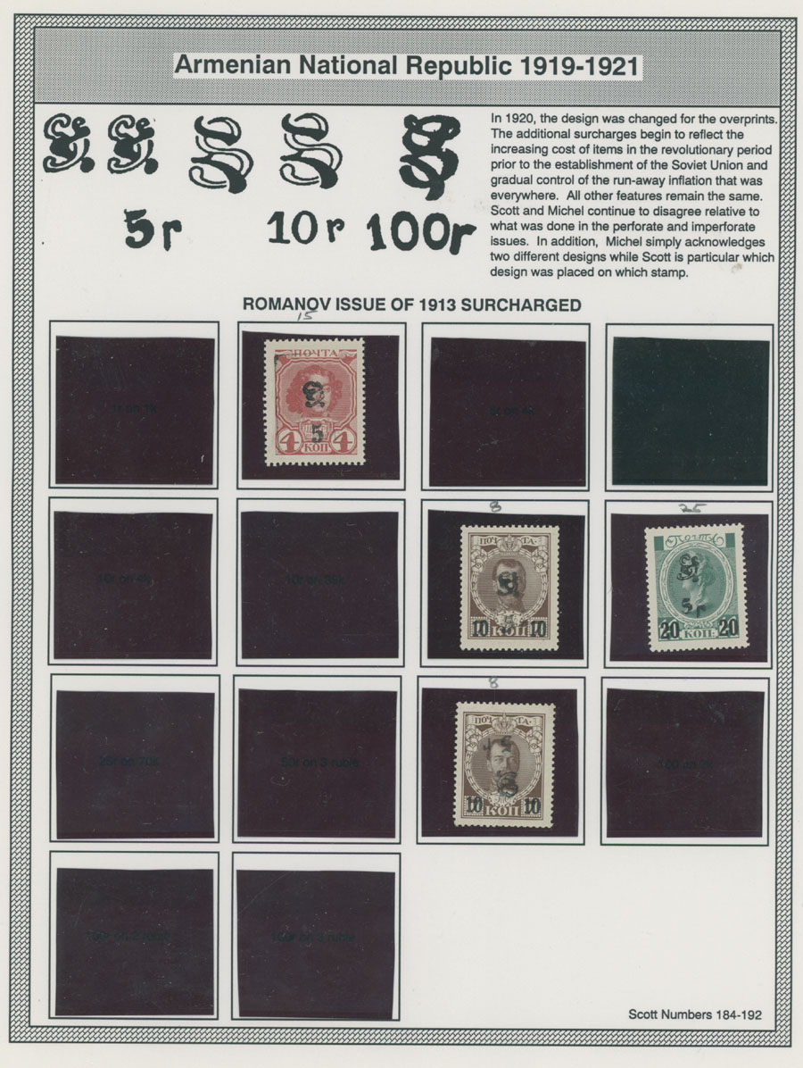 COLLECTION ON HOMEMADE WELL INSCRIBED PAGES: 1919-20, about 350 mostly mint stamps (25 – used), including 31 stamps are not listed in Scott (some listed in Artar); the Collection starts with framed and unframed ”Z” overprints in violet or black on perforated and imperforate Russian Imperial stamps, then direct Monogram surcharges and surcharges over unframed and framed ”Z” overprints, including questionable revaluations of Romanov Dynasty and World War I Charity stamps; the total is about 120 inverted or double overprints, about 10% overprints/surcharges look dubious, however nice unit, full/part of OG or used, F/VF, legitimate C.v. is over $5,000, Est. $1,500-$2,000, Scott #1/265, var