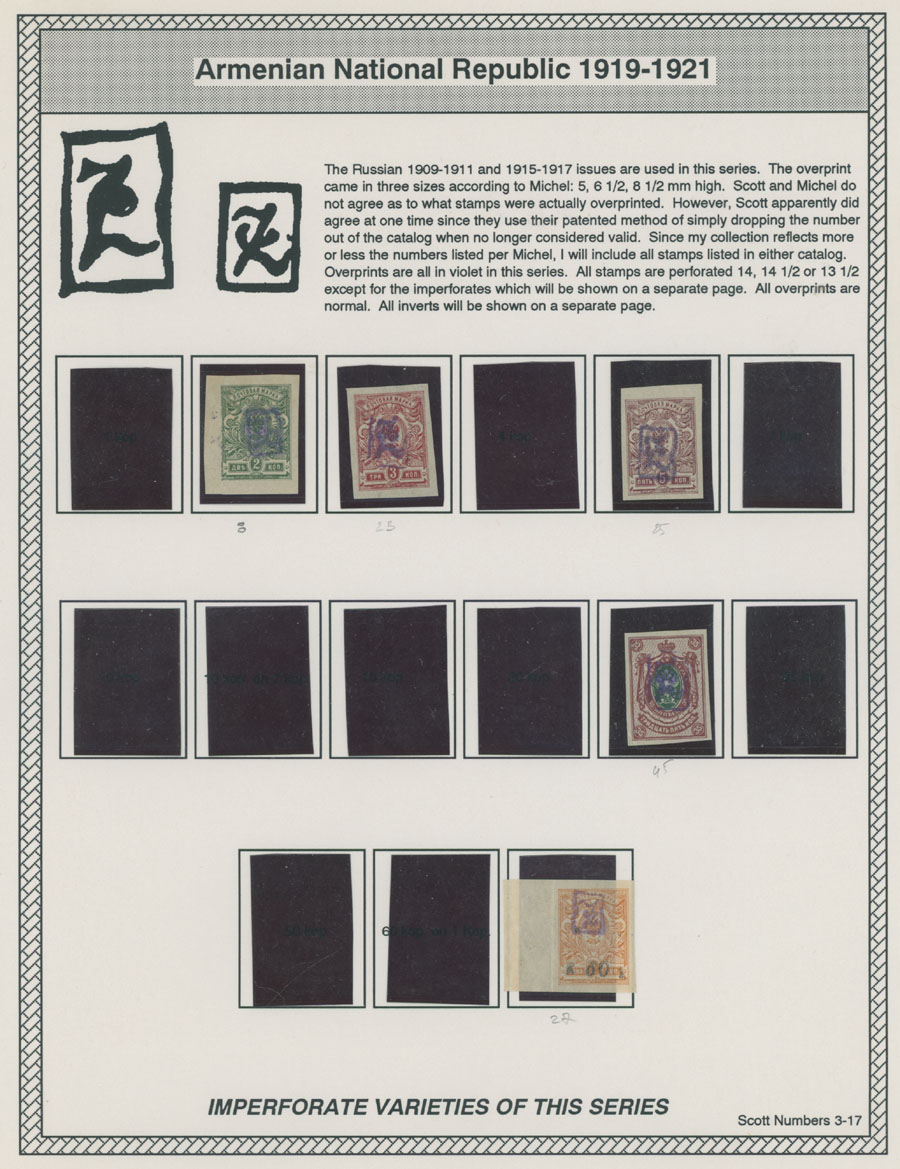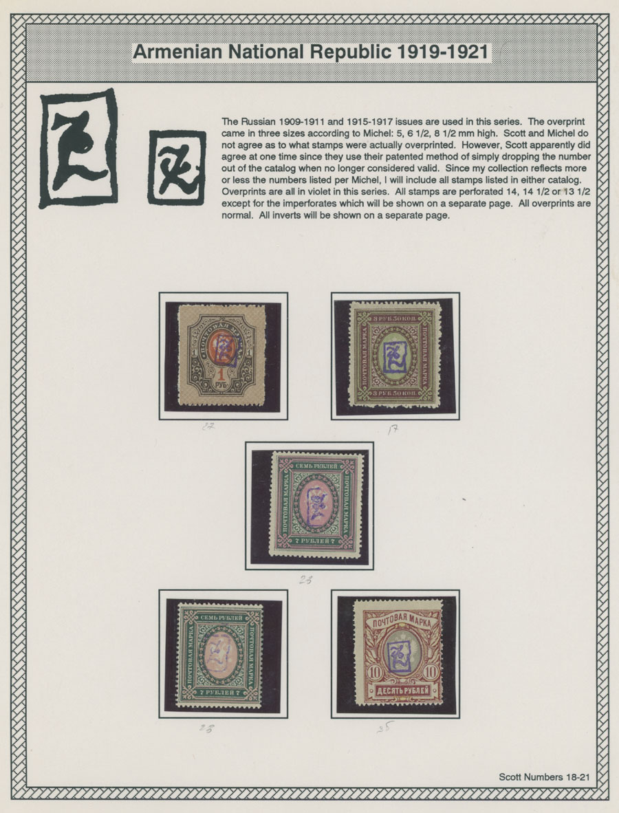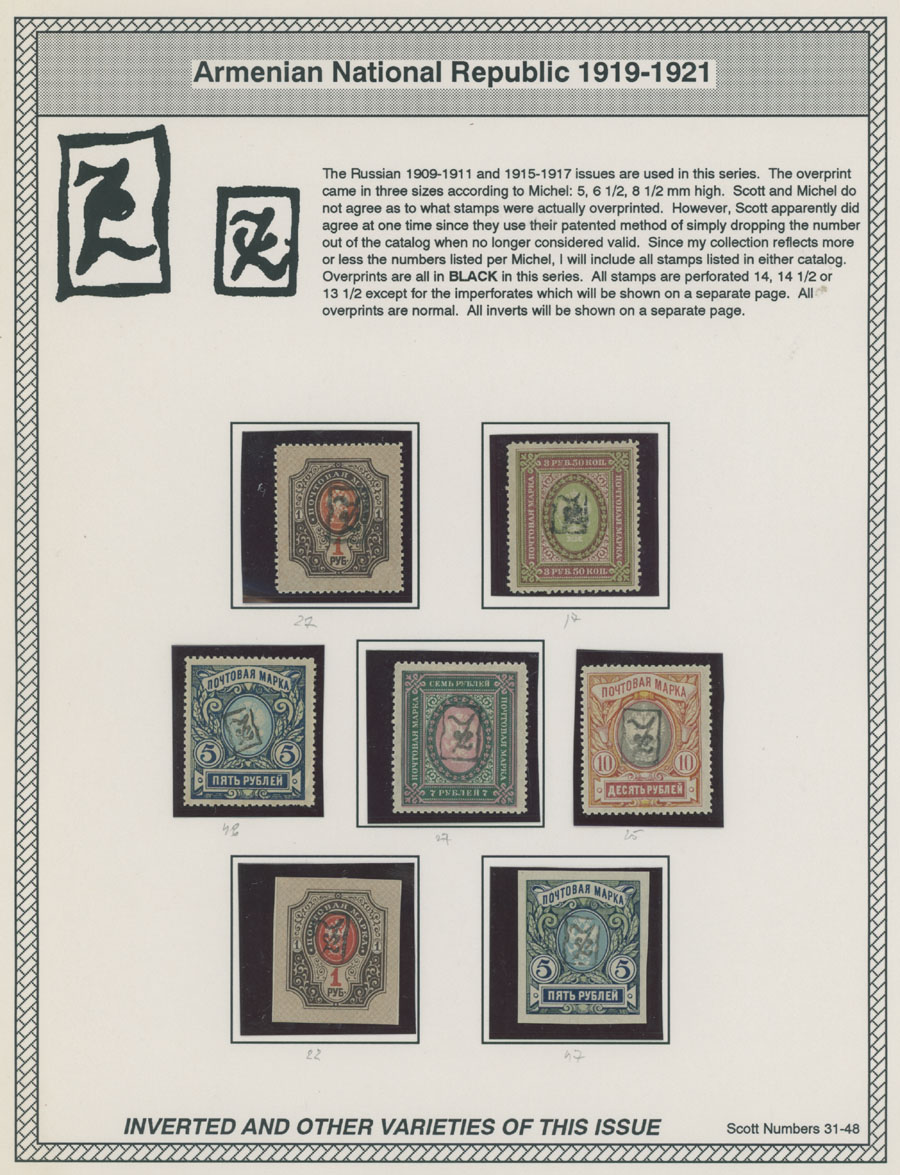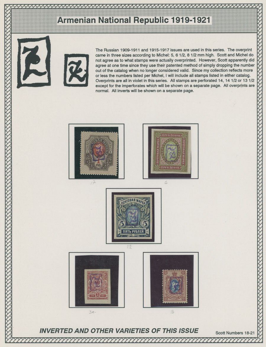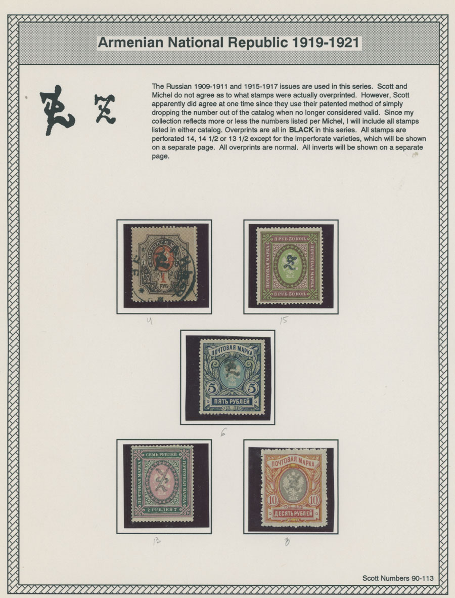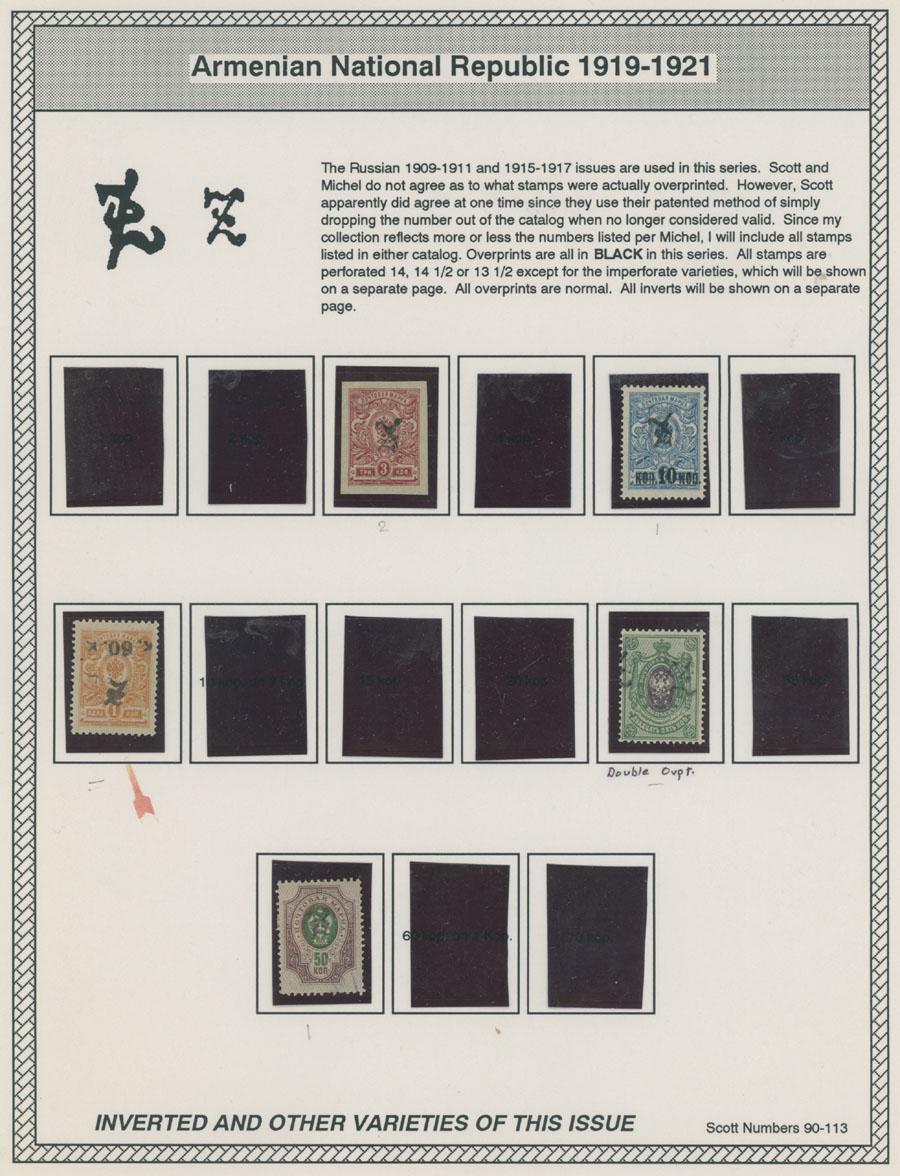 COLLECTION ON HOMEMADE WELL INSCRIBED PAGES: 1919-20, about 350 mostly mint stamps (25 – used), including 31 stamps are not listed in Scott (some listed in Artar); the Collection starts with framed and unframed ”Z” overprints in violet or black on perforated and imperforate Russian Imperial stamps, then direct Monogram surcharges and surcharges over unframed and framed ”Z” overprints, including questionable revaluations of Romanov Dynasty and World War I Charity stamps; the total is about 120 inverted or double overprints, about 10% overprints/surcharges look dubious, however nice unit, full/part of OG or used, F/VF, legitimate C.v. is over $5,000, Est. $1,500-$2,000, Scott #1/265, var