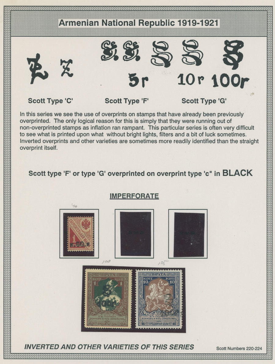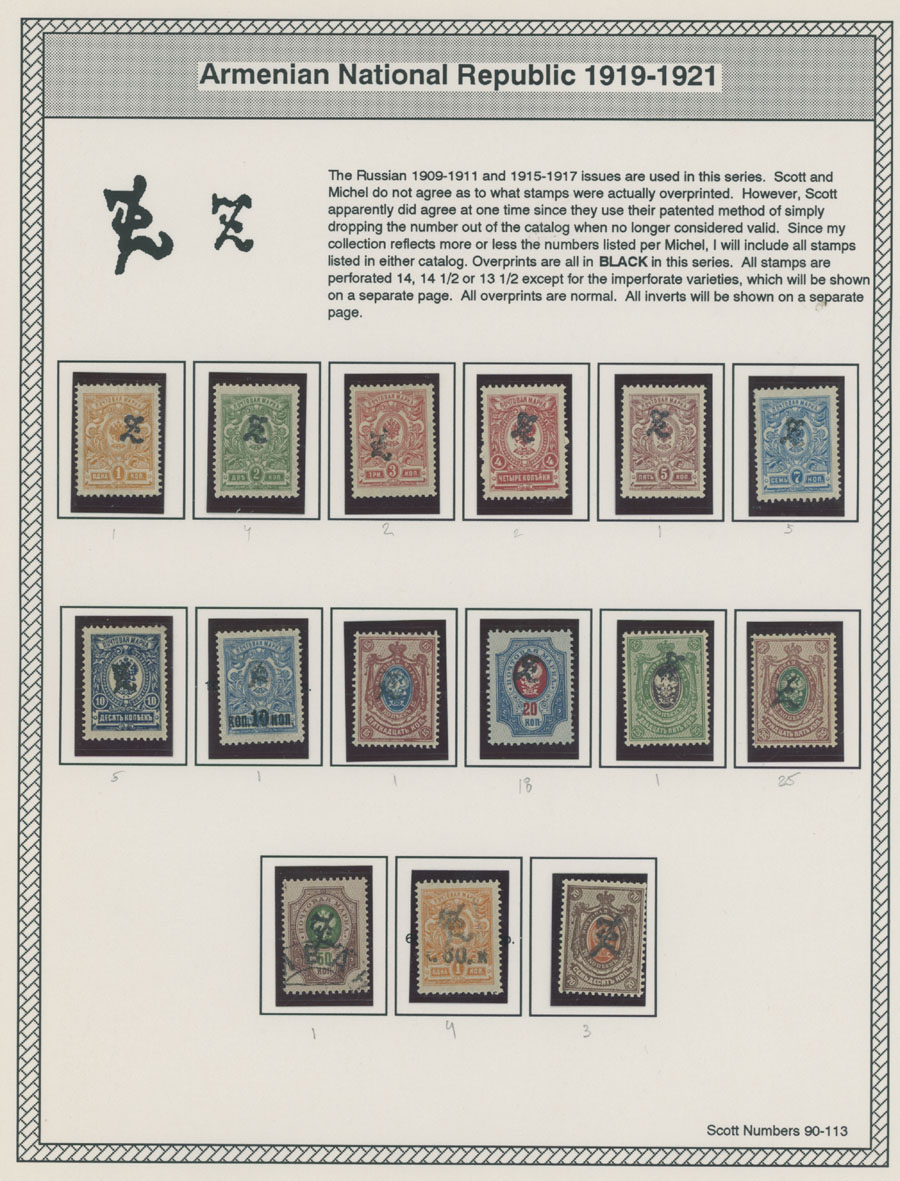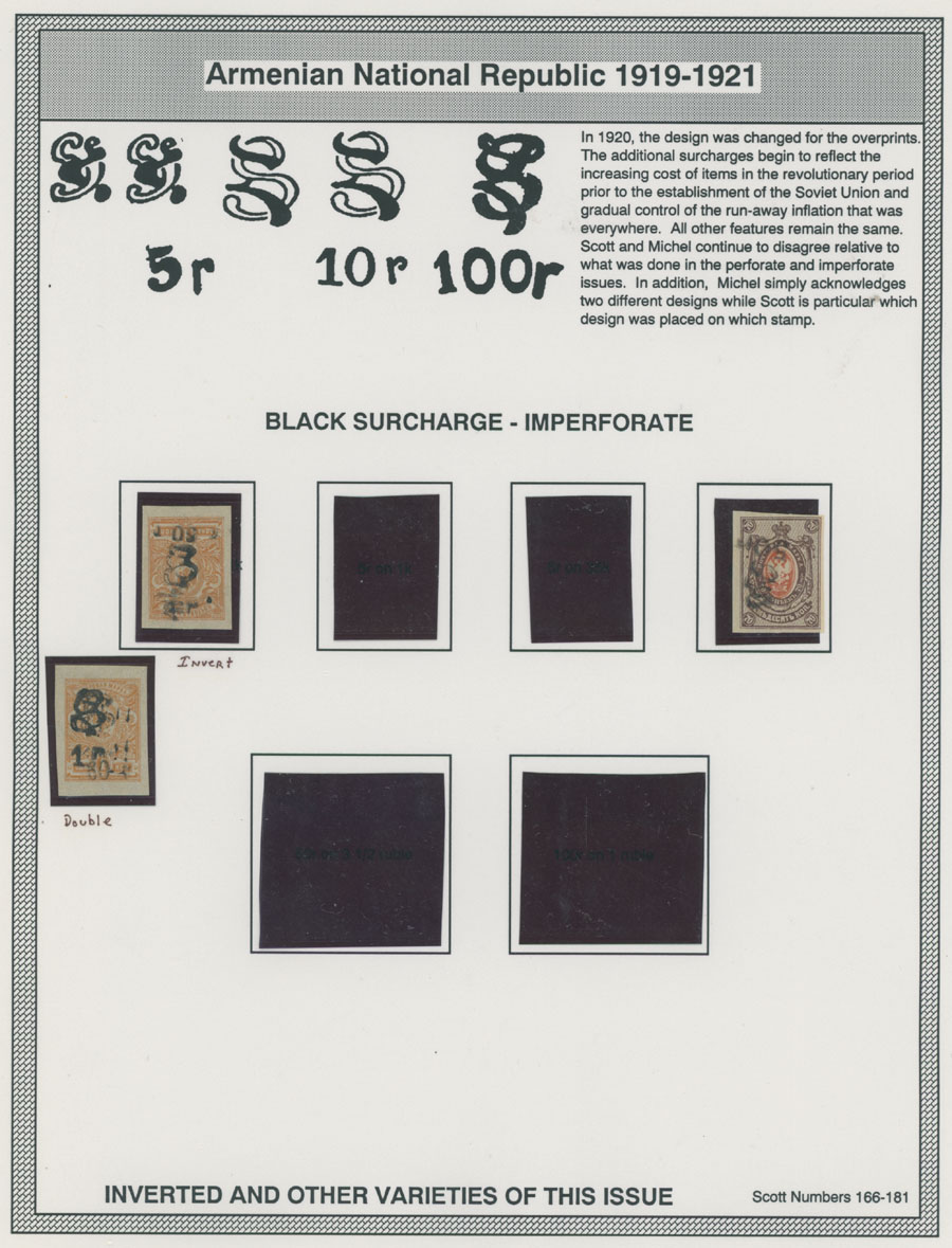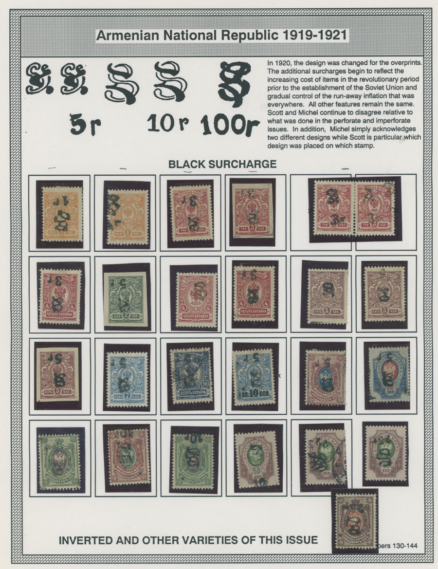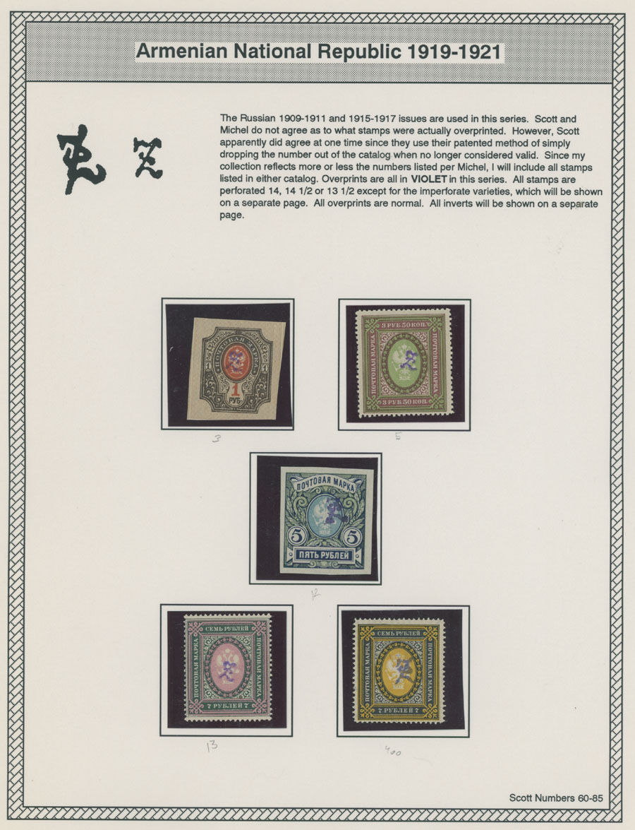 COLLECTION ON HOMEMADE WELL INSCRIBED PAGES: 1919-20, about 350 mostly mint stamps (25 – used), including 31 stamps are not listed in Scott (some listed in Artar); the Collection starts with framed and unframed ”Z” overprints in violet or black on perforated and imperforate Russian Imperial stamps, then direct Monogram surcharges and surcharges over unframed and framed ”Z” overprints, including questionable revaluations of Romanov Dynasty and World War I Charity stamps; the total is about 120 inverted or double overprints, about 10% overprints/surcharges look dubious, however nice unit, full/part of OG or used, F/VF, legitimate C.v. is over $5,000, Est. $1,500-$2,000, Scott #1/265, var
