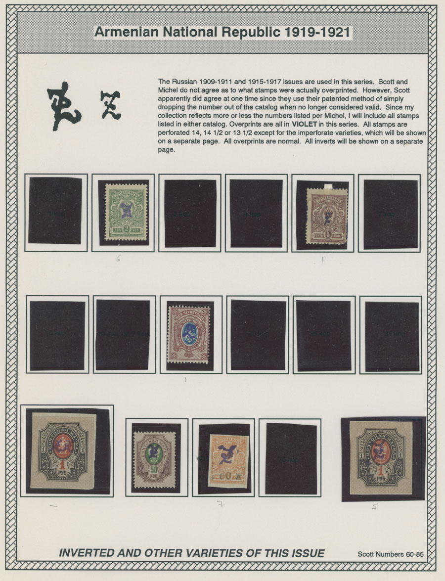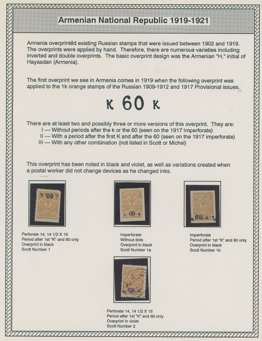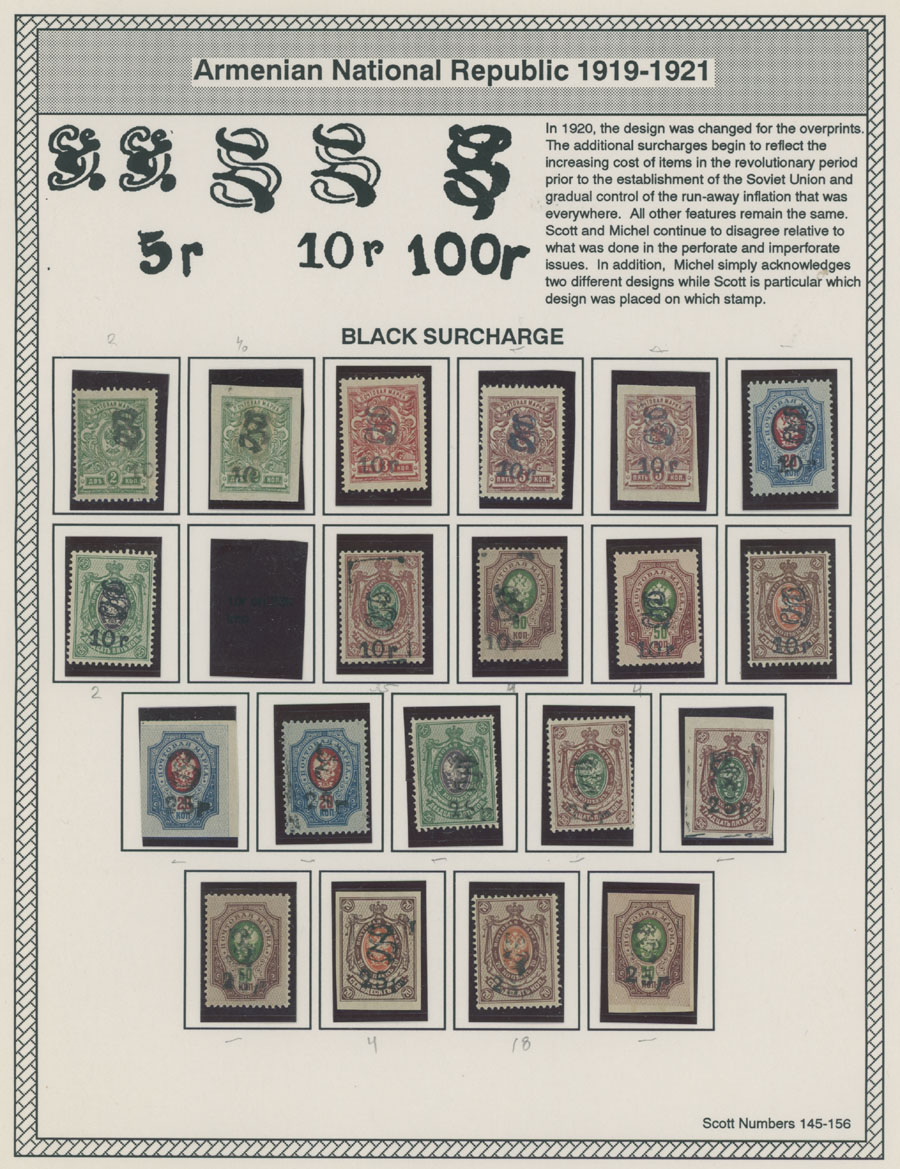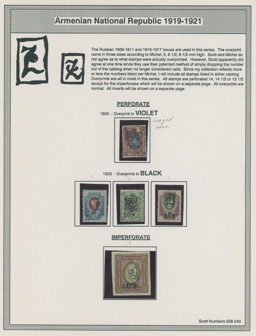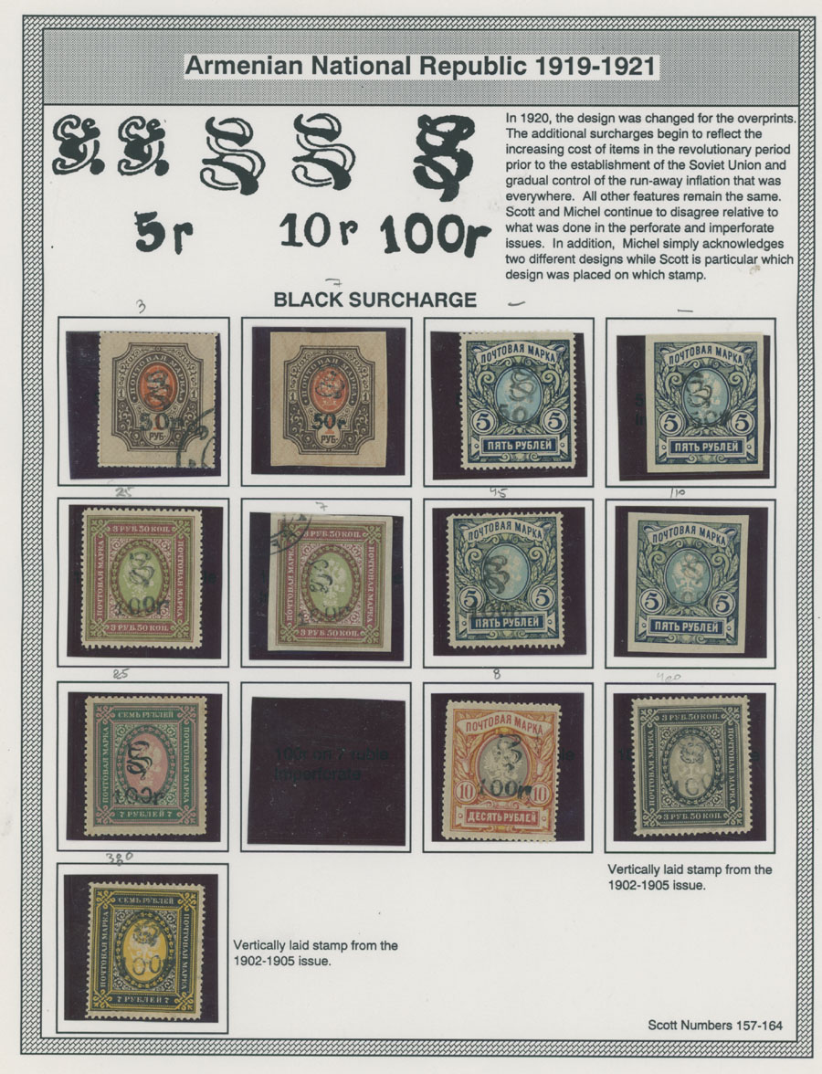 COLLECTION ON HOMEMADE WELL INSCRIBED PAGES: 1919-20, about 350 mostly mint stamps (25 – used), including 31 stamps are not listed in Scott (some listed in Artar); the Collection starts with framed and unframed ”Z” overprints in violet or black on perforated and imperforate Russian Imperial stamps, then direct Monogram surcharges and surcharges over unframed and framed ”Z” overprints, including questionable revaluations of Romanov Dynasty and World War I Charity stamps; the total is about 120 inverted or double overprints, about 10% overprints/surcharges look dubious, however nice unit, full/part of OG or used, F/VF, legitimate C.v. is over $5,000, Est. $1,500-$2,000, Scott #1/265, var