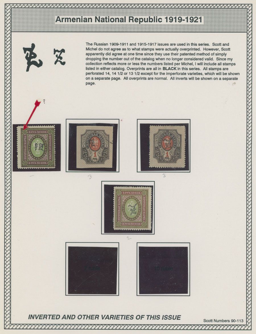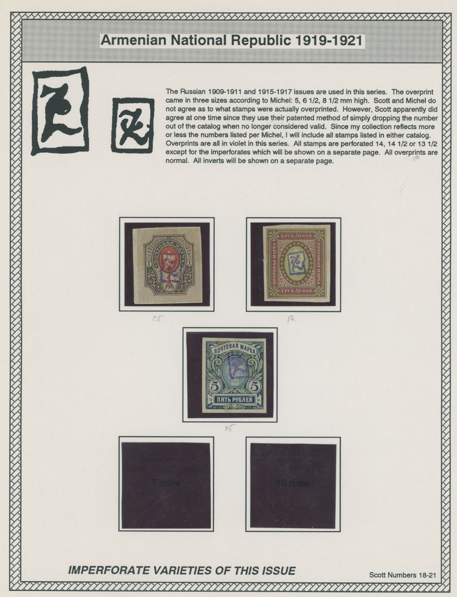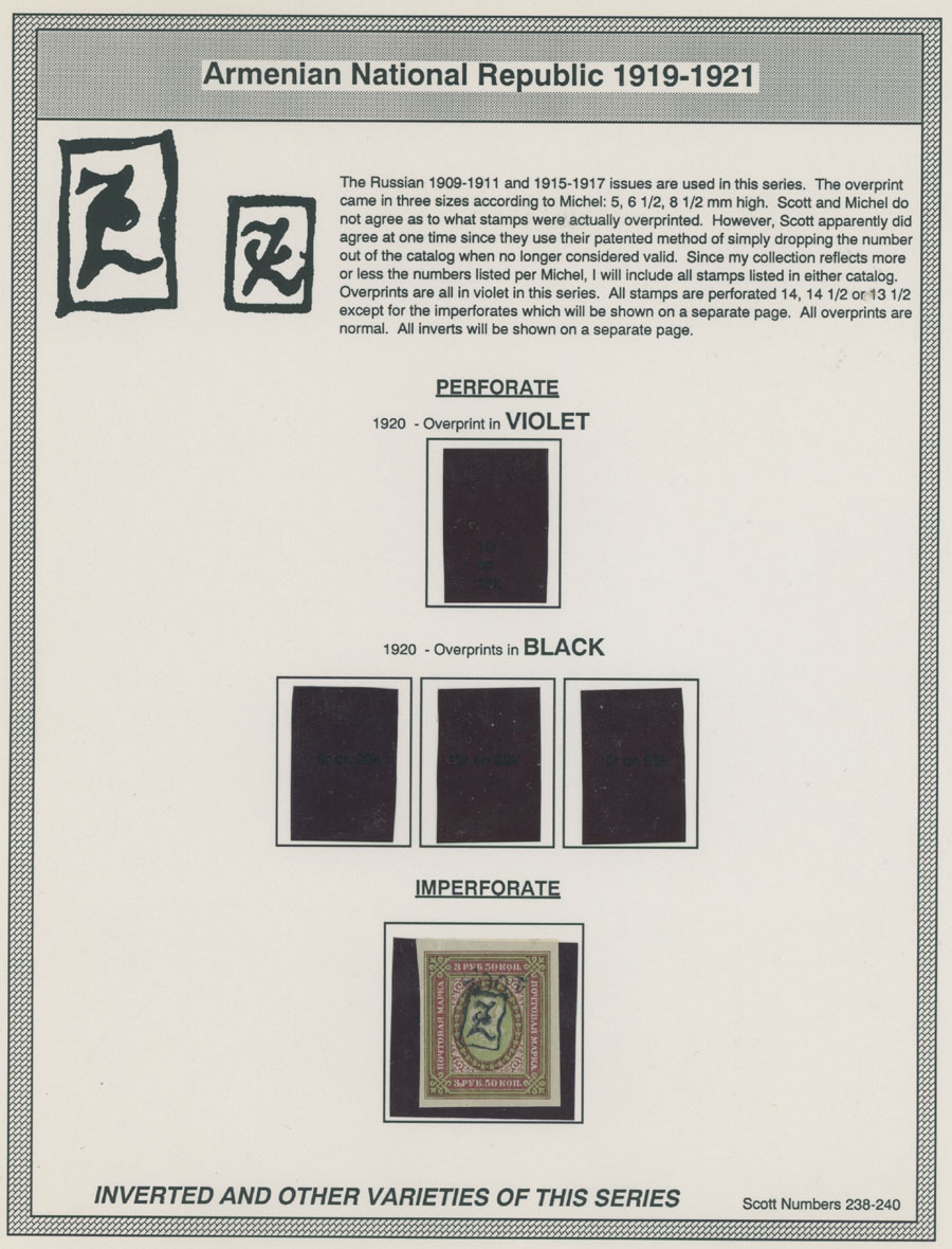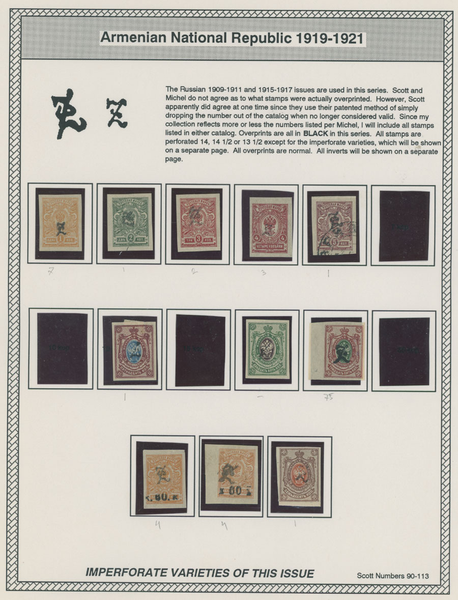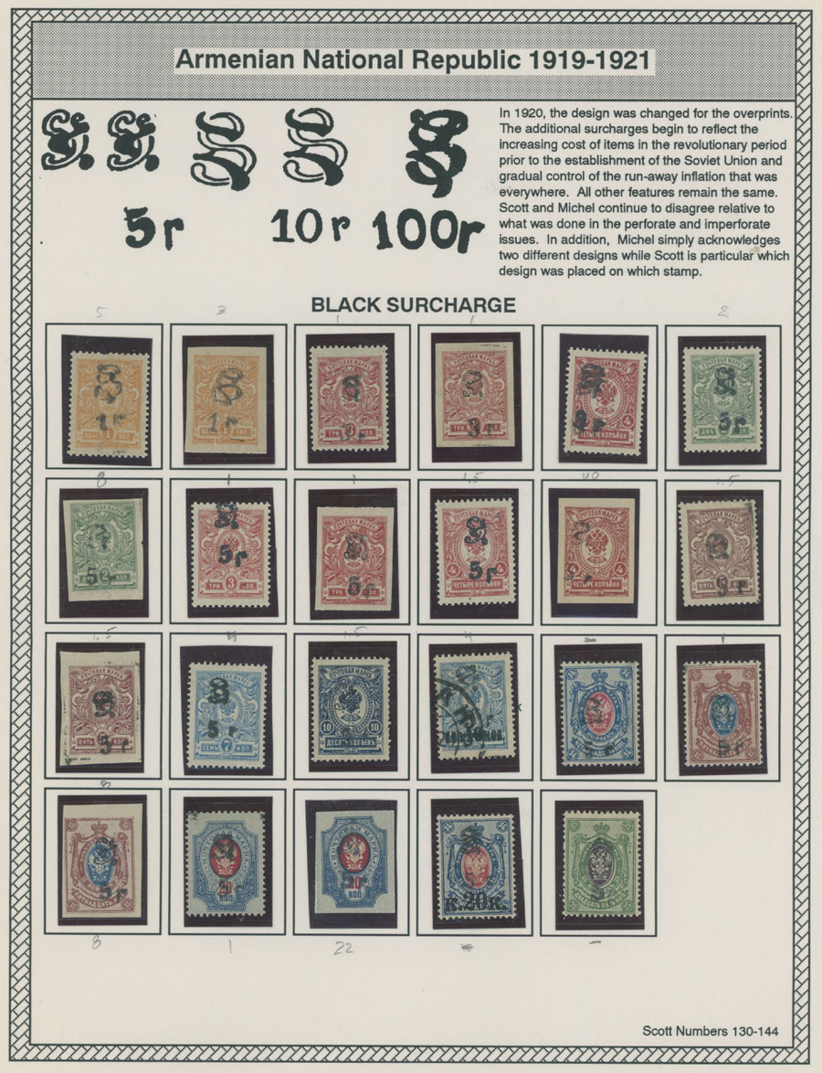 COLLECTION ON HOMEMADE WELL INSCRIBED PAGES: 1919-20, about 350 mostly mint stamps (25 – used), including 31 stamps are not listed in Scott (some listed in Artar); the Collection starts with framed and unframed ”Z” overprints in violet or black on perforated and imperforate Russian Imperial stamps, then direct Monogram surcharges and surcharges over unframed and framed ”Z” overprints, including questionable revaluations of Romanov Dynasty and World War I Charity stamps; the total is about 120 inverted or double overprints, about 10% overprints/surcharges look dubious, however nice unit, full/part of OG or used, F/VF, legitimate C.v. is over $5,000, Est. $1,500-$2,000, Scott #1/265, var