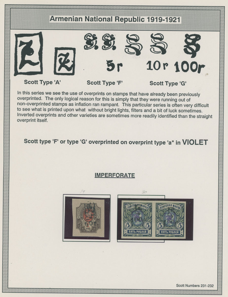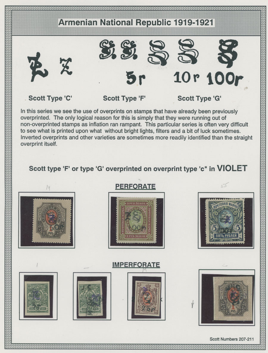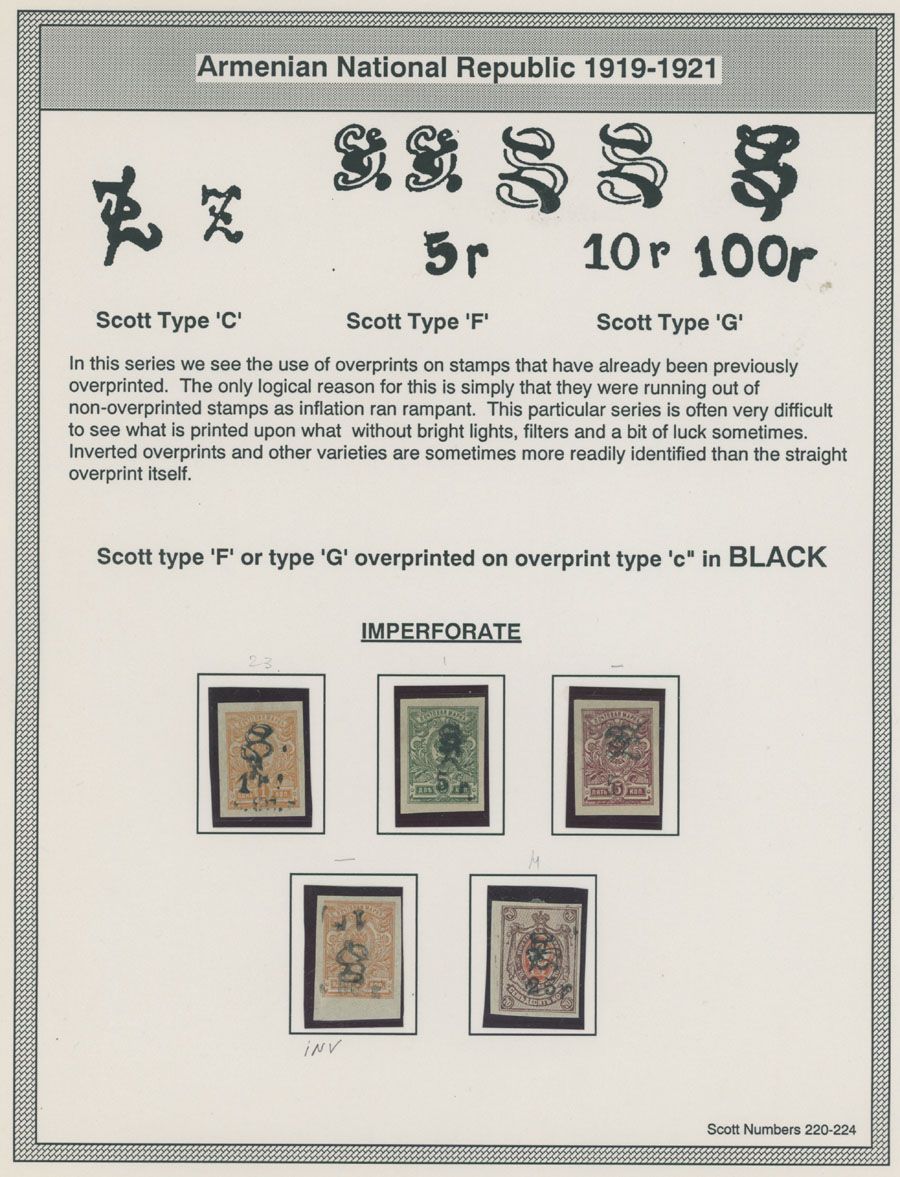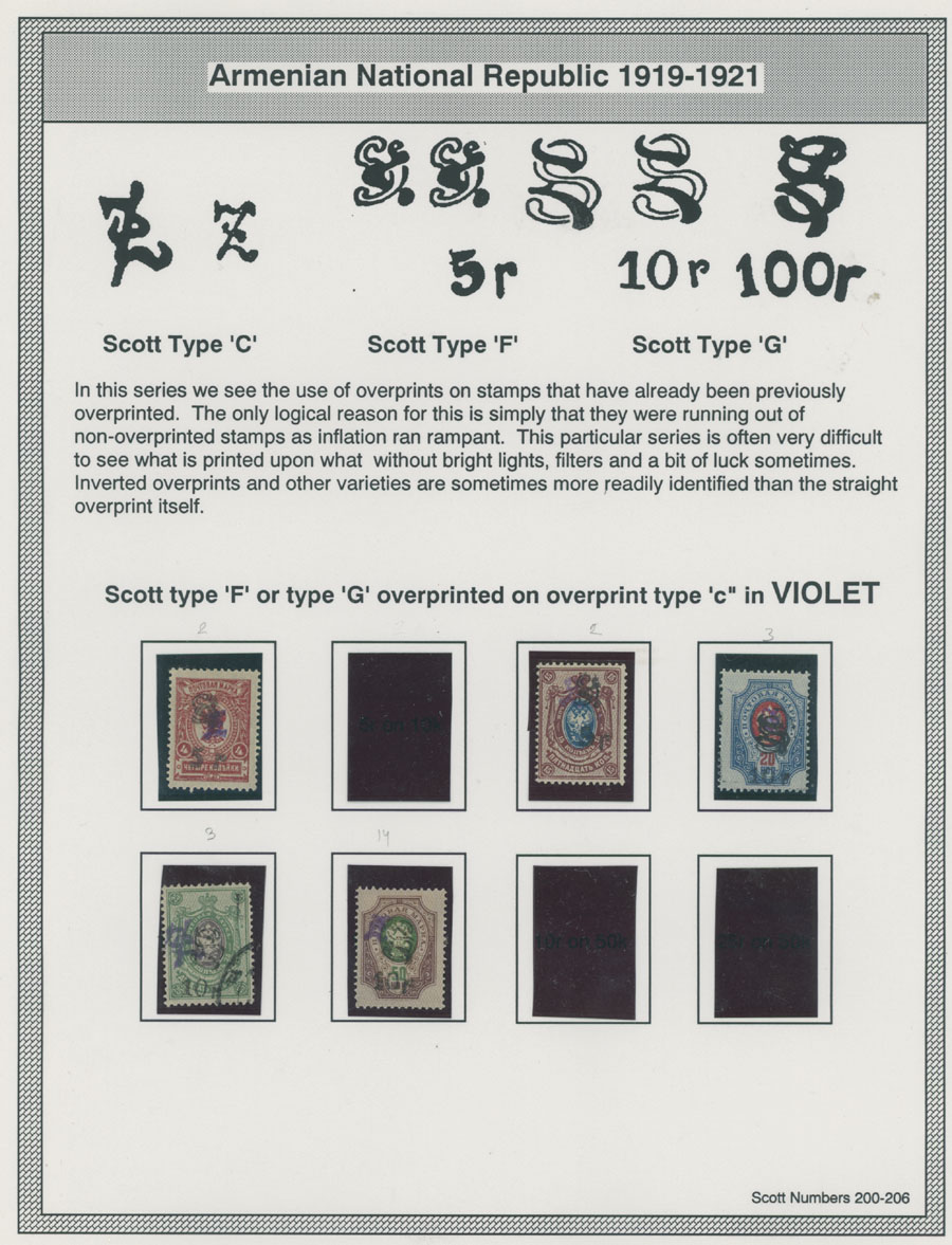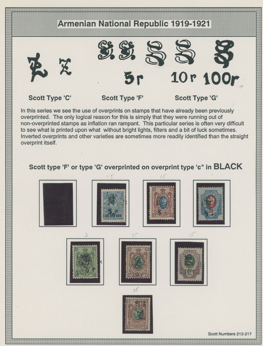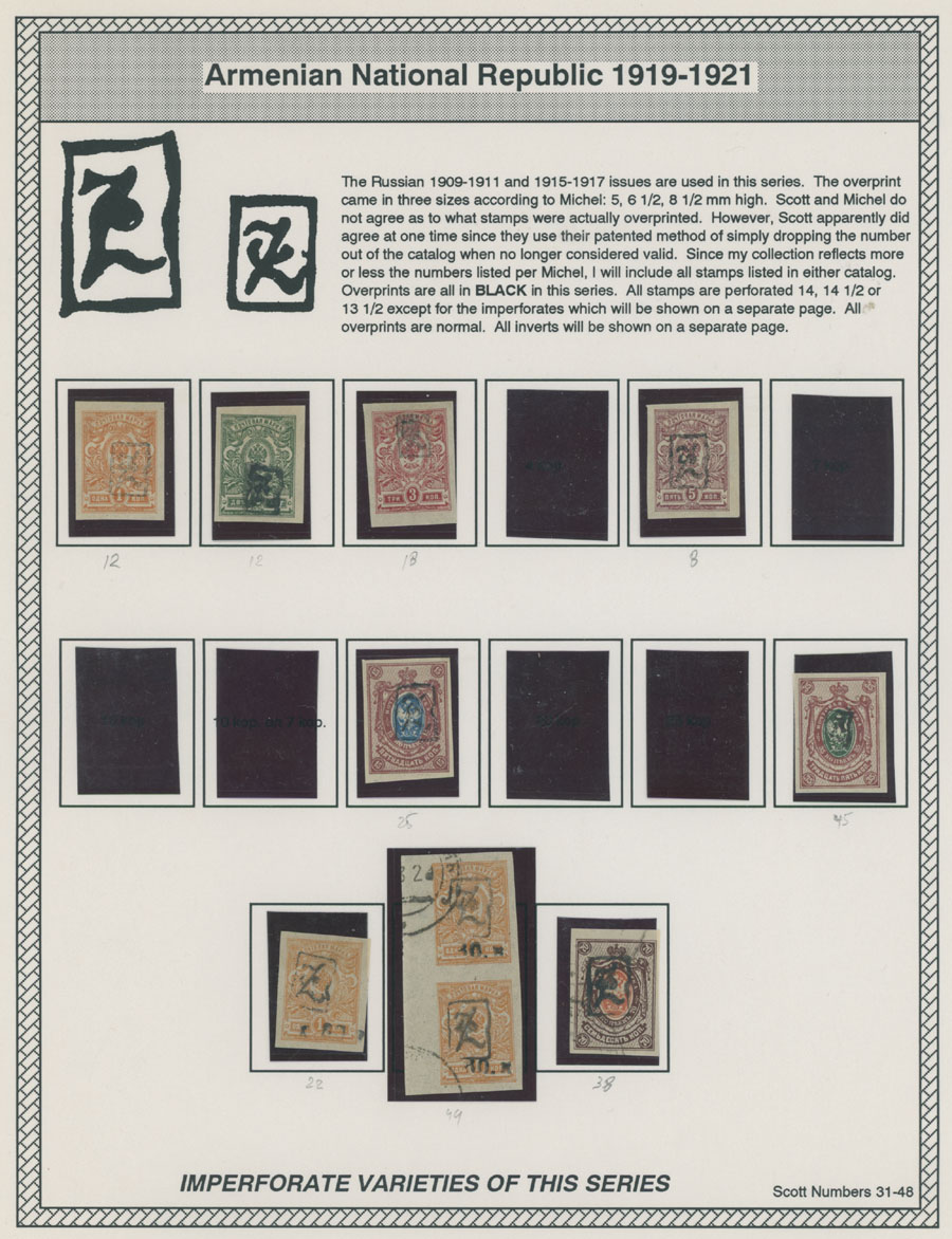COLLECTION ON HOMEMADE WELL INSCRIBED PAGES: 1919-20, about 350 mostly mint stamps (25 – used), including 31 stamps are not listed in Scott (some listed in Artar); the Collection starts with framed and unframed ”Z” overprints in violet or black on perforated and imperforate Russian Imperial stamps, then direct Monogram surcharges and surcharges over unframed and framed ”Z” overprints, including questionable revaluations of Romanov Dynasty and World War I Charity stamps; the total is about 120 inverted or double overprints, about 10% overprints/surcharges look dubious, however nice unit, full/part of OG or used, F/VF, legitimate C.v. is over $5,000, Est. $1,500-$2,000, Scott #1/265, var