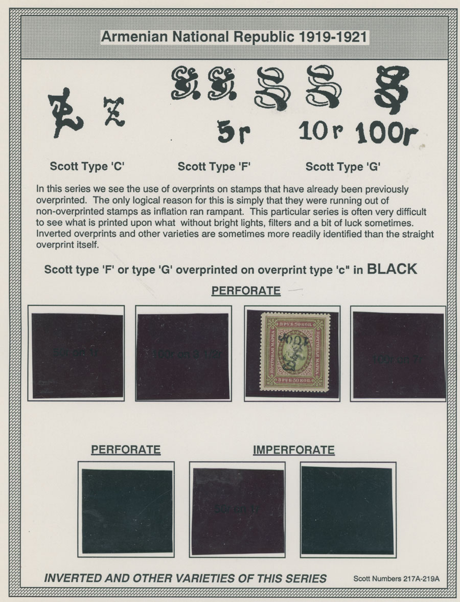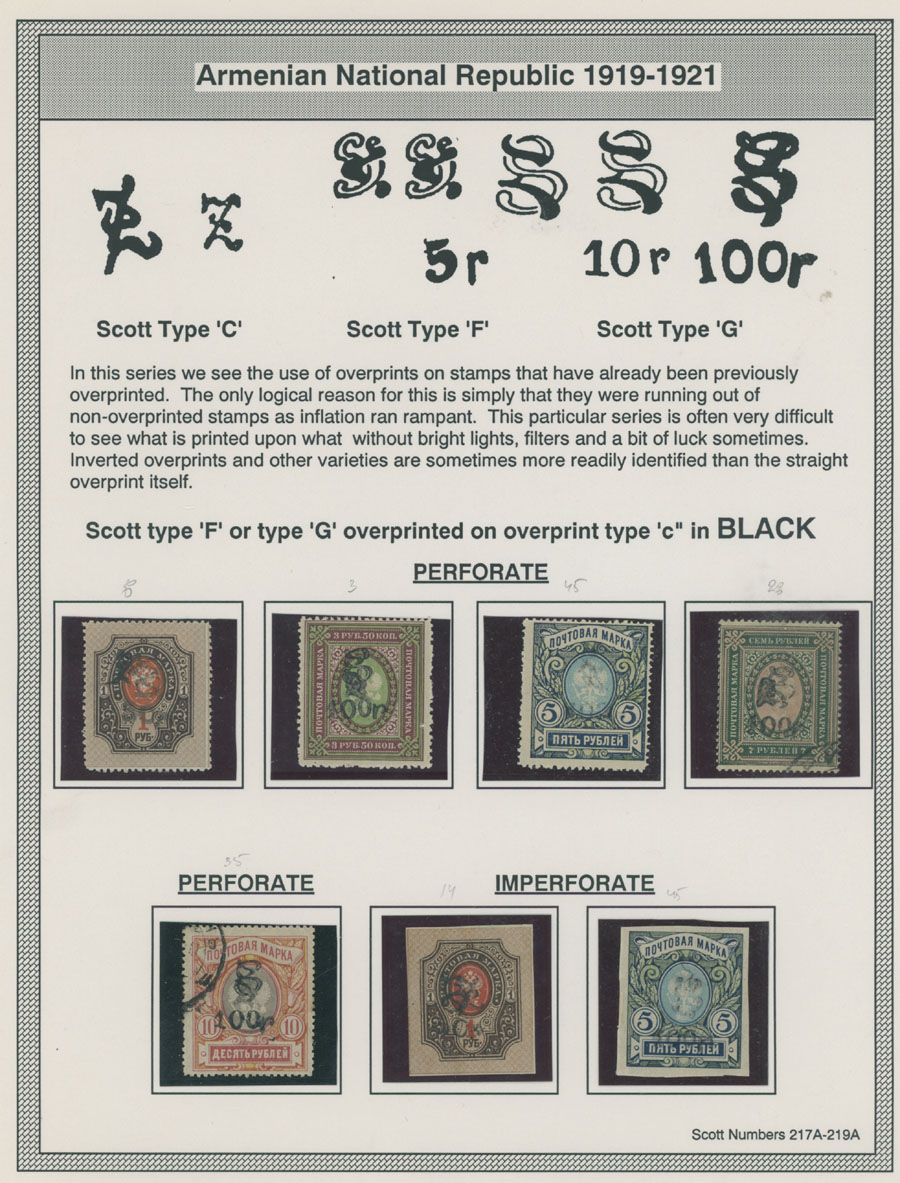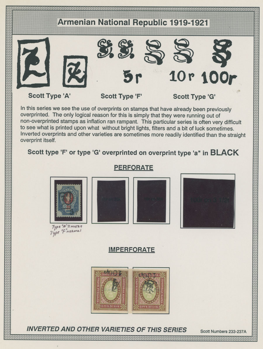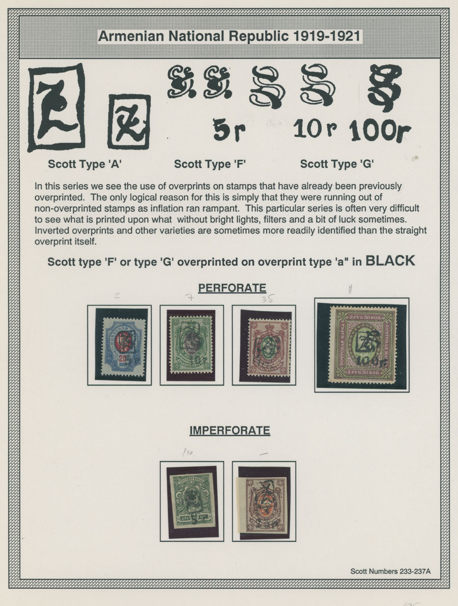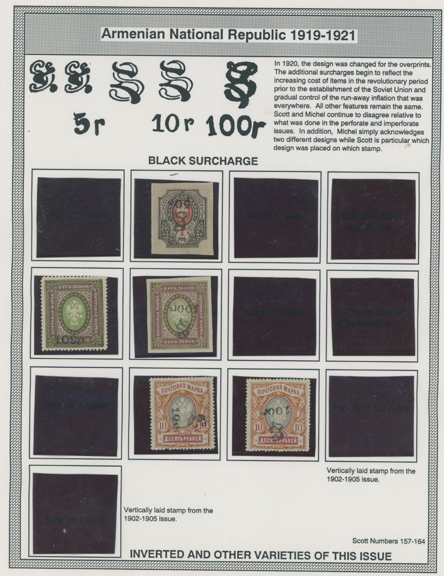 COLLECTION ON HOMEMADE WELL INSCRIBED PAGES: 1919-20, about 350 mostly mint stamps (25 – used), including 31 stamps are not listed in Scott (some listed in Artar); the Collection starts with framed and unframed ”Z” overprints in violet or black on perforated and imperforate Russian Imperial stamps, then direct Monogram surcharges and surcharges over unframed and framed ”Z” overprints, including questionable revaluations of Romanov Dynasty and World War I Charity stamps; the total is about 120 inverted or double overprints, about 10% overprints/surcharges look dubious, however nice unit, full/part of OG or used, F/VF, legitimate C.v. is over $5,000, Est. $1,500-$2,000, Scott #1/265, var