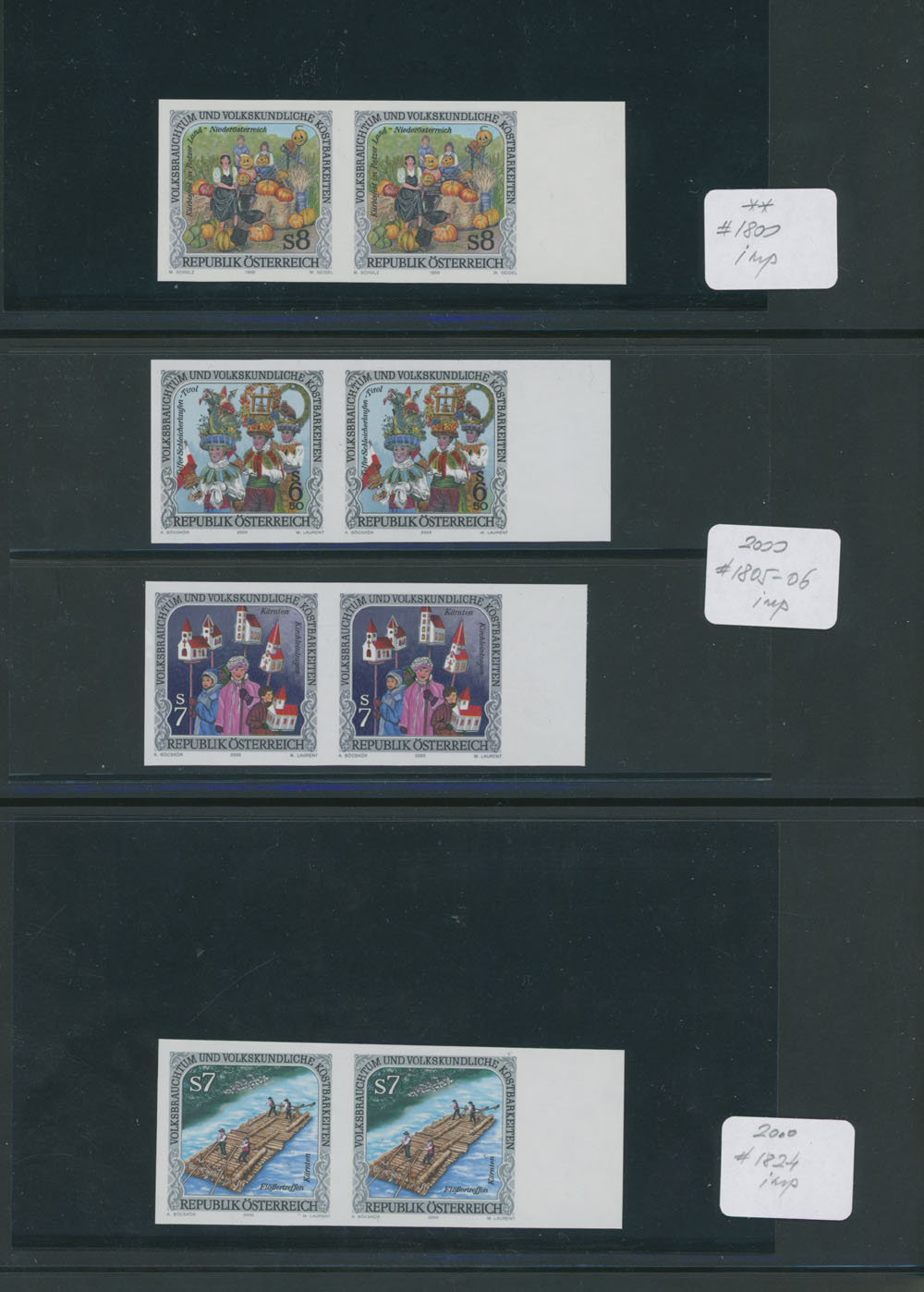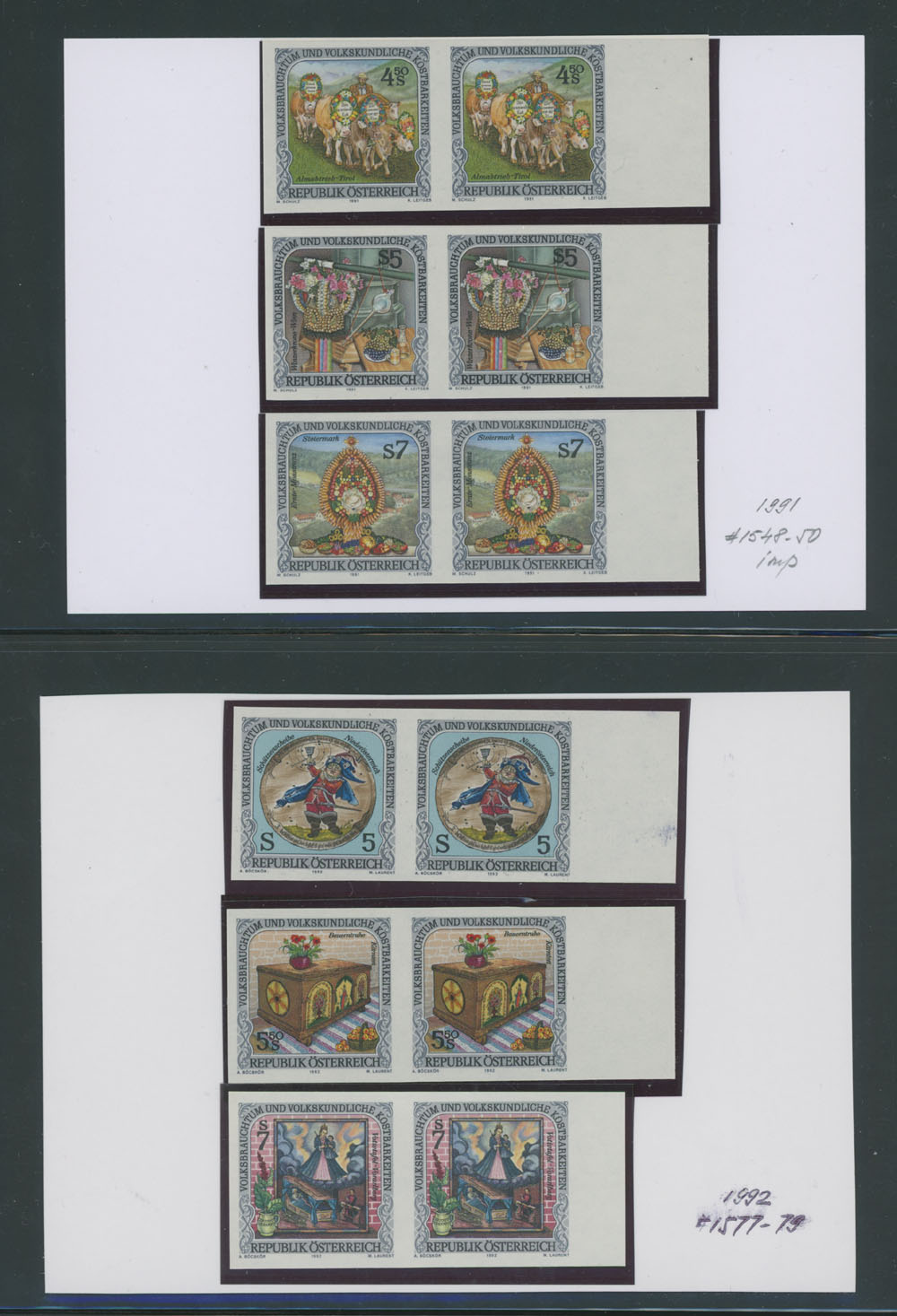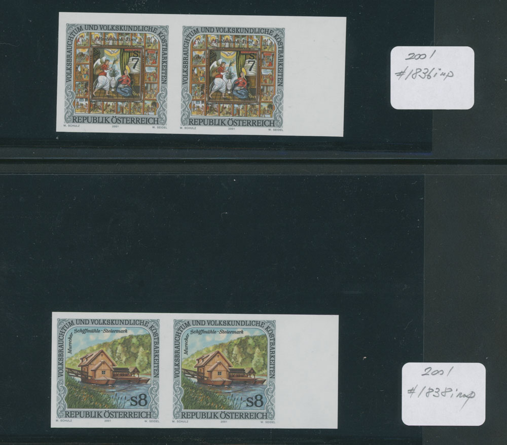 FOLKS FESTIVAL – GROUP OF IMPERFORATE PAIRS: 1991-2002, Local Celebrations, Parades and Performances, 25 mostly sheet margin pairs, representing 15 complete issues, neatly arranged on stockpages, full OG, NH, VF and very rare assemblage, normally they are priced about €1,500 per a single stamp, e.g. retail value all of those is approximately €75,000, Est. $12,000-$15,000, Scott #1548/838 imp