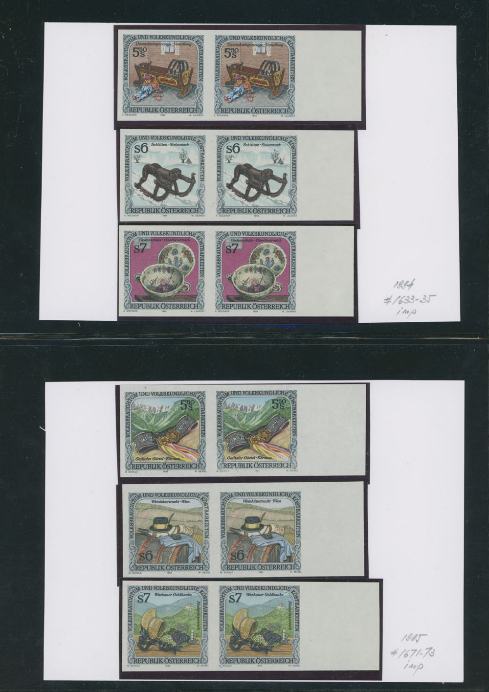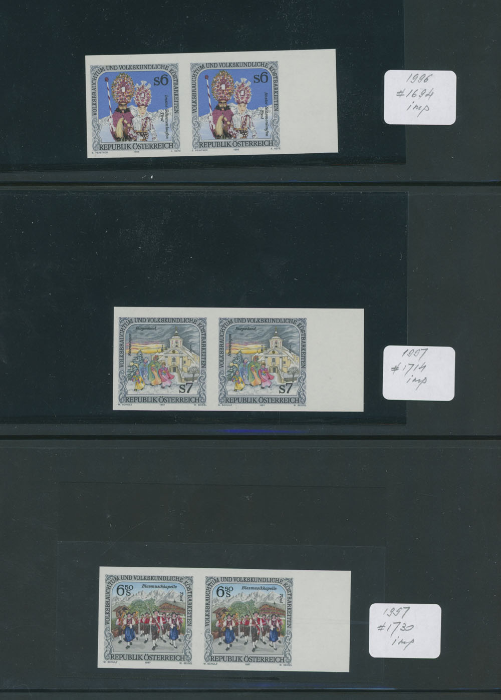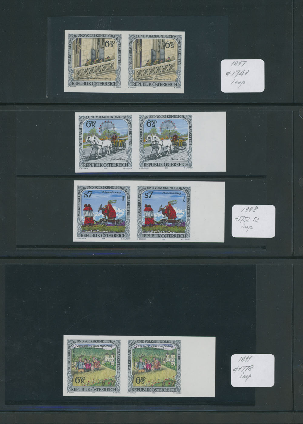 FOLKS FESTIVAL – GROUP OF IMPERFORATE PAIRS: 1991-2002, Local Celebrations, Parades and Performances, 25 mostly sheet margin pairs, representing 15 complete issues, neatly arranged on stockpages, full OG, NH, VF and very rare assemblage, normally they are priced about €1,500 per a single stamp, e.g. retail value all of those is approximately €75,000, Est. $12,000-$15,000, Scott #1548/838 imp