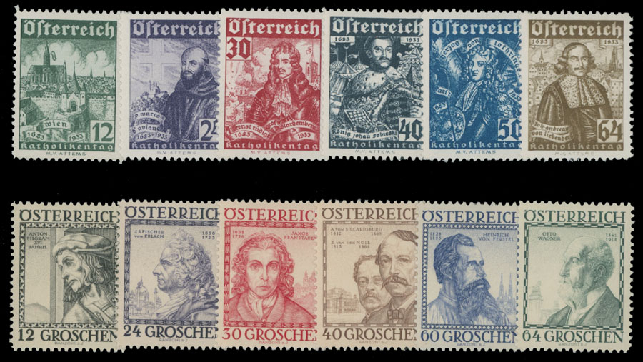 1933-34, Pan-German Catholic Congress and Architects, 12g-64g, two complete sets of six, full OG, NH, VF, C.v. $470, ANK #557-62, 591-96, C.v. €655, Est. $200-$250 , Scott #B112-17, B122-27