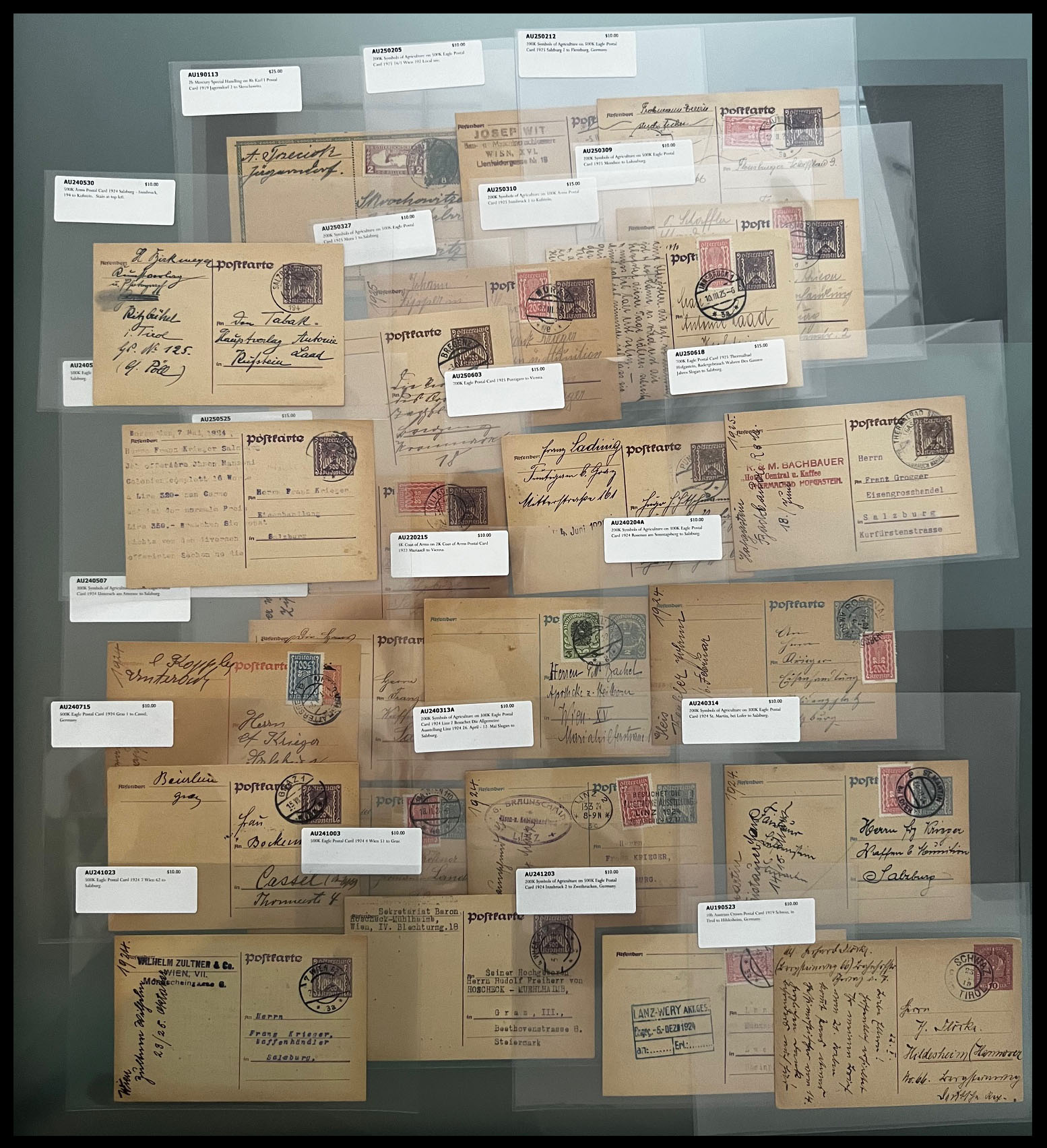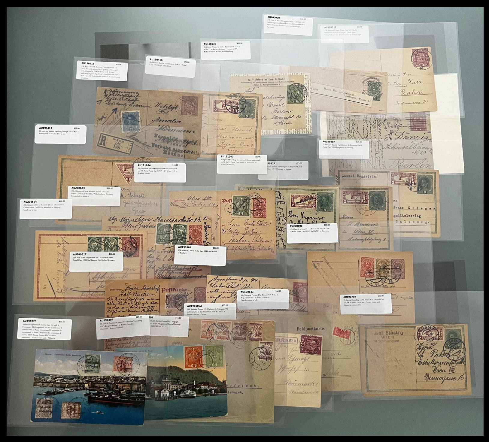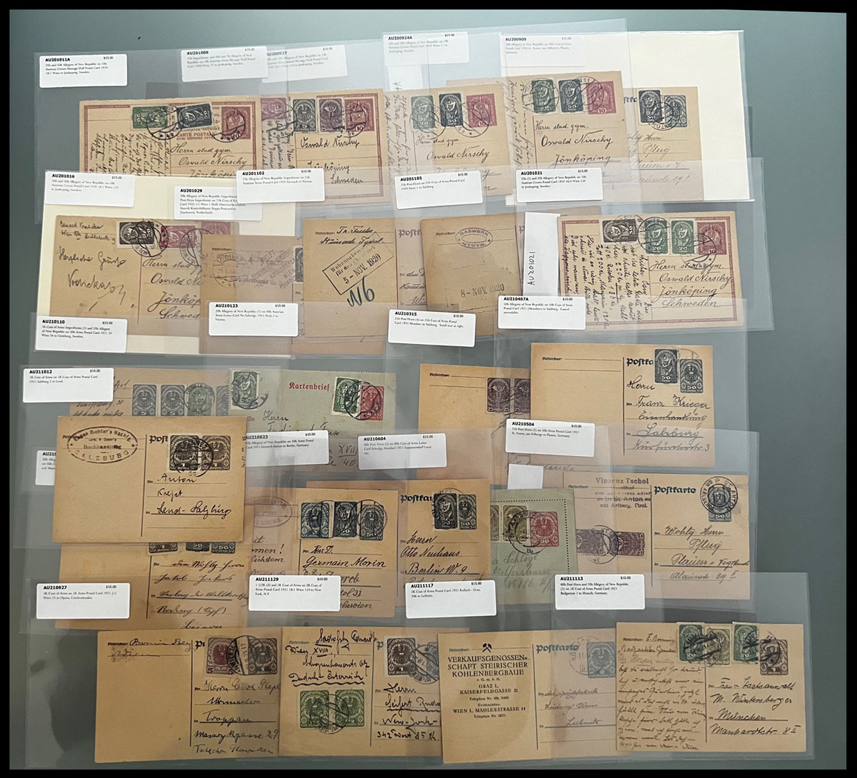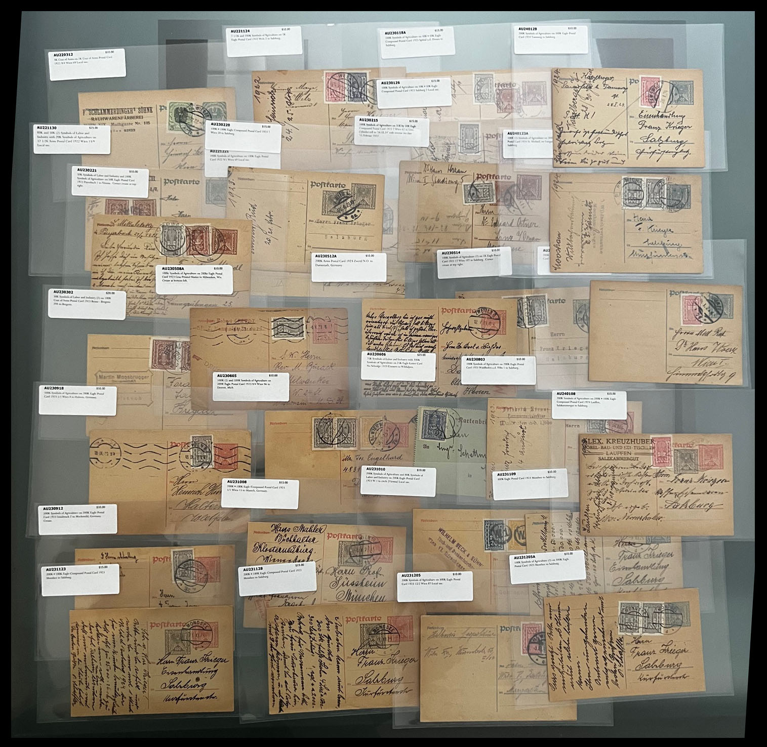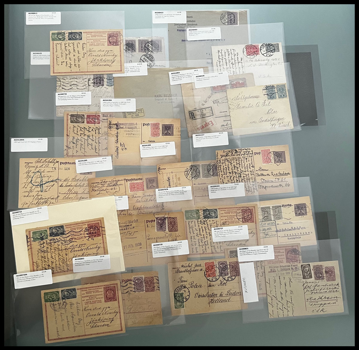 LARGE PRE-WORLD WAR II POSTAL HISTORY SELECTION IN A BOX: 1918-32, over 340 items with about 140 mostly uprated postal stationery cards and envelopes, each one is described in a dealer’s sleeve, many nicely franked items, several WW I occupation cards or covers, individually priced from $10 to $75, mainly addressed to Europe or USA, minor conveyance flaws possible, nevertheless nice unit, F/VF or better, approximate retail is about $5,000, Est. $1,000-$1,200
