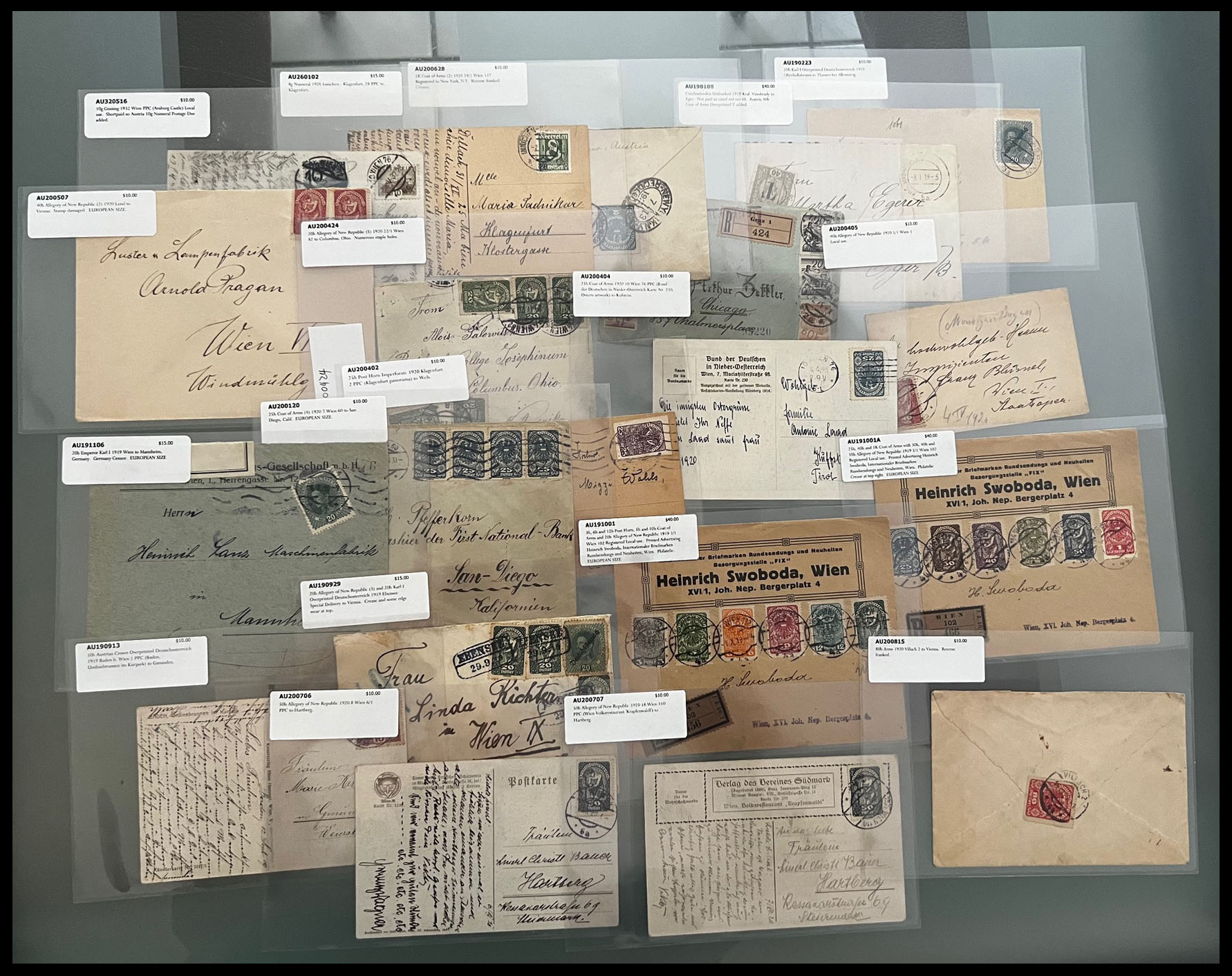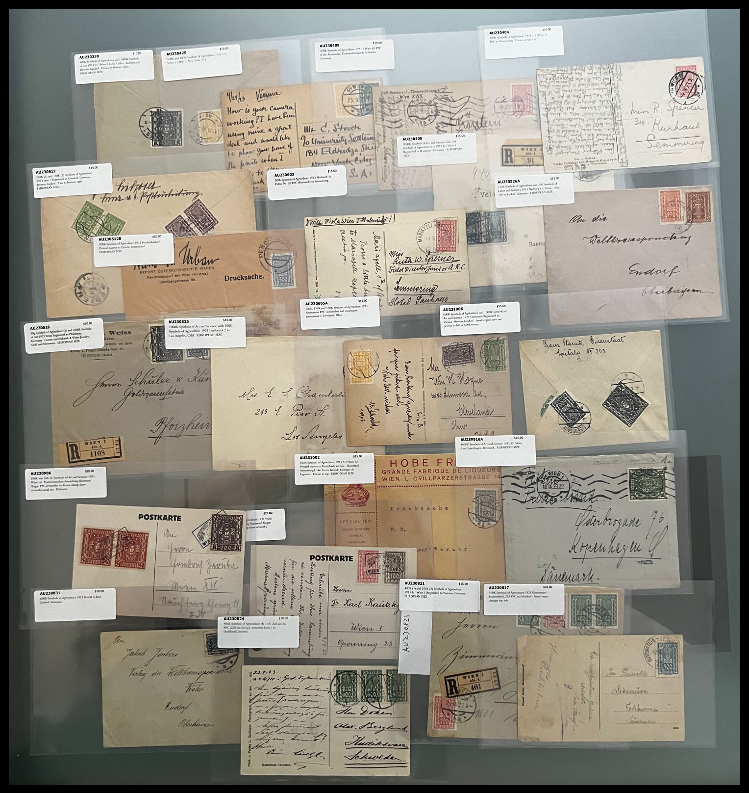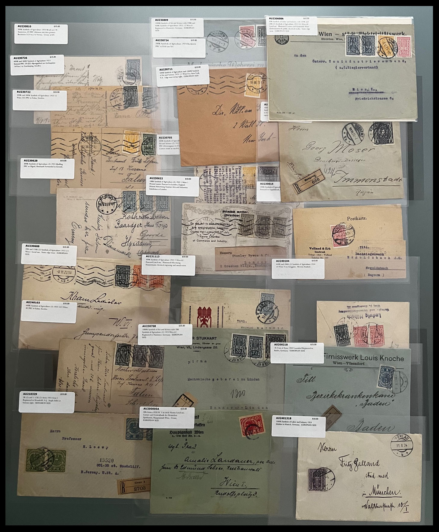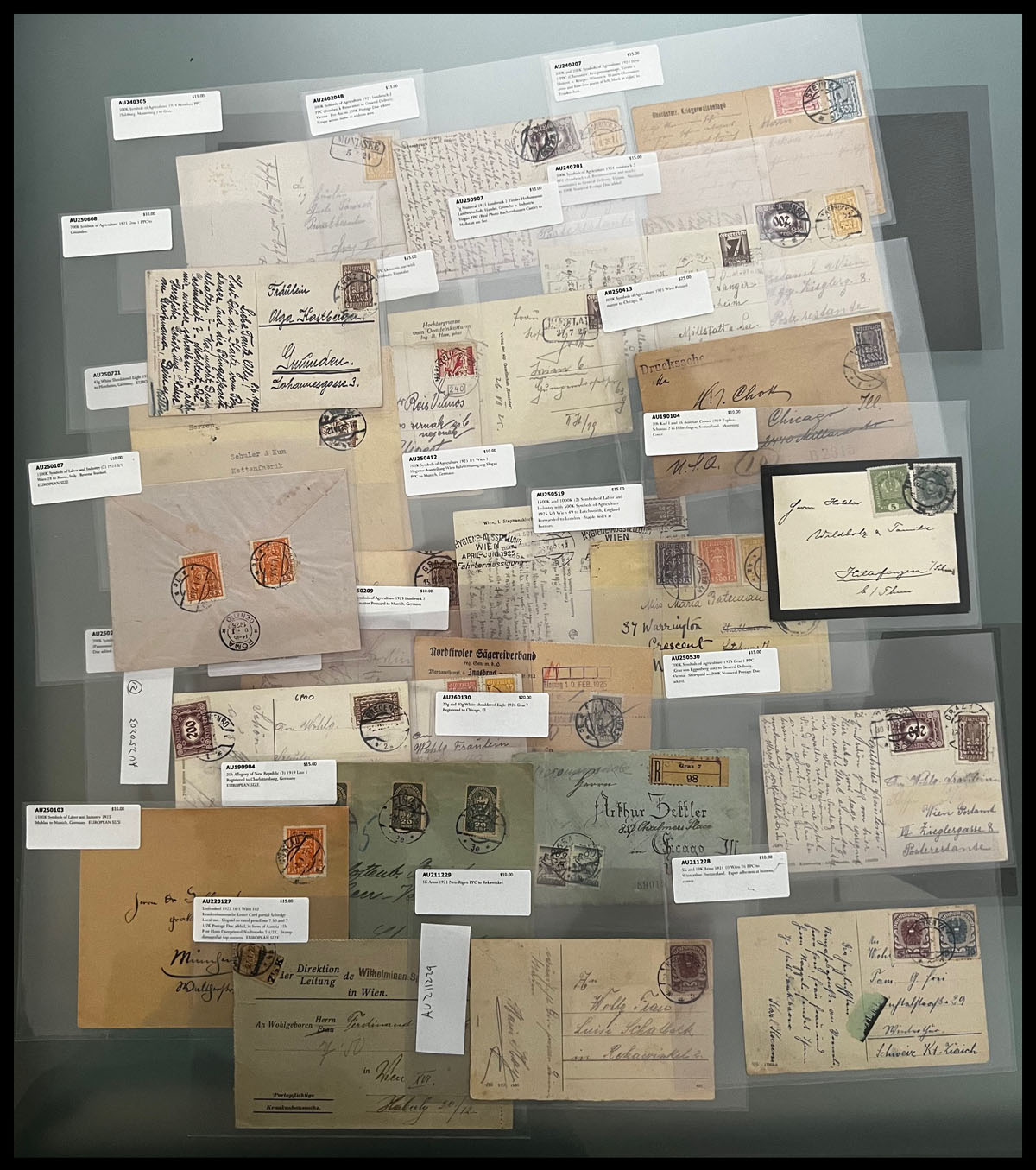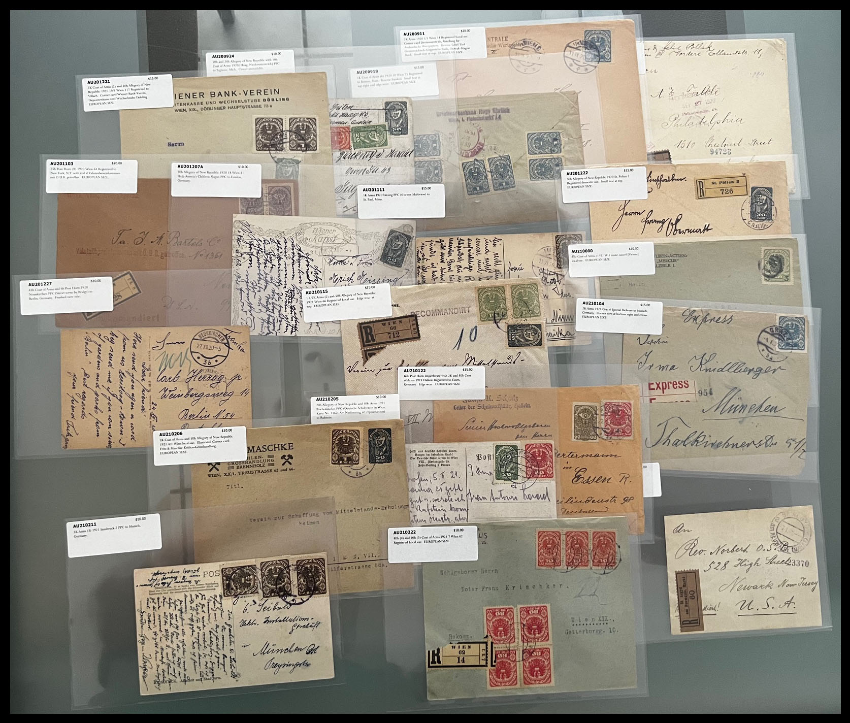 LARGE PRE-WORLD WAR II POSTAL HISTORY SELECTION IN A BOX: 1918-32, over 340 items with about 140 mostly uprated postal stationery cards and envelopes, each one is described in a dealer’s sleeve, many nicely franked items, several WW I occupation cards or covers, individually priced from $10 to $75, mainly addressed to Europe or USA, minor conveyance flaws possible, nevertheless nice unit, F/VF or better, approximate retail is about $5,000, Est. $1,000-$1,200