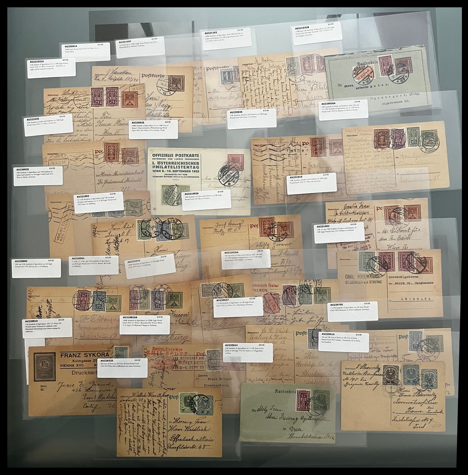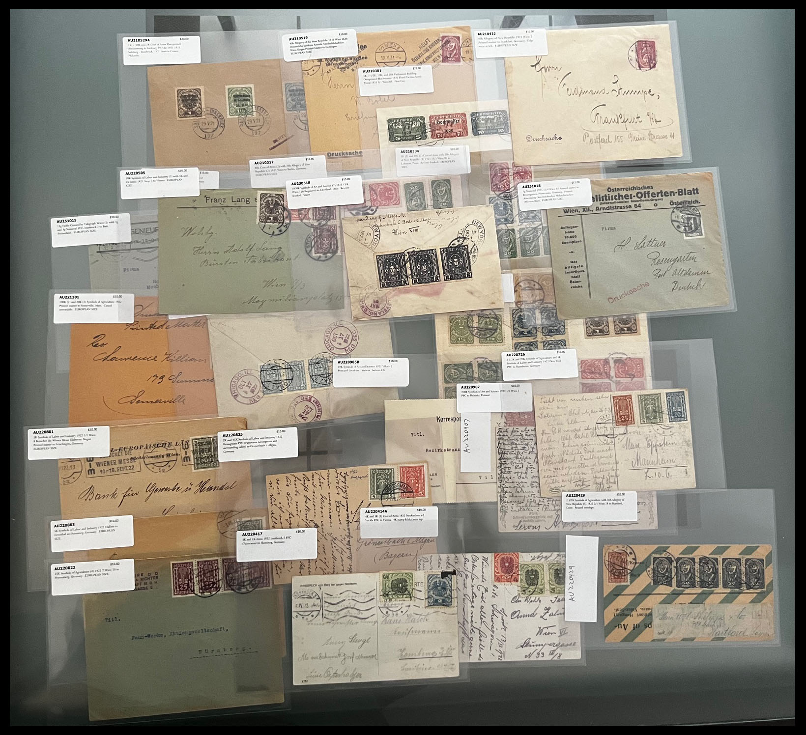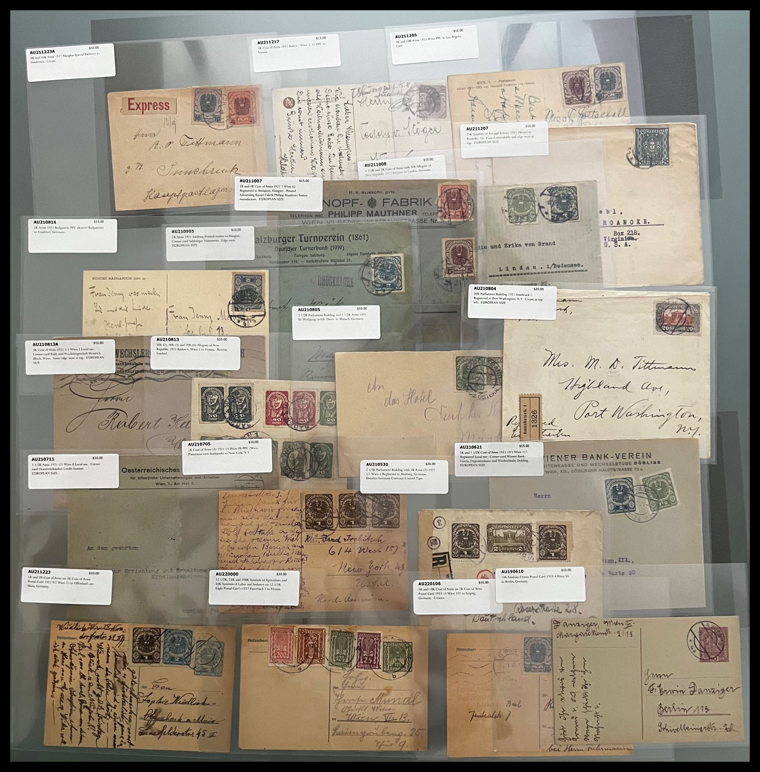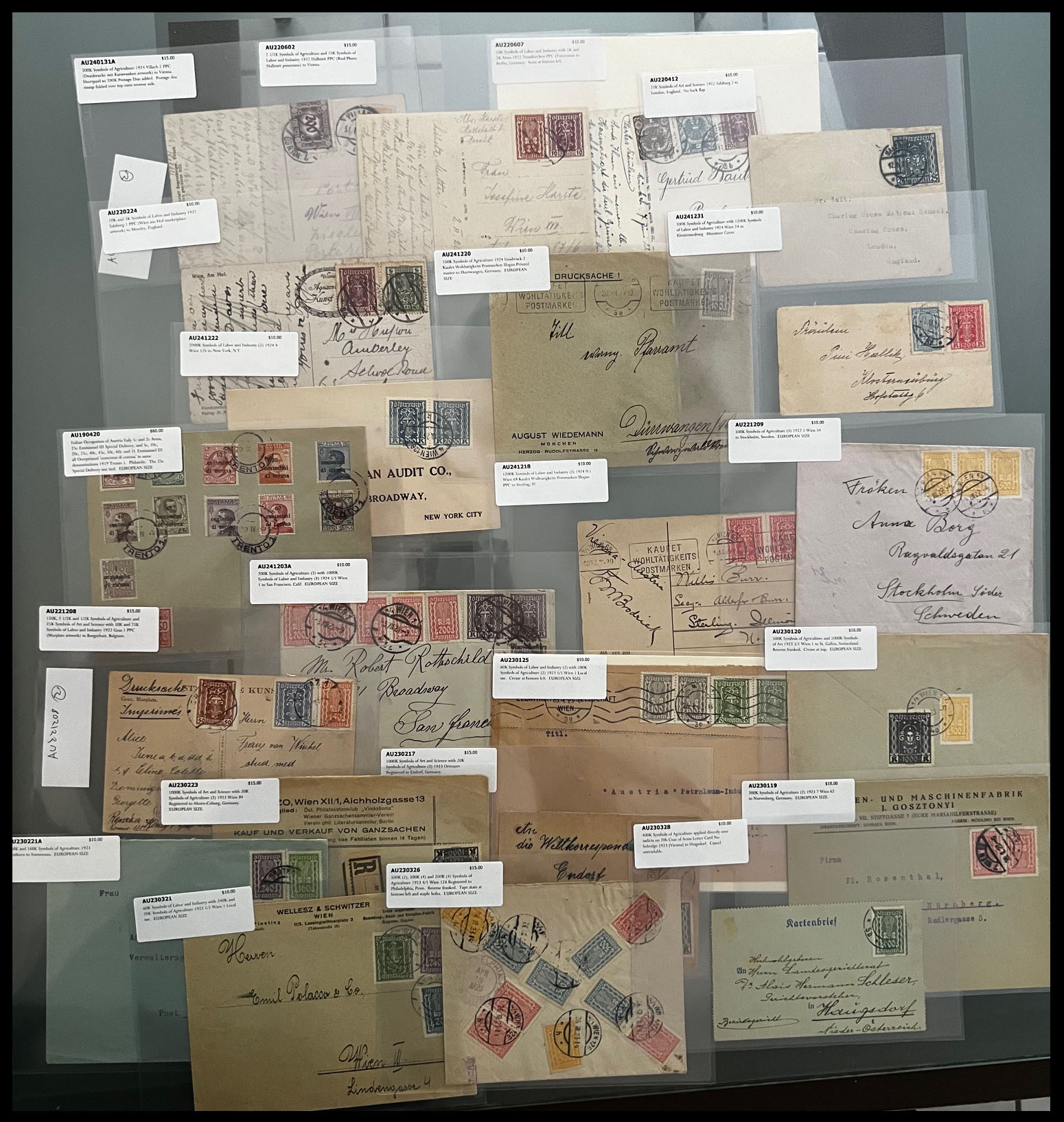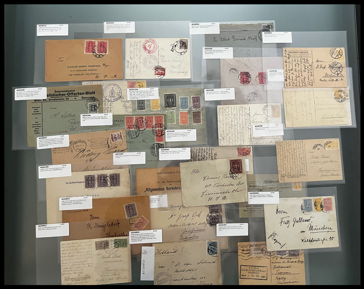 LARGE PRE-WORLD WAR II POSTAL HISTORY SELECTION IN A BOX: 1918-32, over 340 items with about 140 mostly uprated postal stationery cards and envelopes, each one is described in a dealer’s sleeve, many nicely franked items, several WW I occupation cards or covers, individually priced from $10 to $75, mainly addressed to Europe or USA, minor conveyance flaws possible, nevertheless nice unit, F/VF or better, approximate retail is about $5,000, Est. $1,000-$1,200