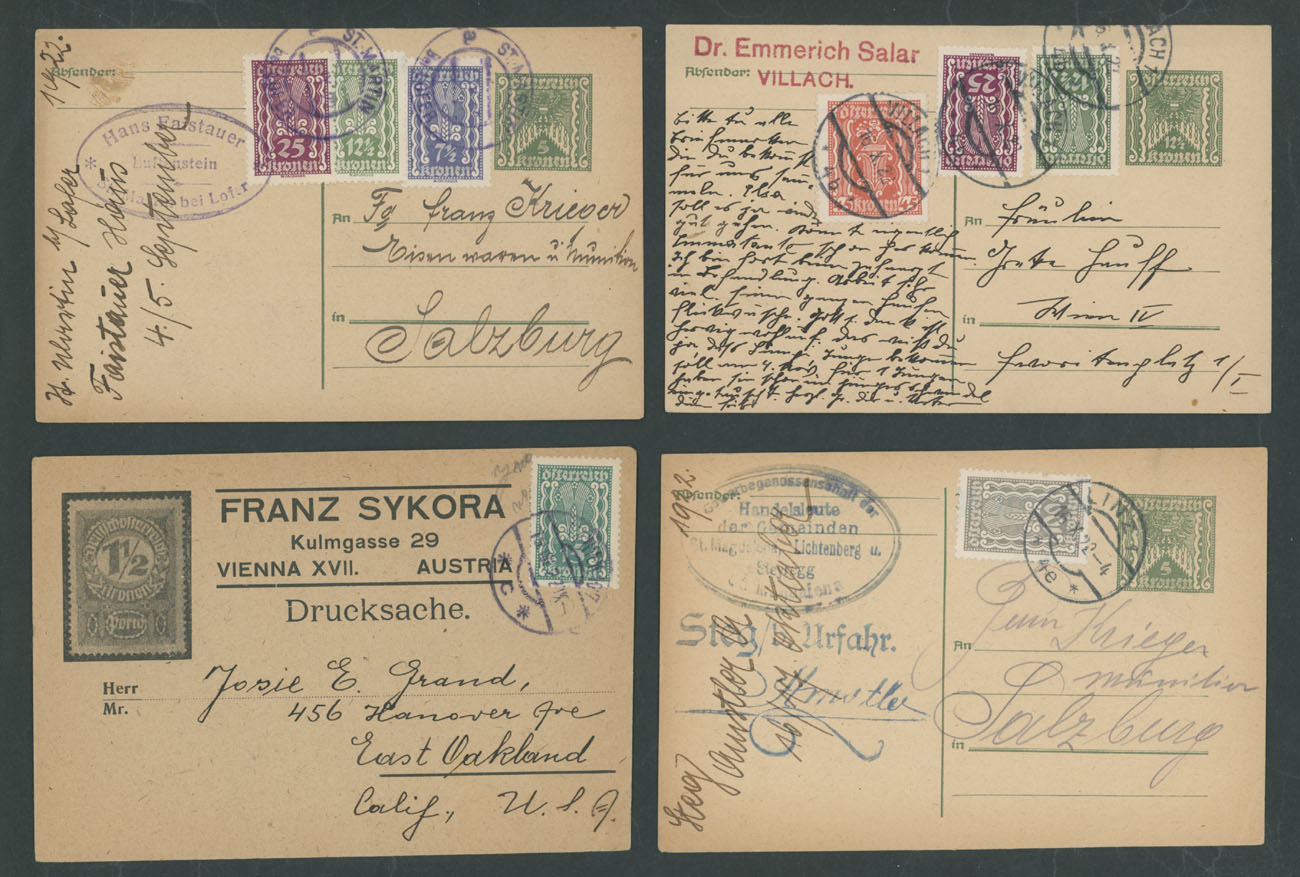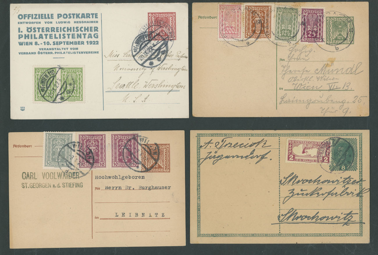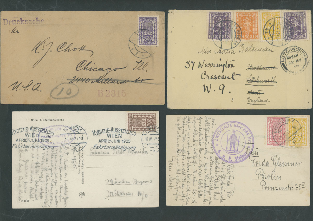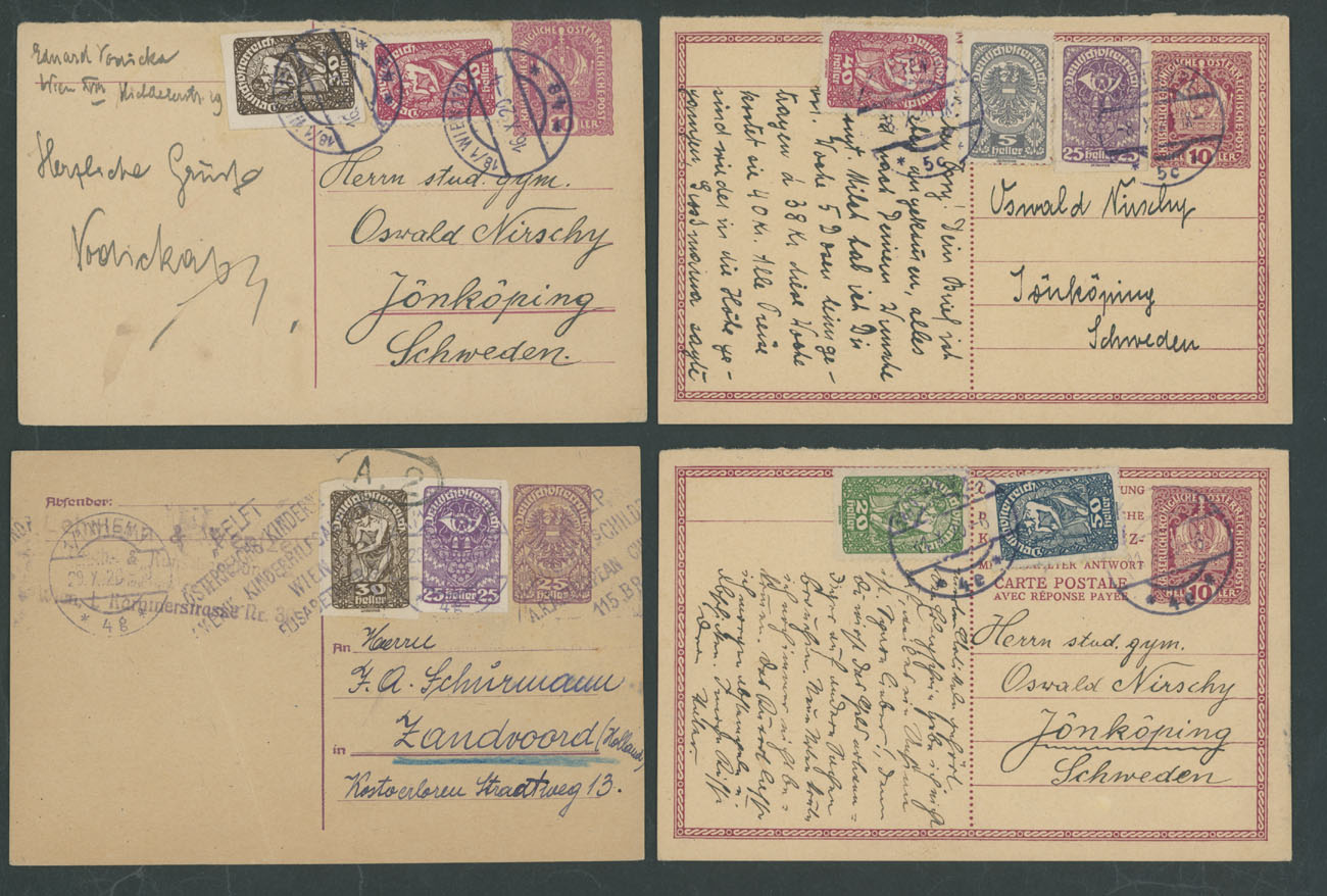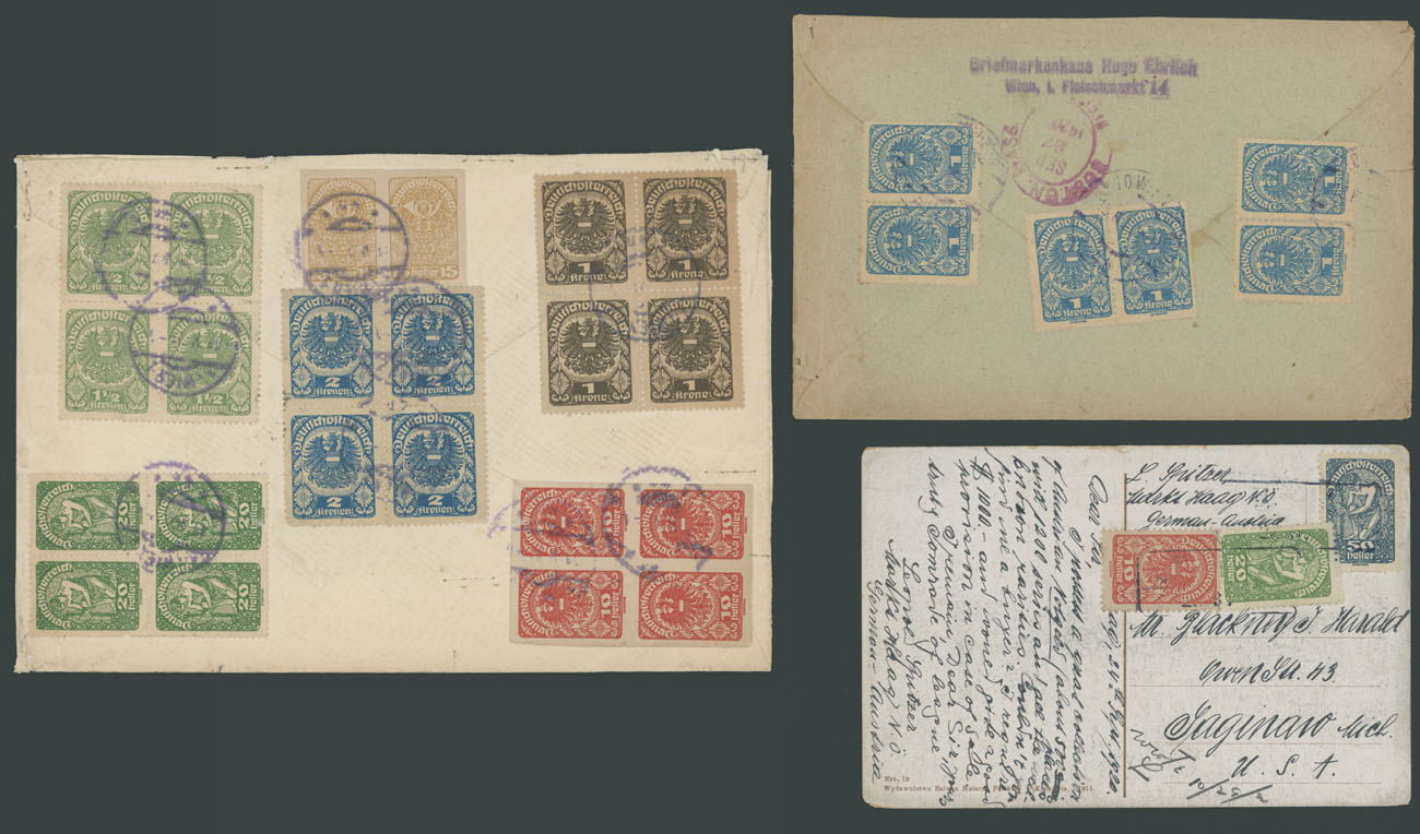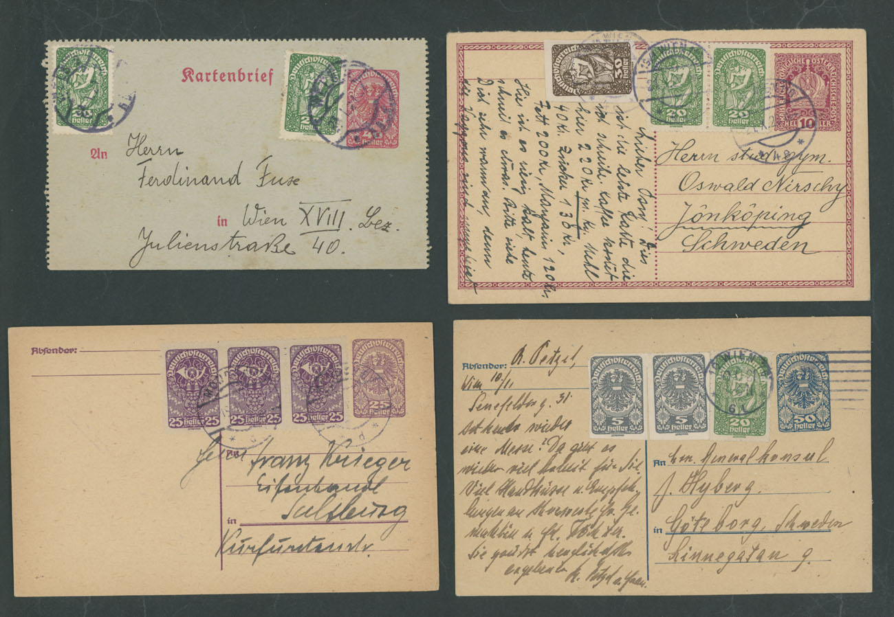 LARGE PRE-WORLD WAR II POSTAL HISTORY SELECTION IN A BOX: 1918-32, over 340 items with about 140 mostly uprated postal stationery cards and envelopes, each one is described in a dealer’s sleeve, many nicely franked items, several WW I occupation cards or covers, individually priced from $10 to $75, mainly addressed to Europe or USA, minor conveyance flaws possible, nevertheless nice unit, F/VF or better, approximate retail is about $5,000, Est. $1,000-$1,200