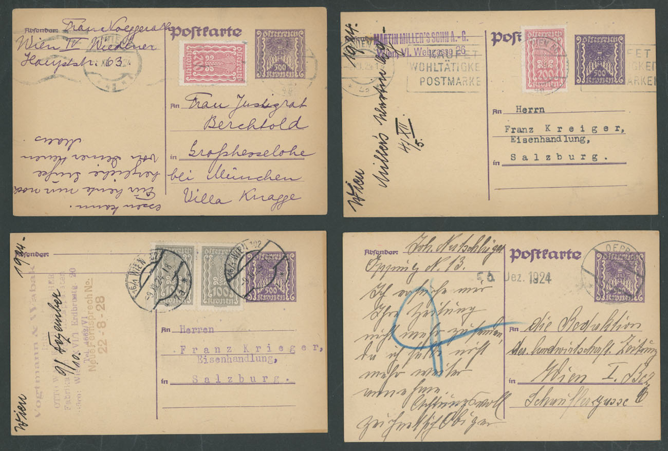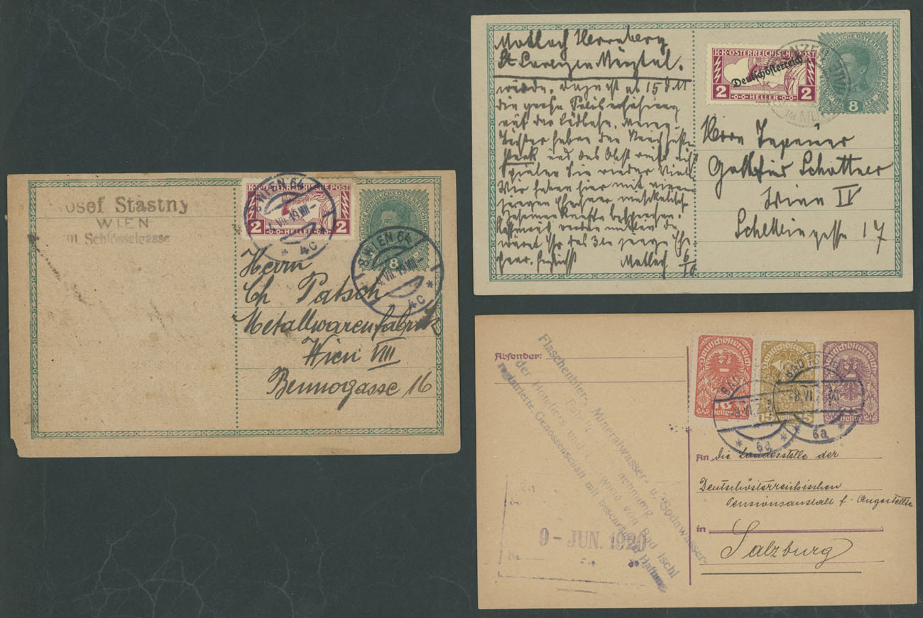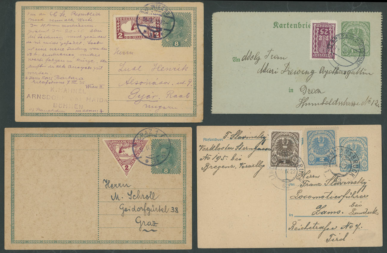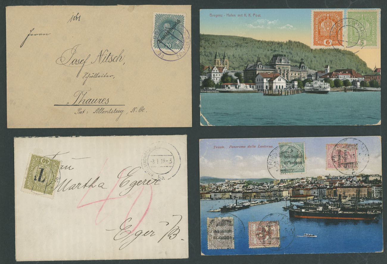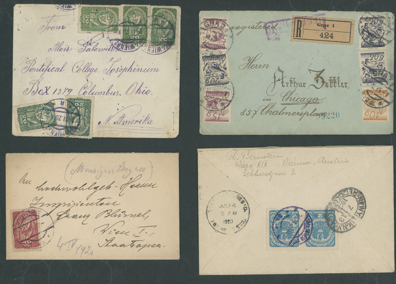 LARGE PRE-WORLD WAR II POSTAL HISTORY SELECTION IN A BOX: 1918-32, over 340 items with about 140 mostly uprated postal stationery cards and envelopes, each one is described in a dealer’s sleeve, many nicely franked items, several WW I occupation cards or covers, individually priced from $10 to $75, mainly addressed to Europe or USA, minor conveyance flaws possible, nevertheless nice unit, F/VF or better, approximate retail is about $5,000, Est. $1,000-$1,200