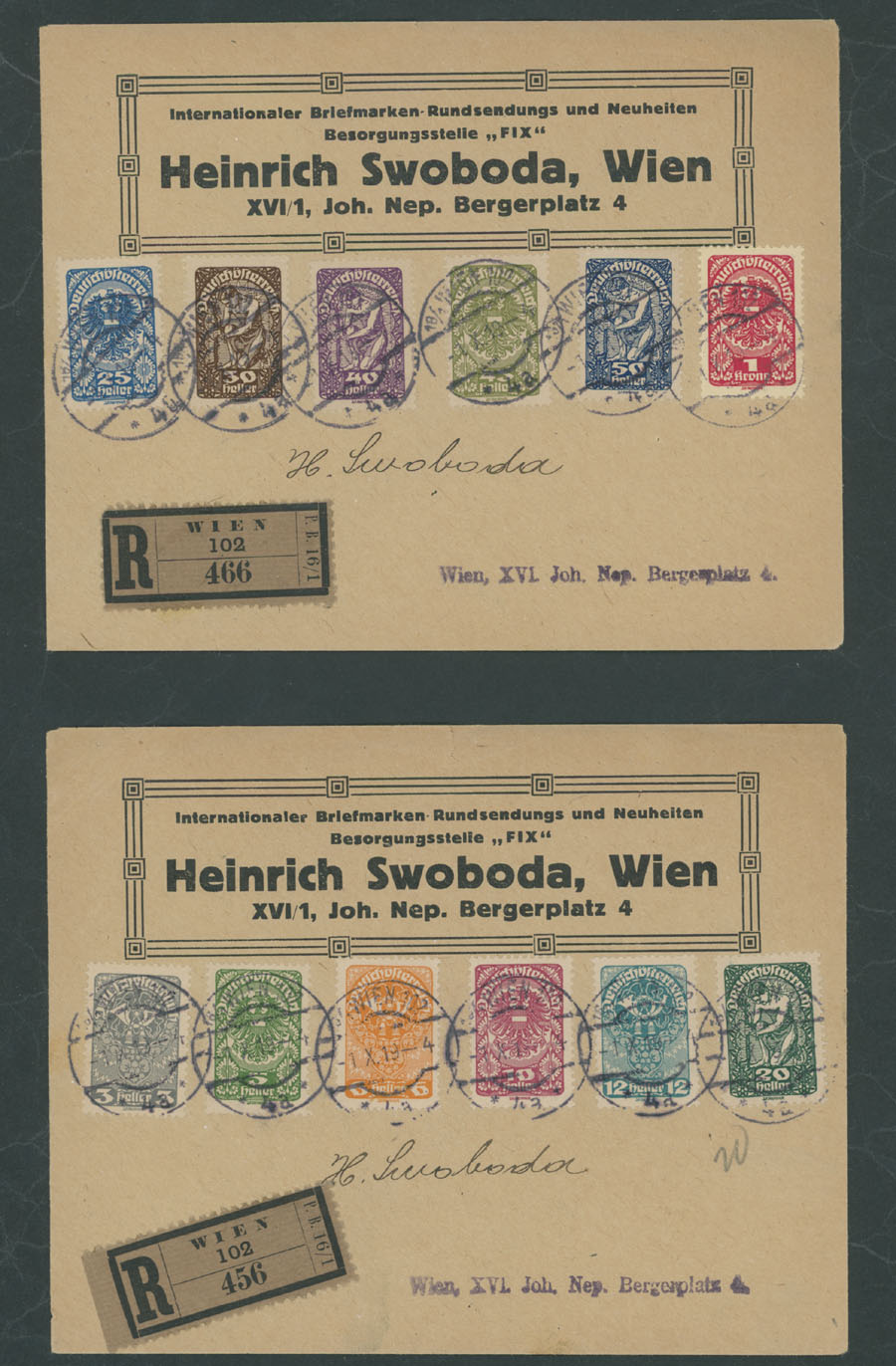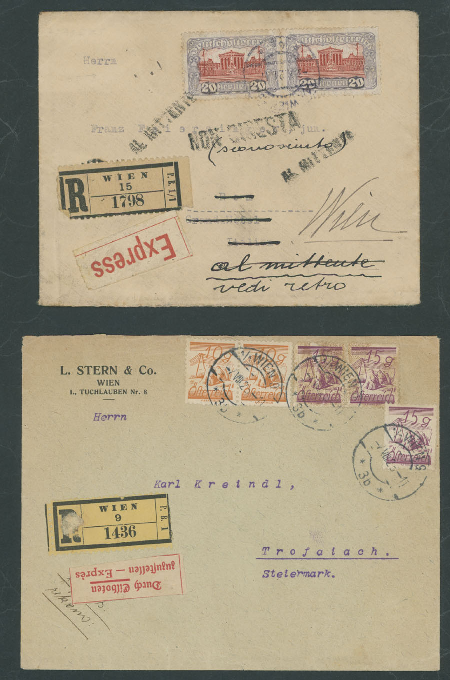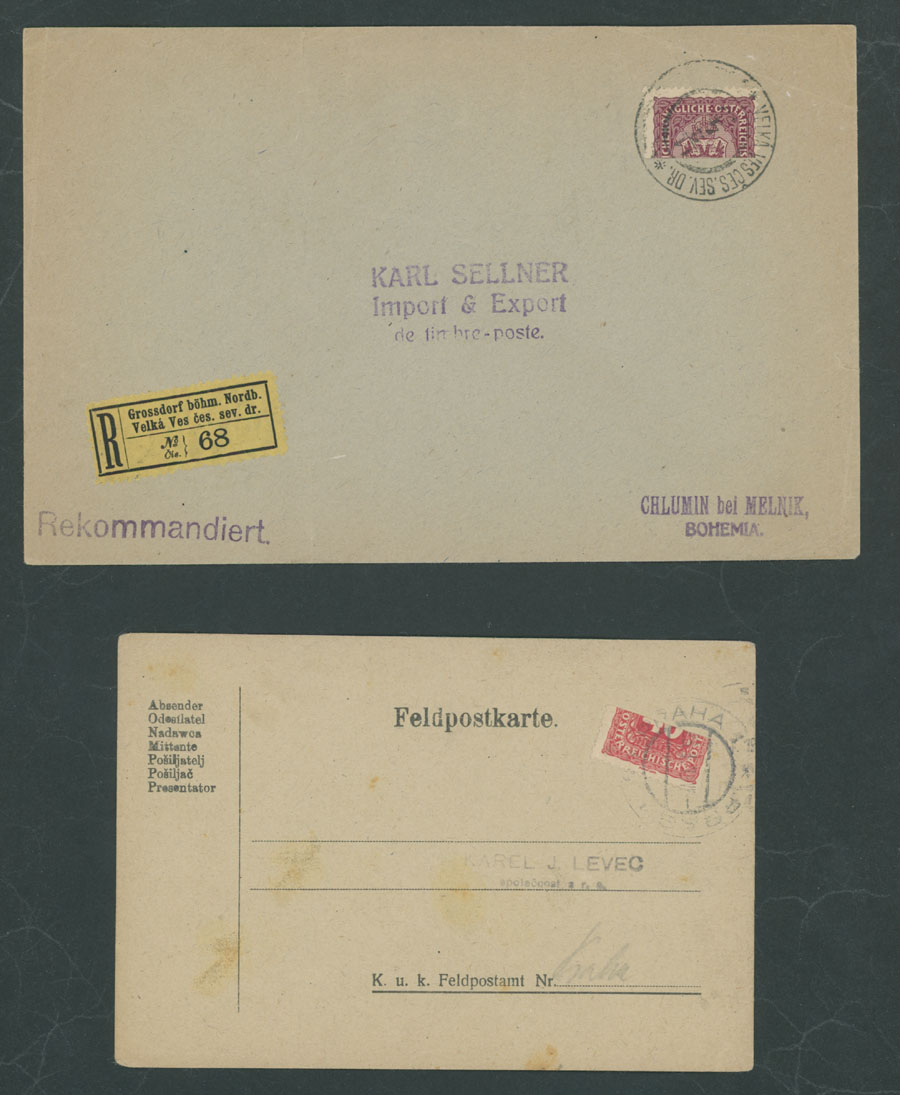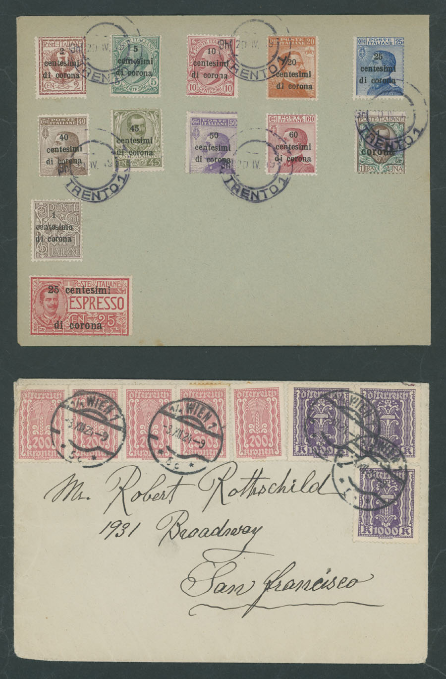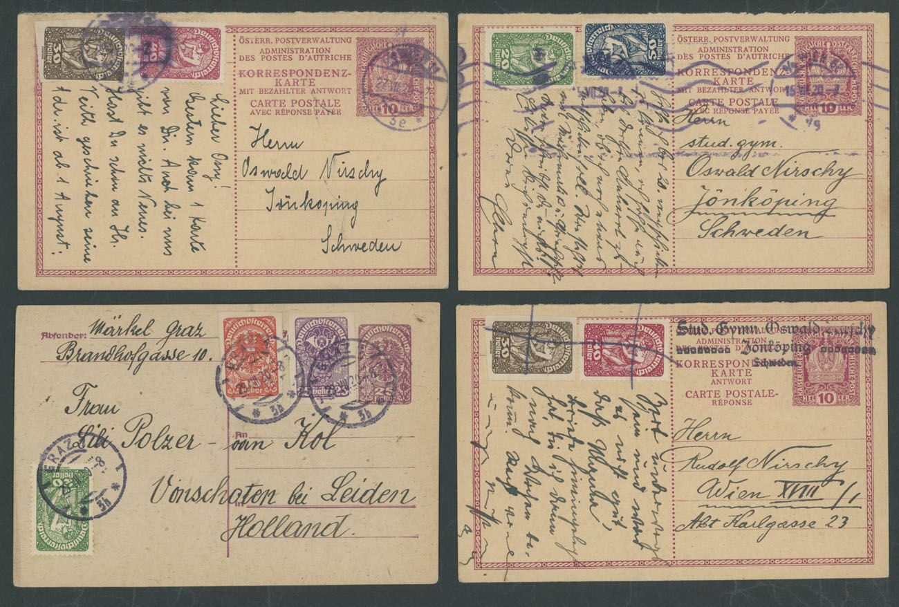 LARGE PRE-WORLD WAR II POSTAL HISTORY SELECTION IN A BOX: 1918-32, over 340 items with about 140 mostly uprated postal stationery cards and envelopes, each one is described in a dealer’s sleeve, many nicely franked items, several WW I occupation cards or covers, individually priced from $10 to $75, mainly addressed to Europe or USA, minor conveyance flaws possible, nevertheless nice unit, F/VF or better, approximate retail is about $5,000, Est. $1,000-$1,200