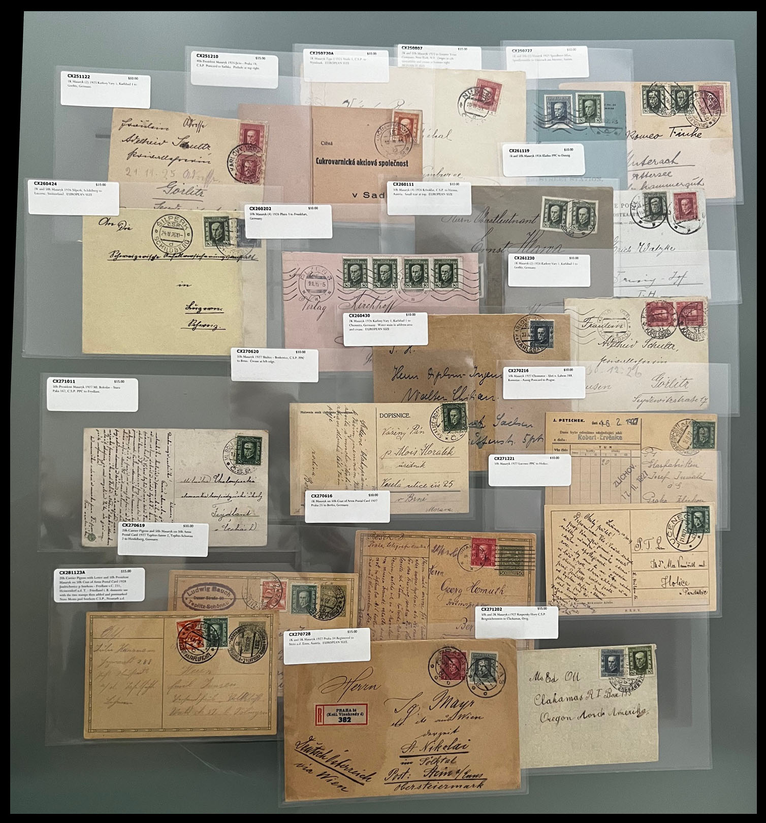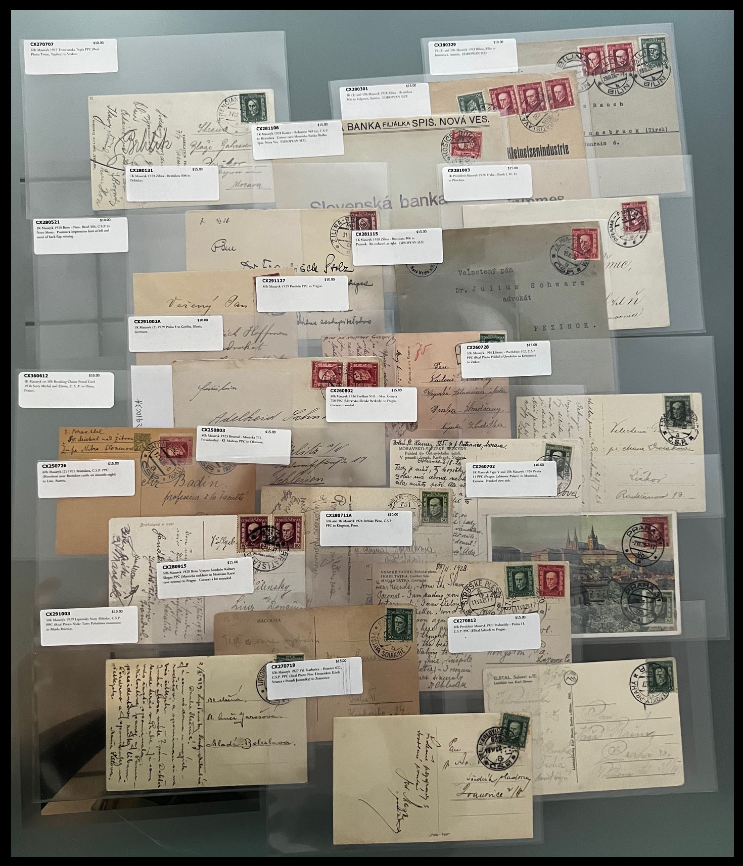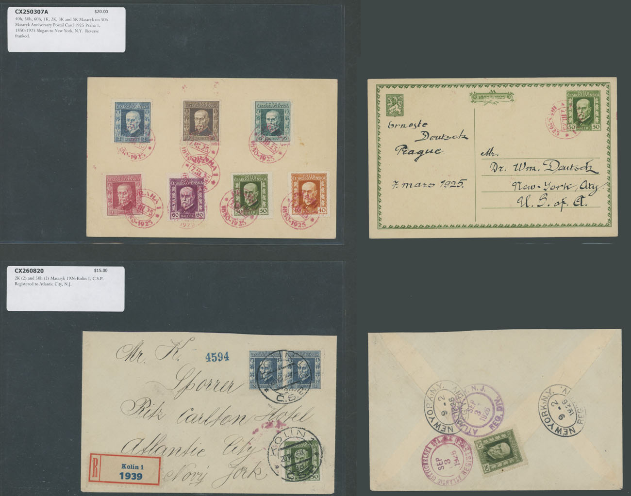 PRESIDENT MASARYK NEW DESIGN ISSUE – STAMPS AND POSTAL HISTORY COLLECTION: 1926, 131 mint and used stamps on watermarked paper (50h and 60h), including coils of 50h stamps and paper without watermark of all three values, representing 20 positional singles, pair and blocks with control numbers; in addition 84 individually packed postal history items, including 21 stationery cards, 24 covers and 39 postcards with about 30 PPC of various topics, nice franking and destinations with total retail value well over $1,100; nice and clean Collection, full/part of OG or used, F/VF, Est. $500-$600, Scott #116/30