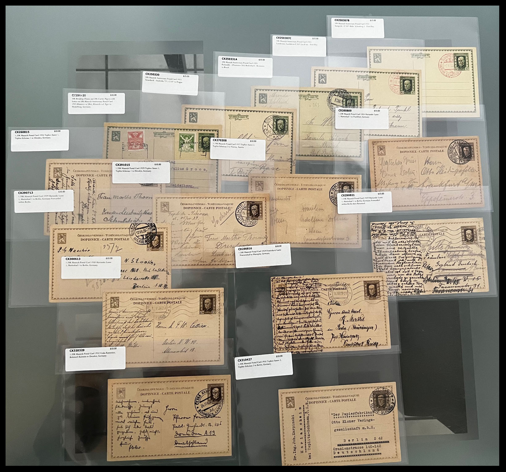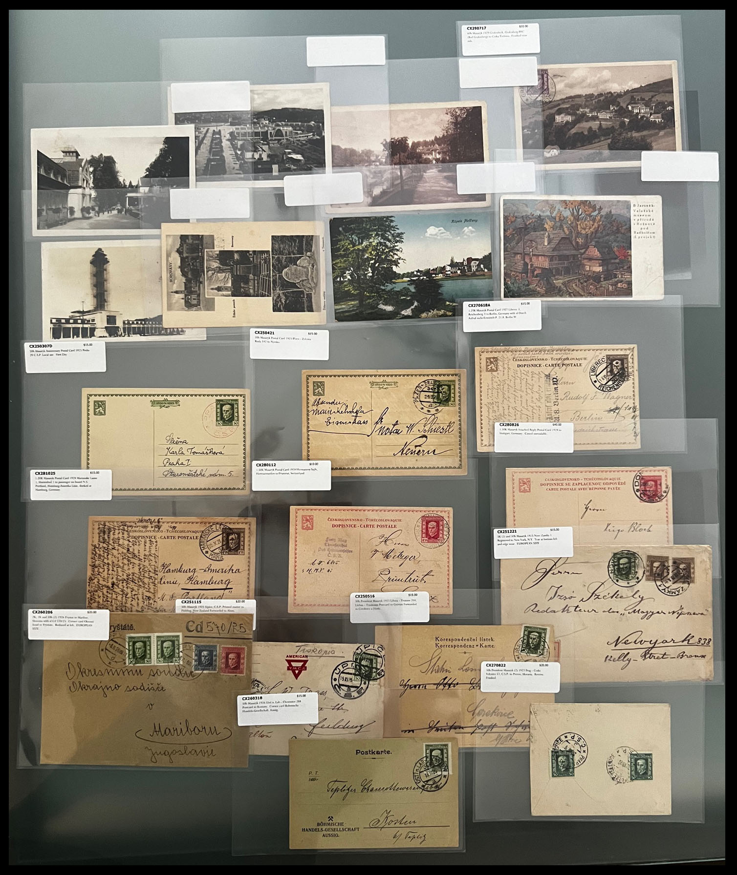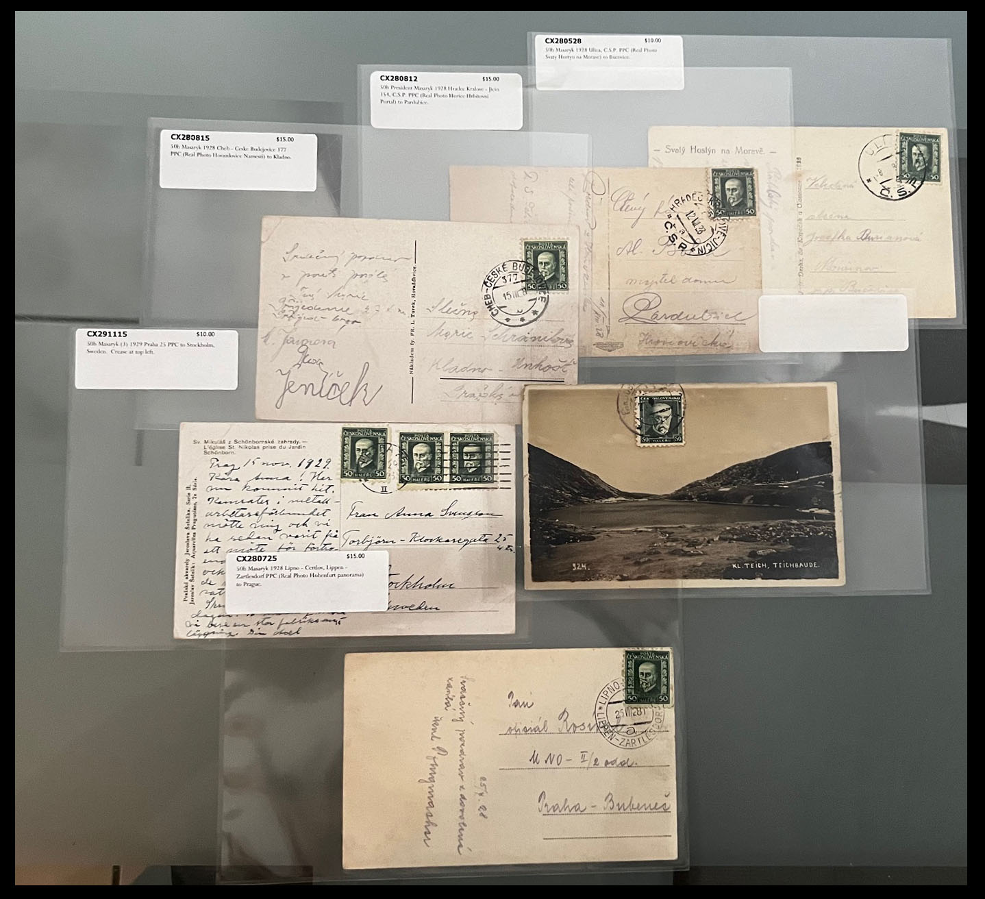 PRESIDENT MASARYK NEW DESIGN ISSUE – STAMPS AND POSTAL HISTORY COLLECTION: 1926, 131 mint and used stamps on watermarked paper (50h and 60h), including coils of 50h stamps and paper without watermark of all three values, representing 20 positional singles, pair and blocks with control numbers; in addition 84 individually packed postal history items, including 21 stationery cards, 24 covers and 39 postcards with about 30 PPC of various topics, nice franking and destinations with total retail value well over $1,100; nice and clean Collection, full/part of OG or used, F/VF, Est. $500-$600, Scott #116/30