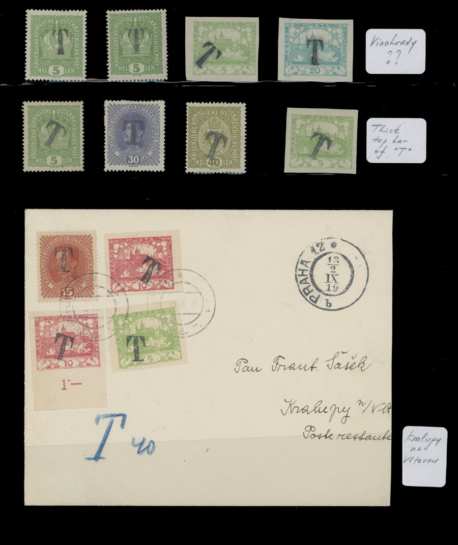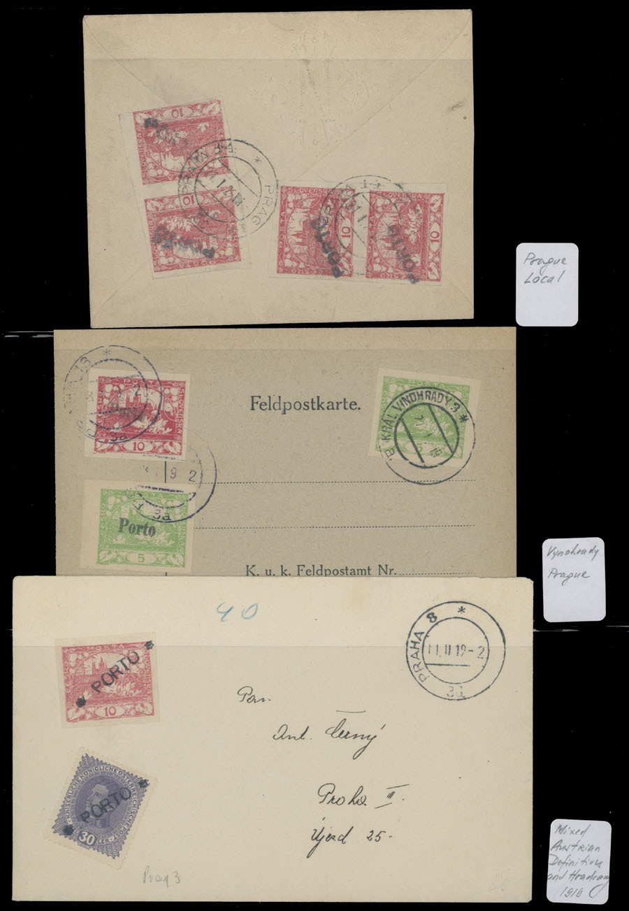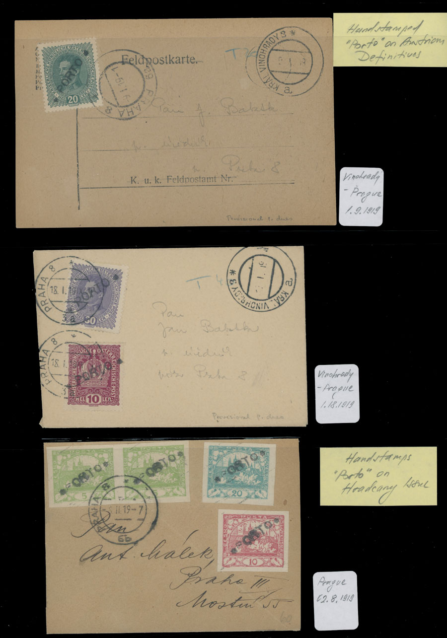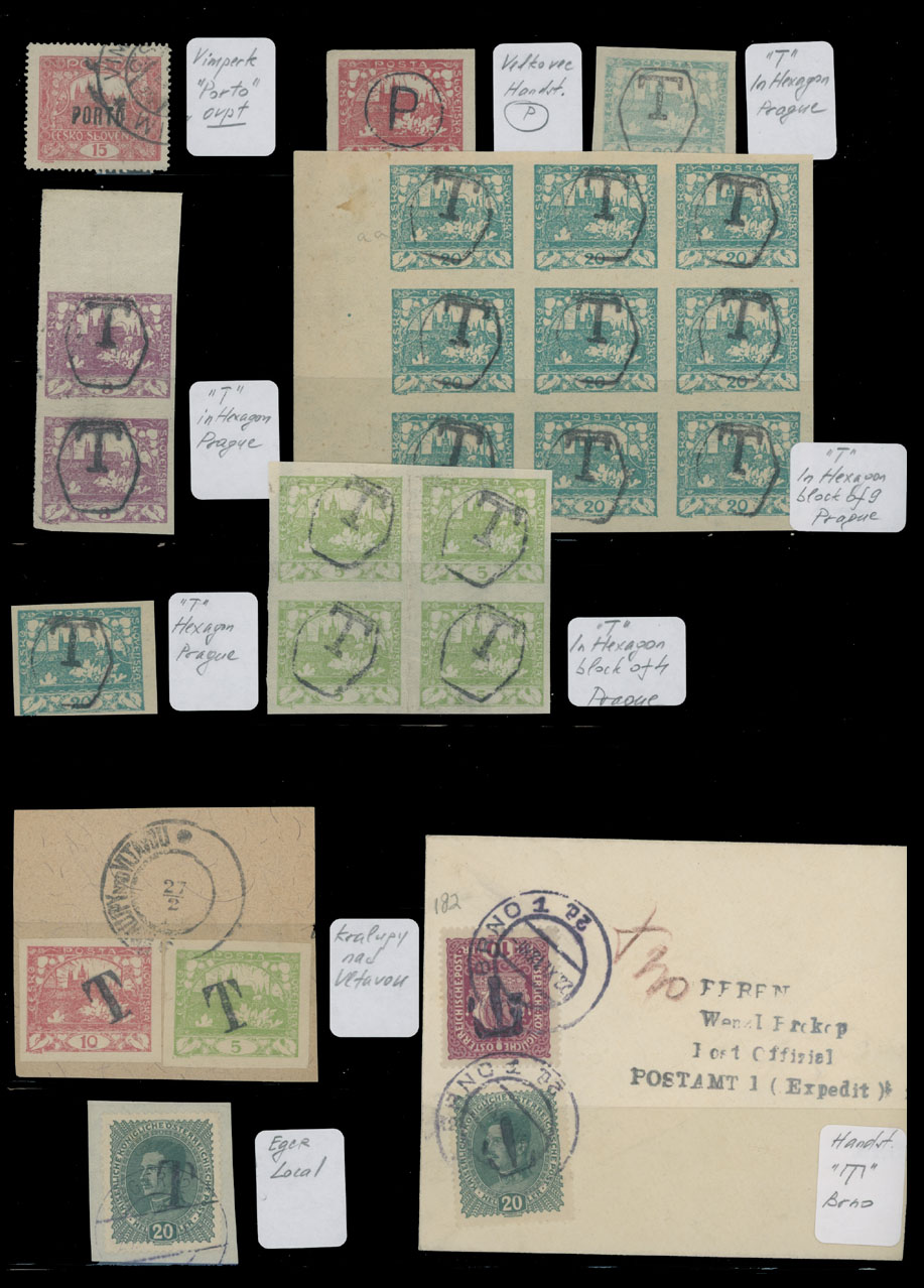 COLLECTION OF EARLY PERIOD PROVISIONAL OVERPRINTS: 1918-20, handstamped overprint ”Porto” on Austrian definitive stamps and Hradcany issue – 9 stamps and 9 postal history items, single stamps with ”Porto” overprint (Vimperk) and handstamped ”P” in oval (Velkovec), large piece of 7 stamps with handstamped ”Porto” in circle (Dunajska Streda), then handstamped ”T” of various types from Prague, Brno, Pilsen, Chelb (Eger), Kralupy nad Vltavou, Frantiskovy Lazne and several others. the total is 140 mint and used stamps, including handstamped ”T” in hexagon on imperf Hradcany 5h in block of 50, and about 40 stamps of unknown ”T” handstamp, as well as 19 cards or covers, including two cards and one cover bearing Austrian dues handstamped ”FRANCO” and used as postal stamps in Pilsen, Terezin and Budisov, occasional flaws possible, nice and clean material overall, F/VF, Est. $600-$750
