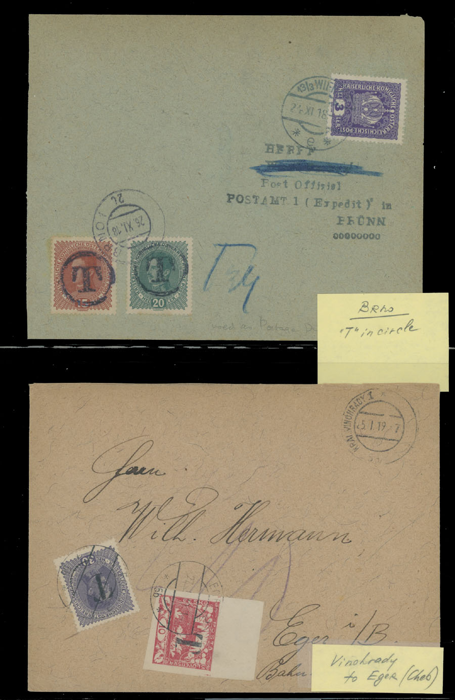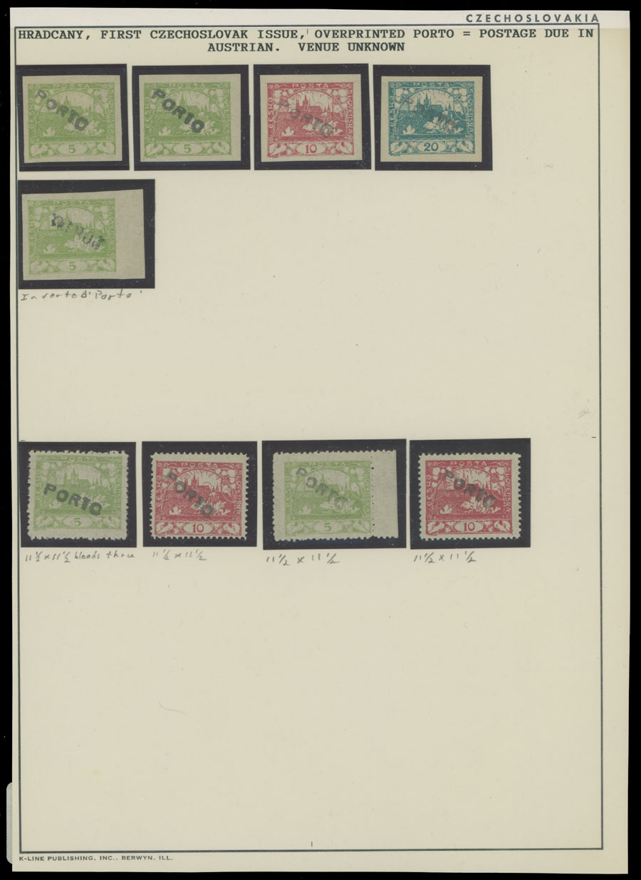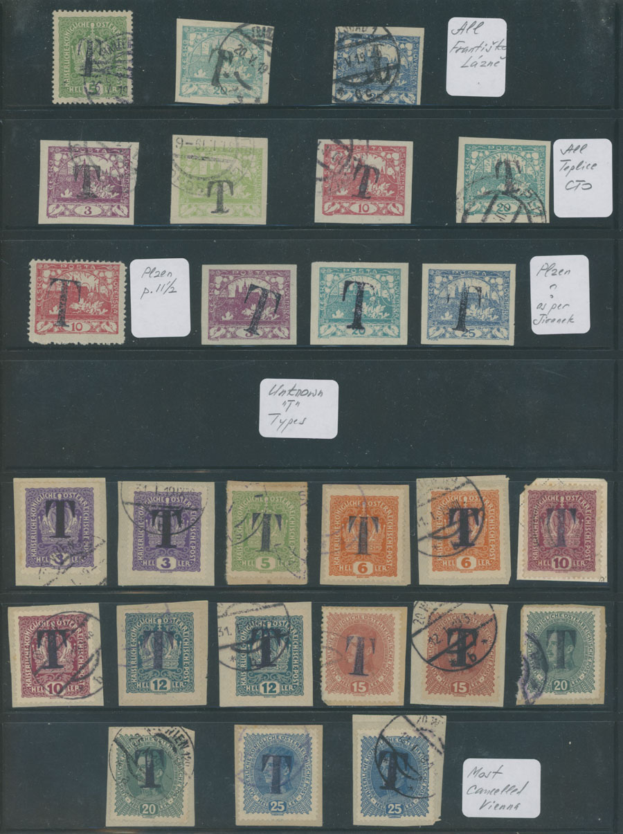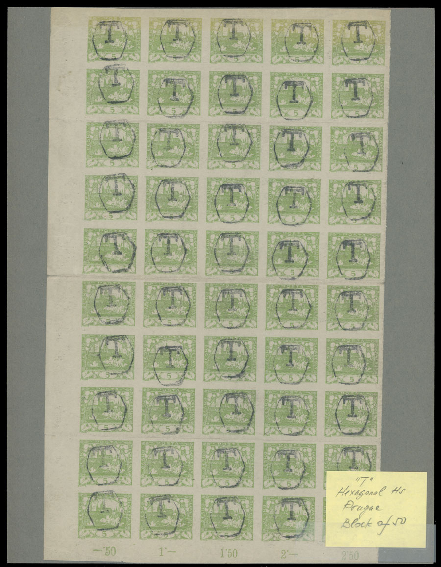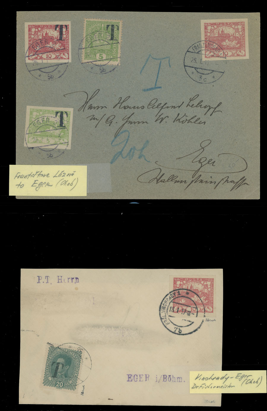 COLLECTION OF EARLY PERIOD PROVISIONAL OVERPRINTS: 1918-20, handstamped overprint ”Porto” on Austrian definitive stamps and Hradcany issue – 9 stamps and 9 postal history items, single stamps with ”Porto” overprint (Vimperk) and handstamped ”P” in oval (Velkovec), large piece of 7 stamps with handstamped ”Porto” in circle (Dunajska Streda), then handstamped ”T” of various types from Prague, Brno, Pilsen, Chelb (Eger), Kralupy nad Vltavou, Frantiskovy Lazne and several others. the total is 140 mint and used stamps, including handstamped ”T” in hexagon on imperf Hradcany 5h in block of 50, and about 40 stamps of unknown ”T” handstamp, as well as 19 cards or covers, including two cards and one cover bearing Austrian dues handstamped ”FRANCO” and used as postal stamps in Pilsen, Terezin and Budisov, occasional flaws possible, nice and clean material overall, F/VF, Est. $600-$750