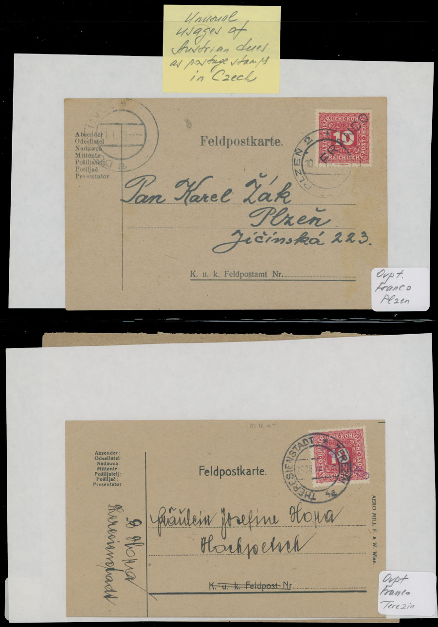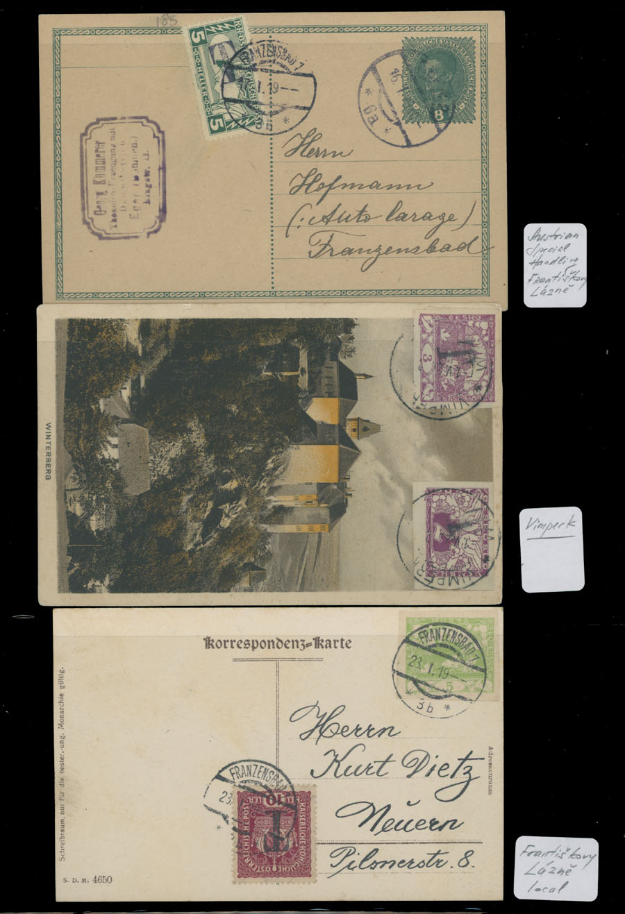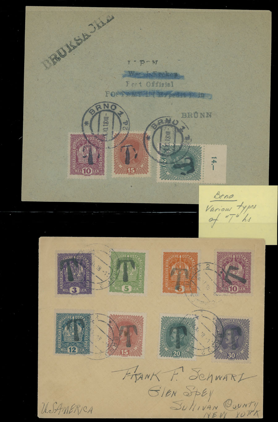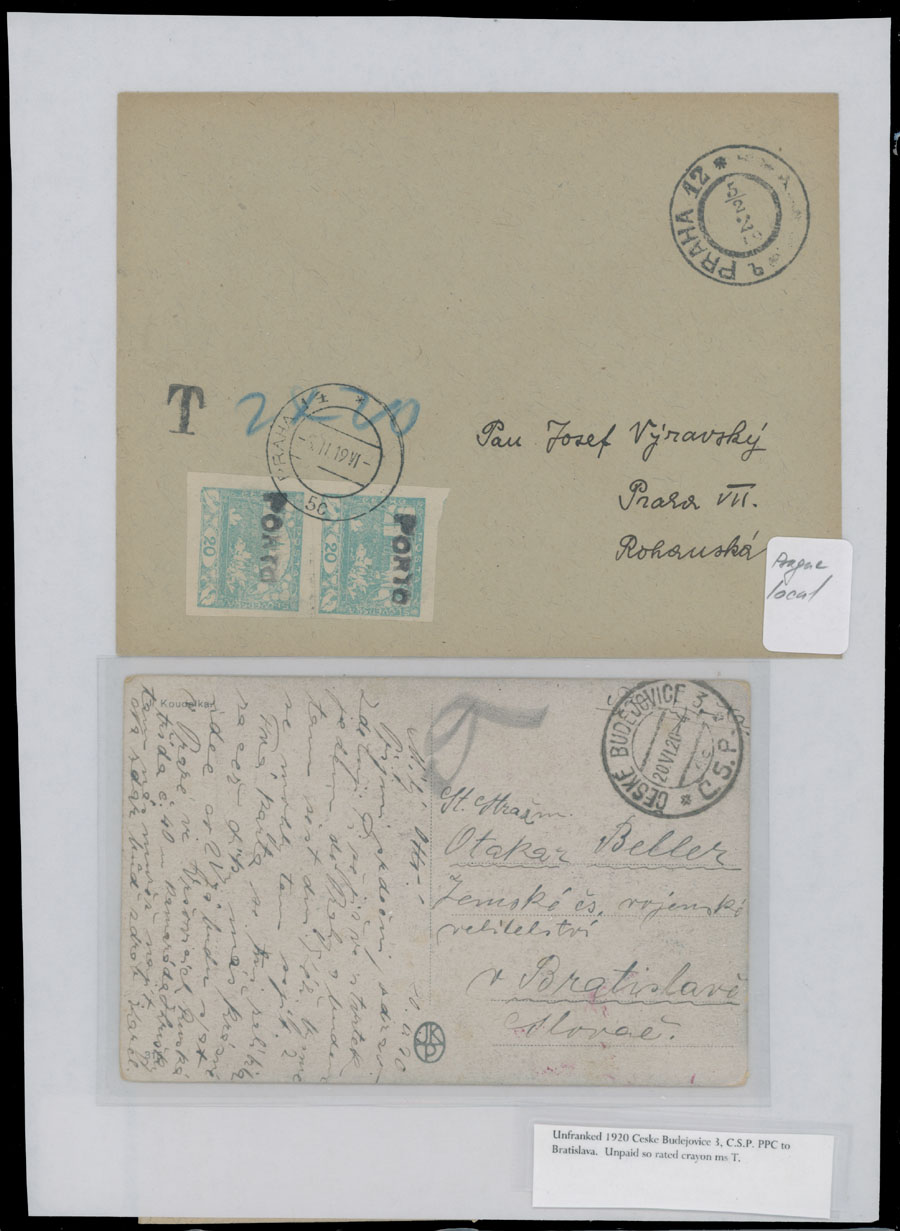 COLLECTION OF EARLY PERIOD PROVISIONAL OVERPRINTS: 1918-20, handstamped overprint ”Porto” on Austrian definitive stamps and Hradcany issue – 9 stamps and 9 postal history items, single stamps with ”Porto” overprint (Vimperk) and handstamped ”P” in oval (Velkovec), large piece of 7 stamps with handstamped ”Porto” in circle (Dunajska Streda), then handstamped ”T” of various types from Prague, Brno, Pilsen, Chelb (Eger), Kralupy nad Vltavou, Frantiskovy Lazne and several others. the total is 140 mint and used stamps, including handstamped ”T” in hexagon on imperf Hradcany 5h in block of 50, and about 40 stamps of unknown ”T” handstamp, as well as 19 cards or covers, including two cards and one cover bearing Austrian dues handstamped ”FRANCO” and used as postal stamps in Pilsen, Terezin and Budisov, occasional flaws possible, nice and clean material overall, F/VF, Est. $600-$750