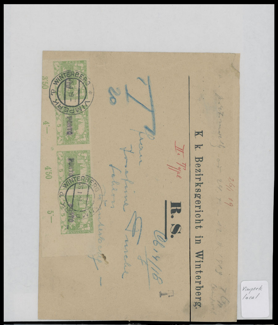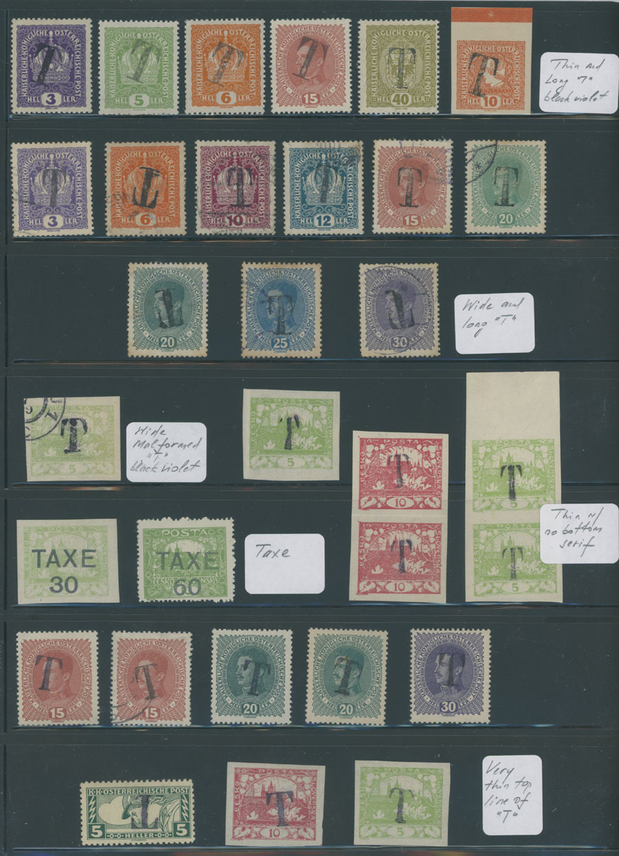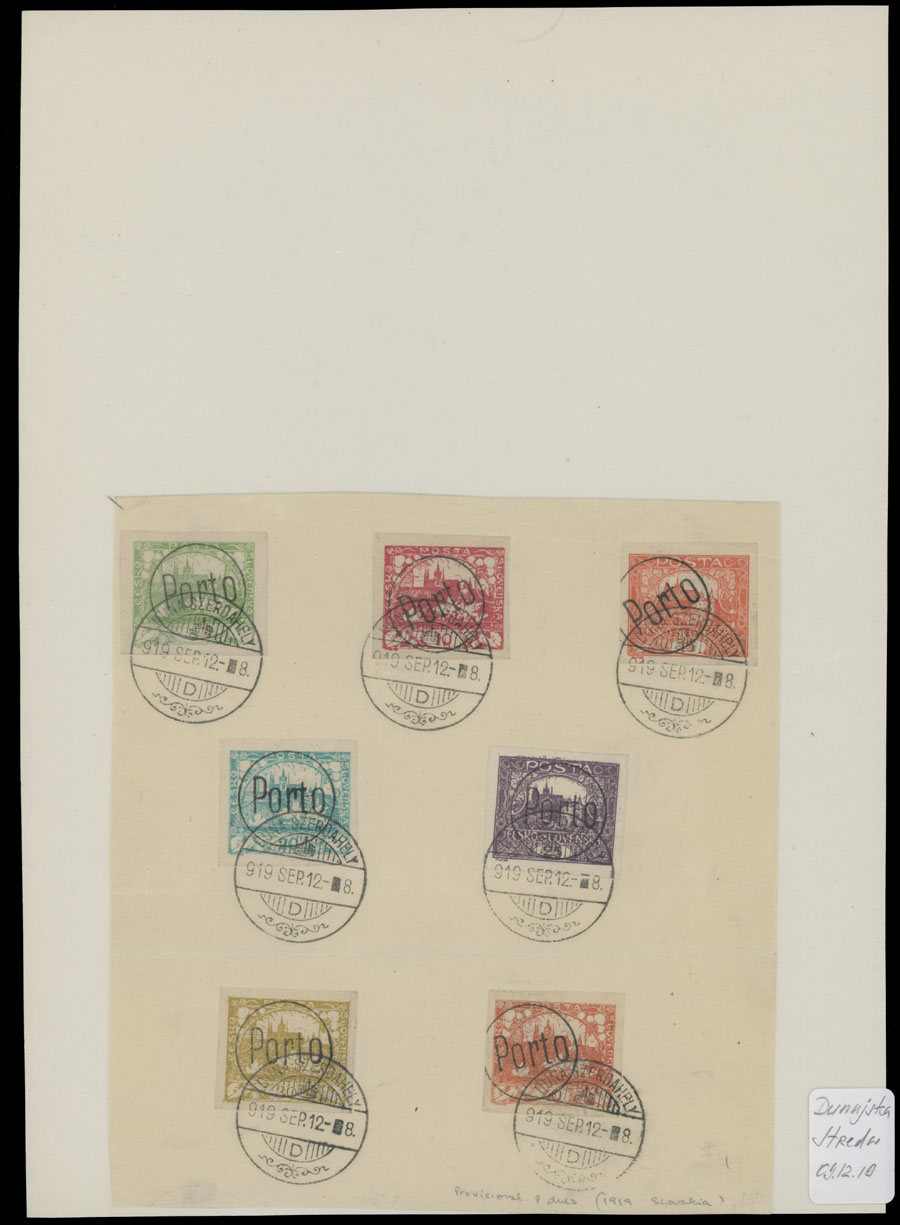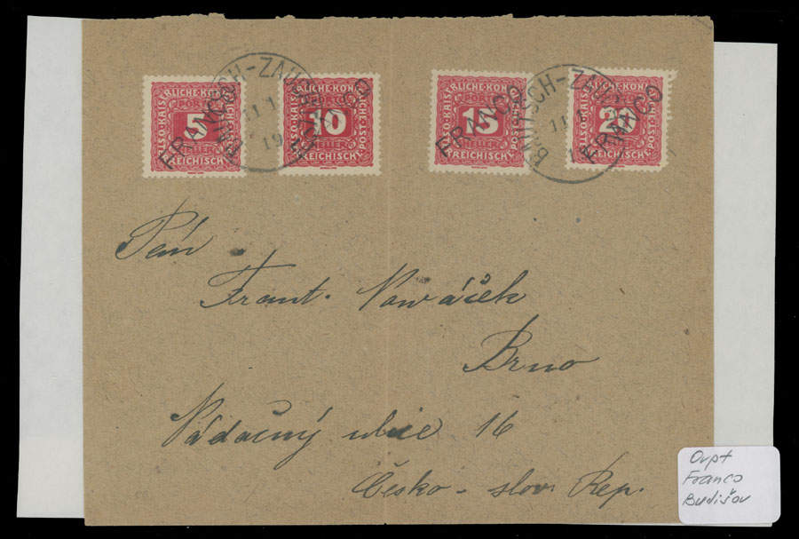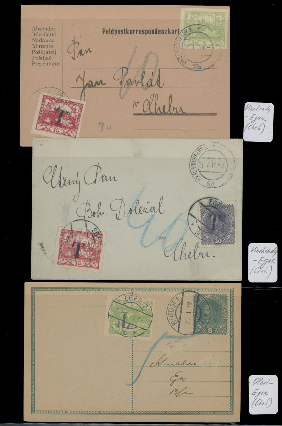 COLLECTION OF EARLY PERIOD PROVISIONAL OVERPRINTS: 1918-20, handstamped overprint ”Porto” on Austrian definitive stamps and Hradcany issue – 9 stamps and 9 postal history items, single stamps with ”Porto” overprint (Vimperk) and handstamped ”P” in oval (Velkovec), large piece of 7 stamps with handstamped ”Porto” in circle (Dunajska Streda), then handstamped ”T” of various types from Prague, Brno, Pilsen, Chelb (Eger), Kralupy nad Vltavou, Frantiskovy Lazne and several others. the total is 140 mint and used stamps, including handstamped ”T” in hexagon on imperf Hradcany 5h in block of 50, and about 40 stamps of unknown ”T” handstamp, as well as 19 cards or covers, including two cards and one cover bearing Austrian dues handstamped ”FRANCO” and used as postal stamps in Pilsen, Terezin and Budisov, occasional flaws possible, nice and clean material overall, F/VF, Est. $600-$750