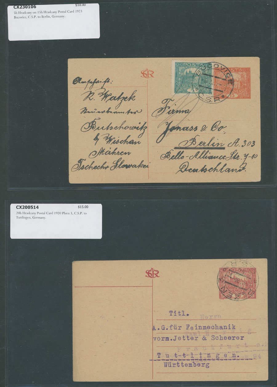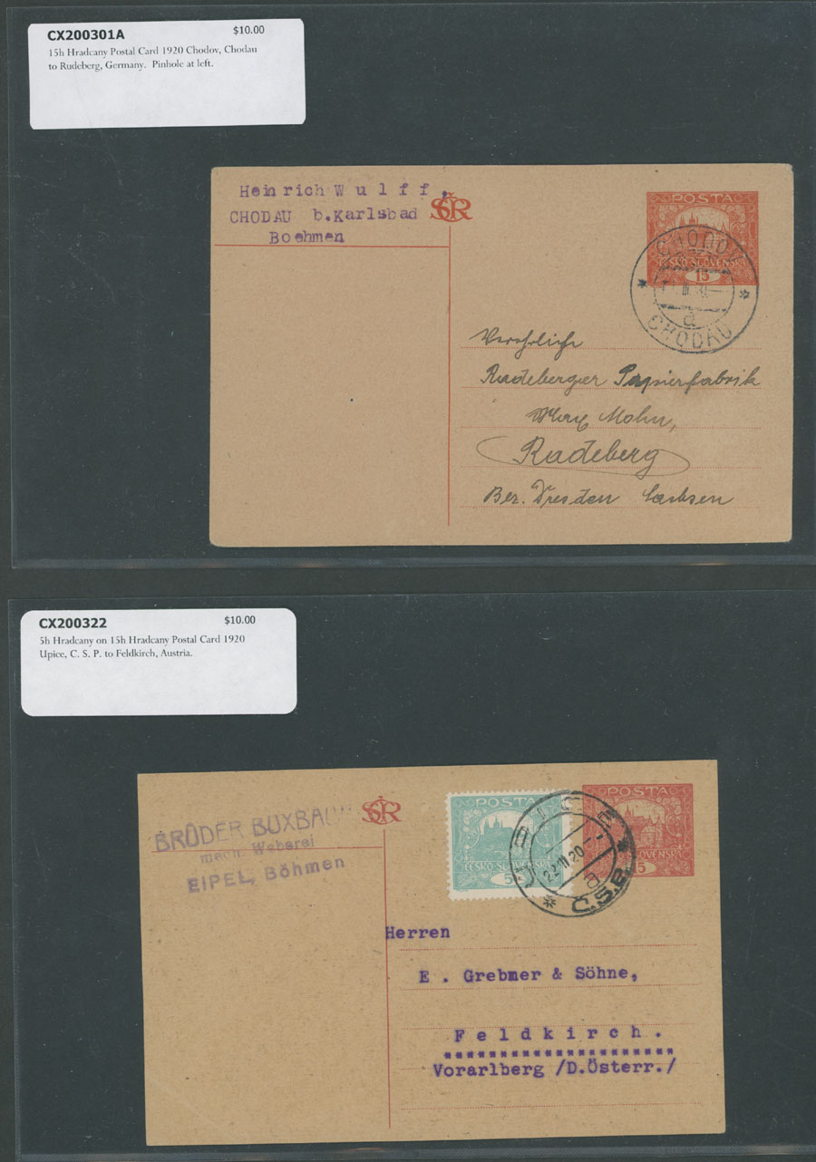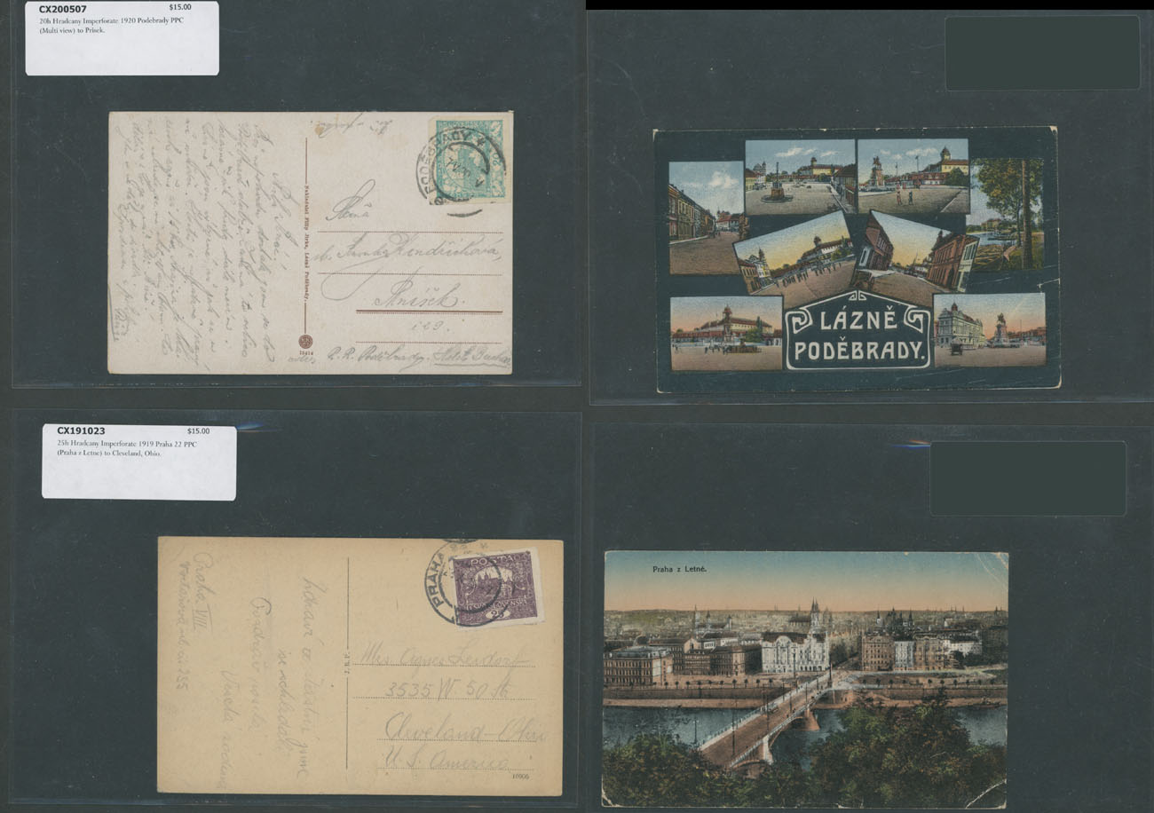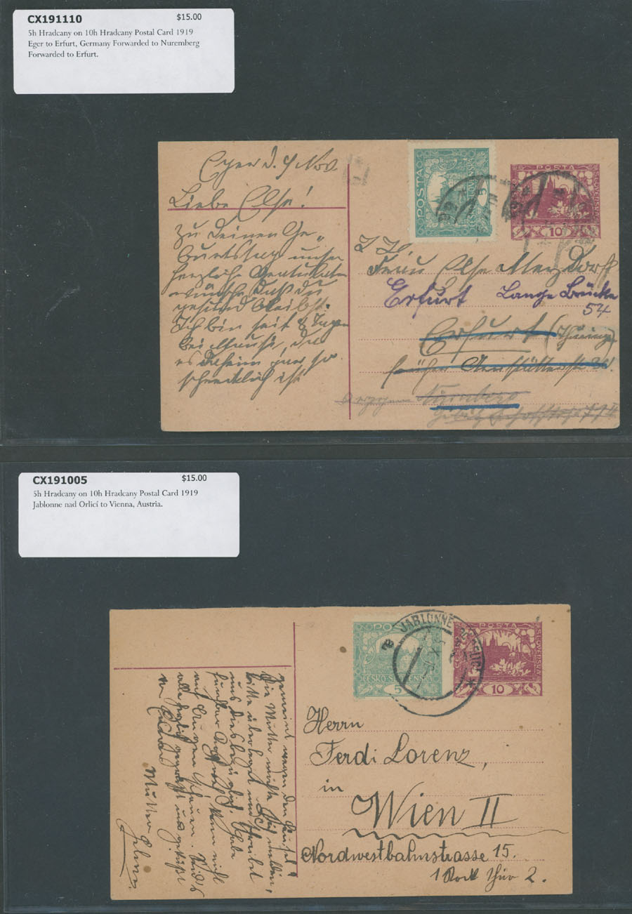 HRADCANY ISSUE: 1919-22, about 100 covers or cards, including 43 stationery cards with pre-printed Hradcany indicia, 11 PPC representing various Czechoslovak city/town views franked by Hradcany issue stamps plus 44 covers and cards bearing Hradcany adhesives, some is bearing ”mixed” franking with other issues, each piece is individually packed in plastic sleeve, described and priced, occasional flaws possible, still F/VF, retail value is $1,150, Est. $200-$250