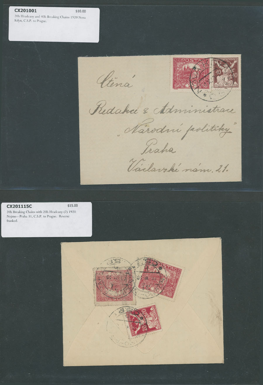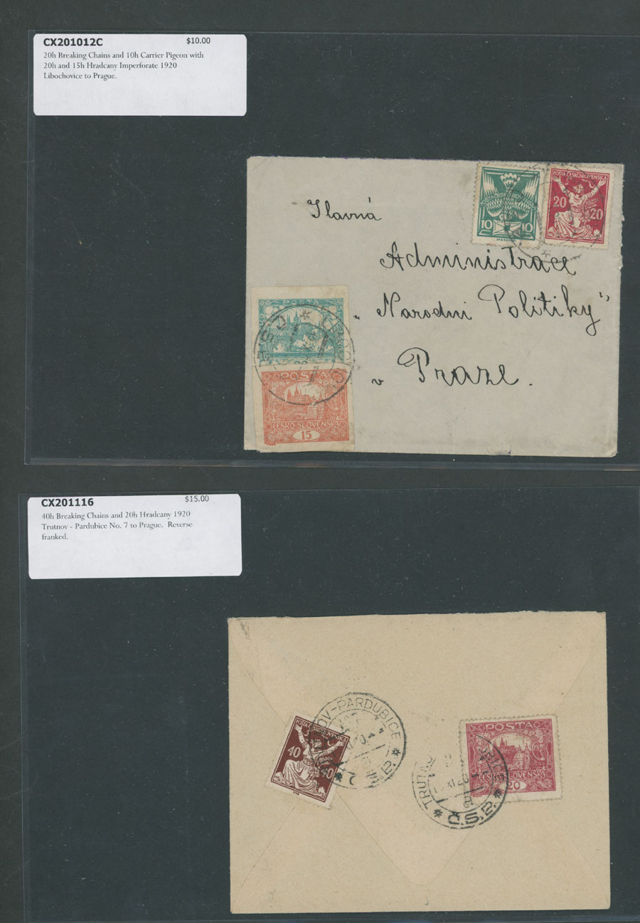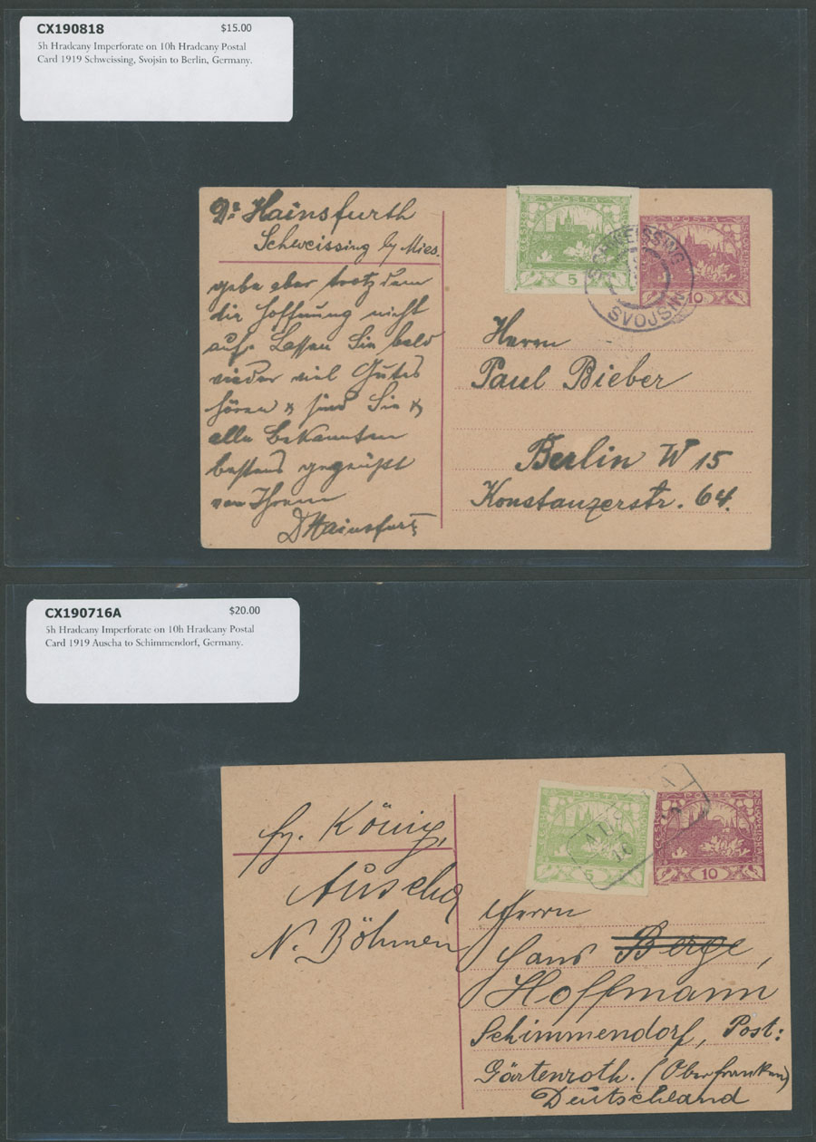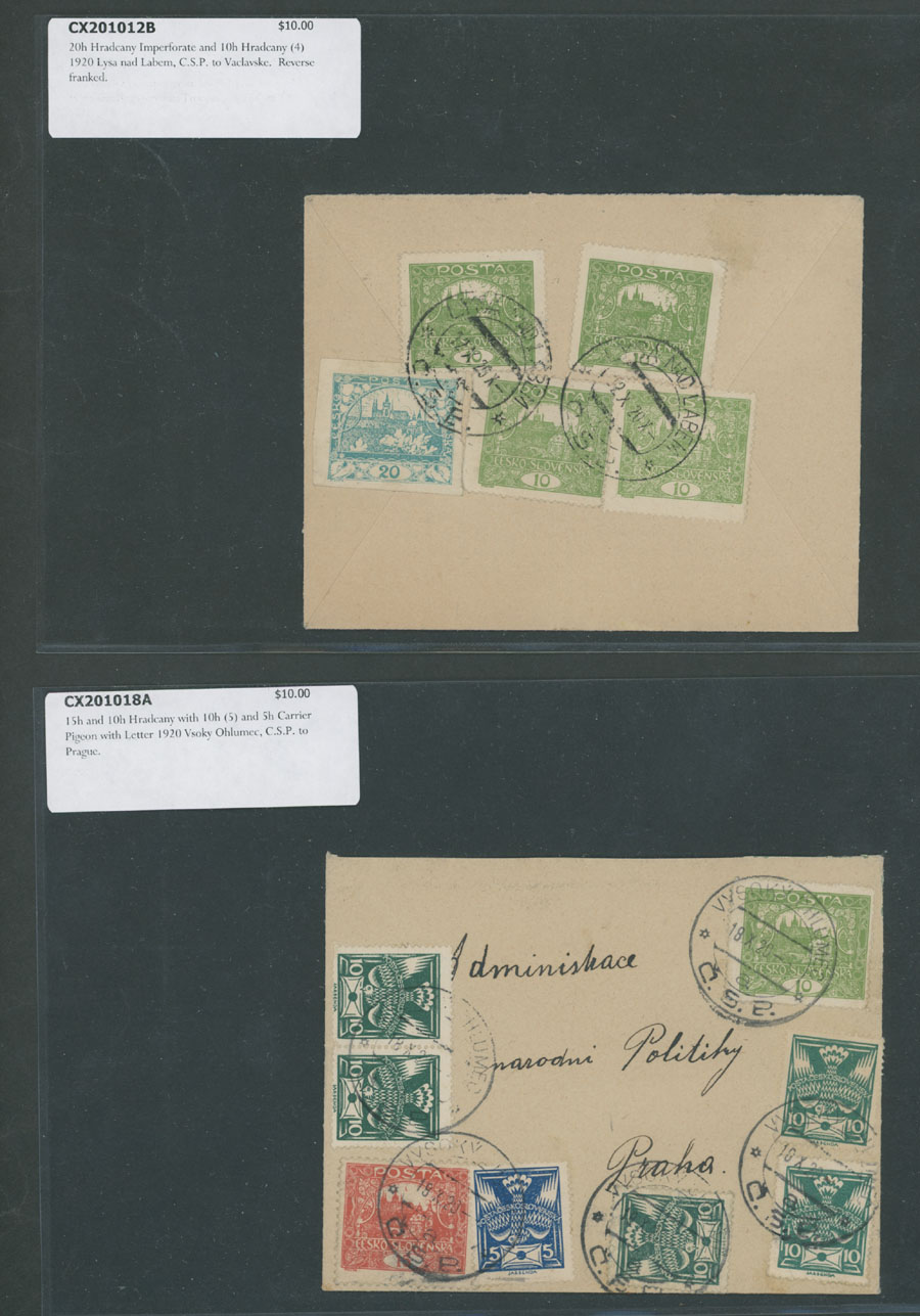 HRADCANY ISSUE: 1919-22, about 100 covers or cards, including 43 stationery cards with pre-printed Hradcany indicia, 11 PPC representing various Czechoslovak city/town views franked by Hradcany issue stamps plus 44 covers and cards bearing Hradcany adhesives, some is bearing ”mixed” franking with other issues, each piece is individually packed in plastic sleeve, described and priced, occasional flaws possible, still F/VF, retail value is $1,150, Est. $200-$250