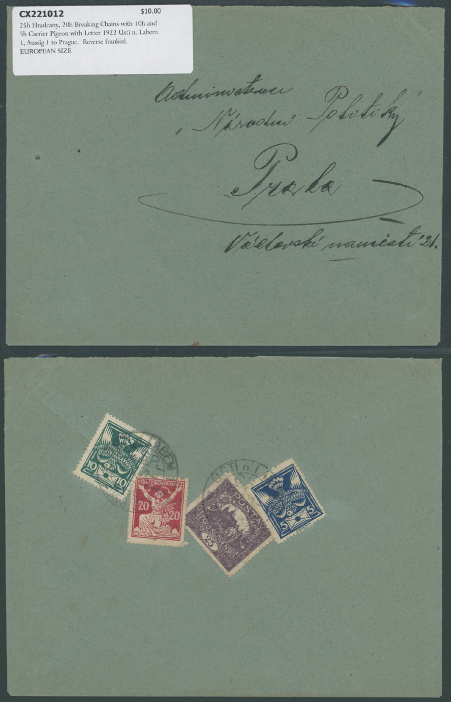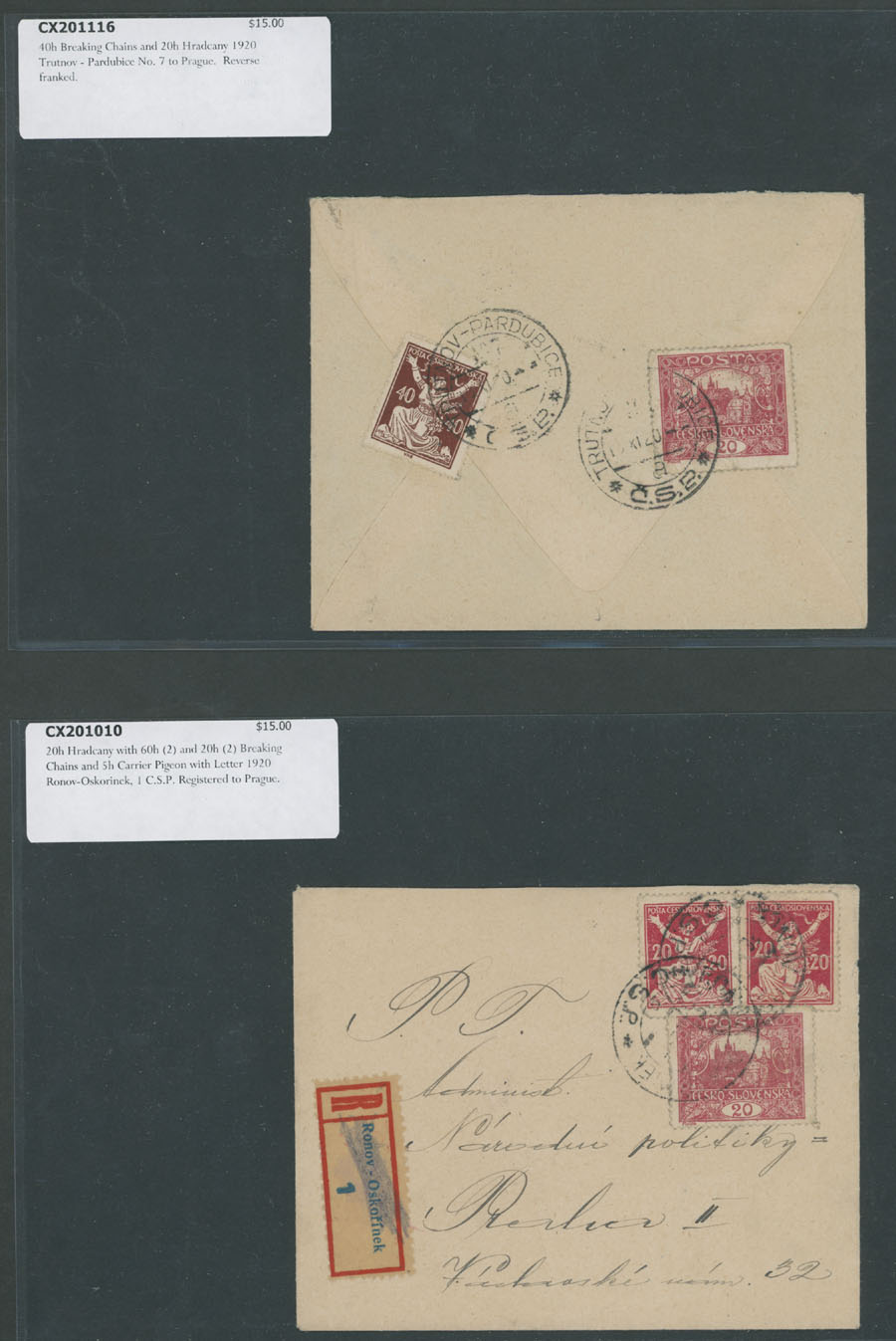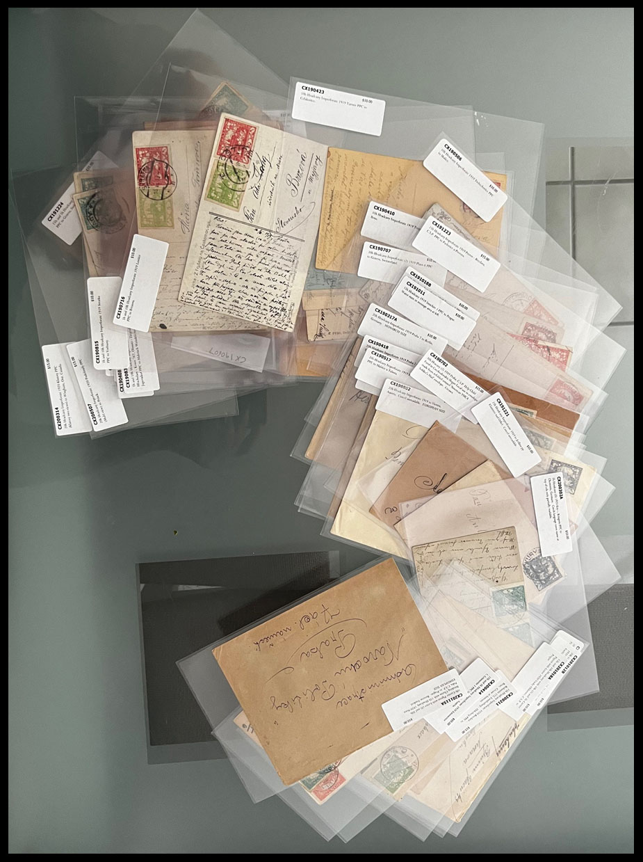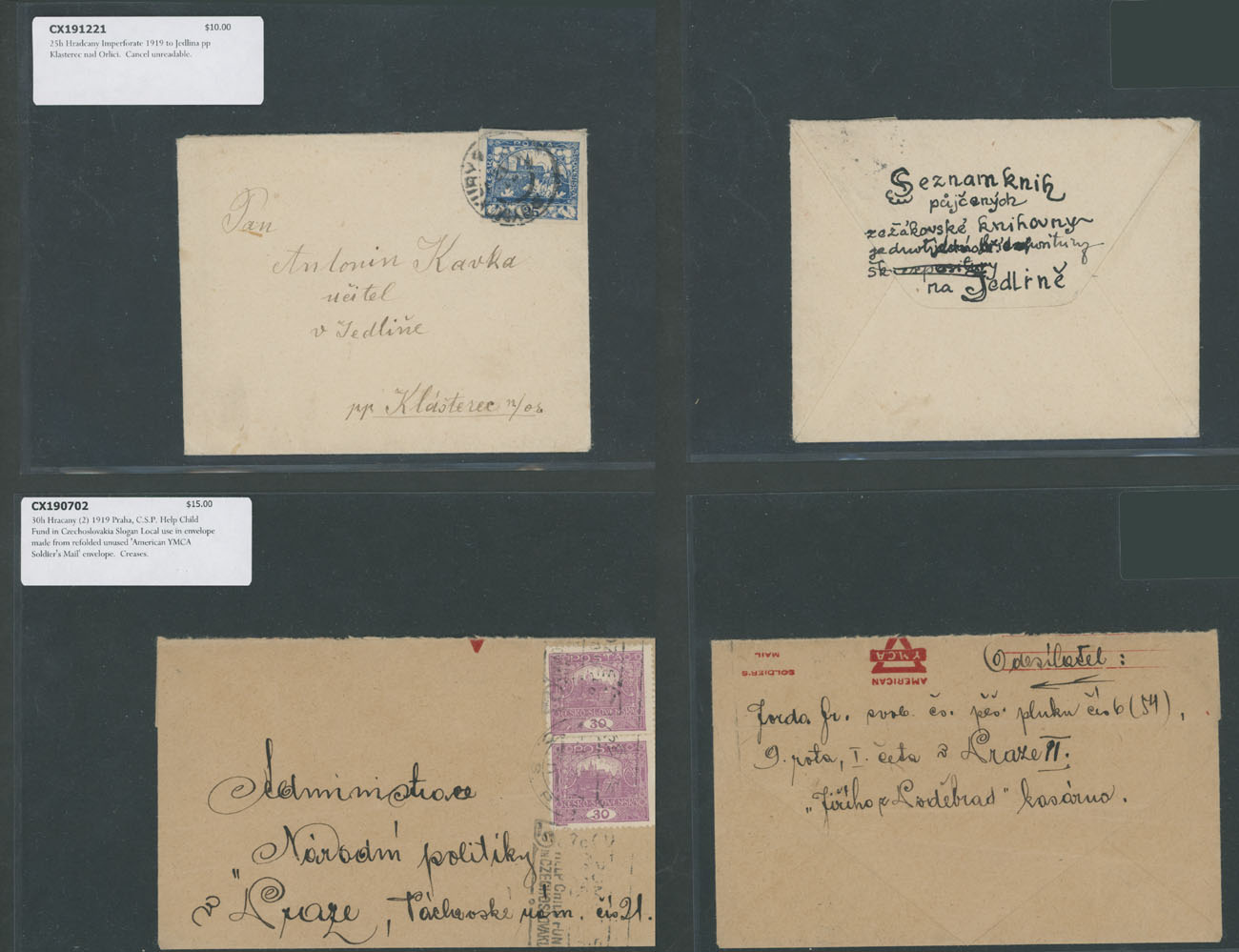HRADCANY ISSUE: 1919-22, about 100 covers or cards, including 43 stationery cards with pre-printed Hradcany indicia, 11 PPC representing various Czechoslovak city/town views franked by Hradcany issue stamps plus 44 covers and cards bearing Hradcany adhesives, some is bearing ”mixed” franking with other issues, each piece is individually packed in plastic sleeve, described and priced, occasional flaws possible, still F/VF, retail value is $1,150, Est. $200-$250