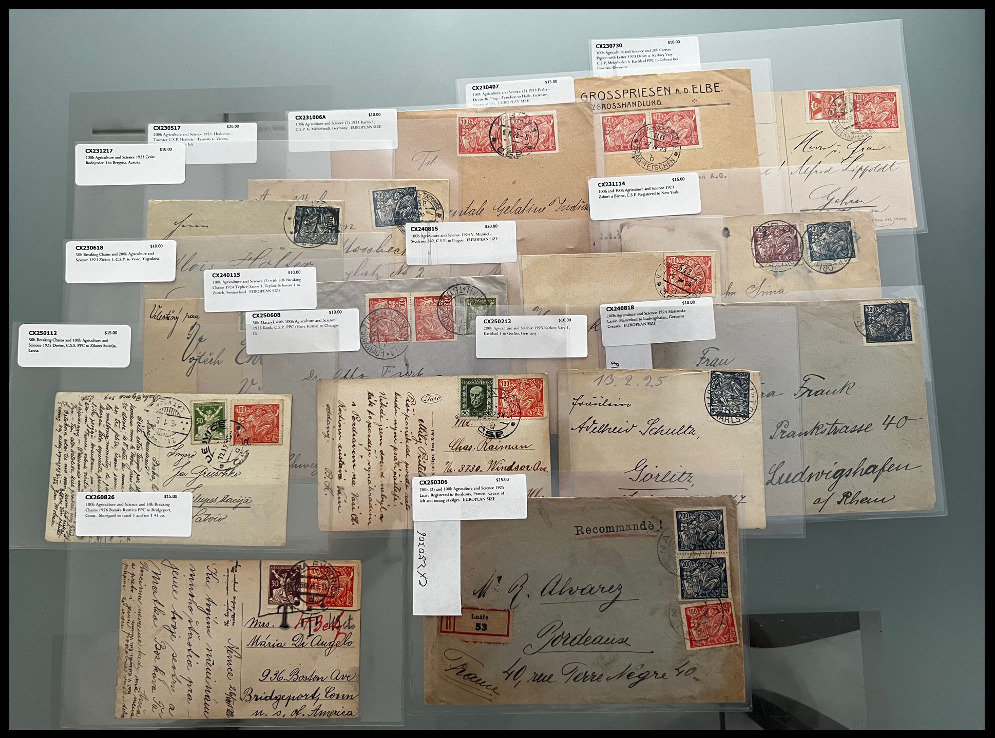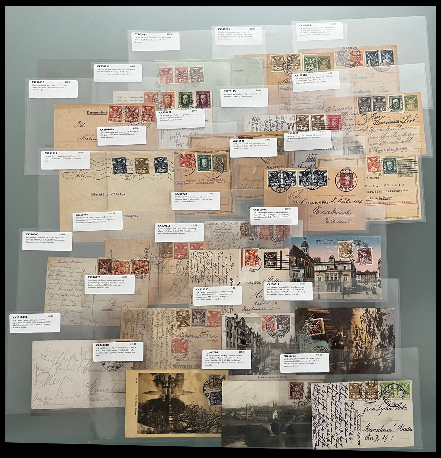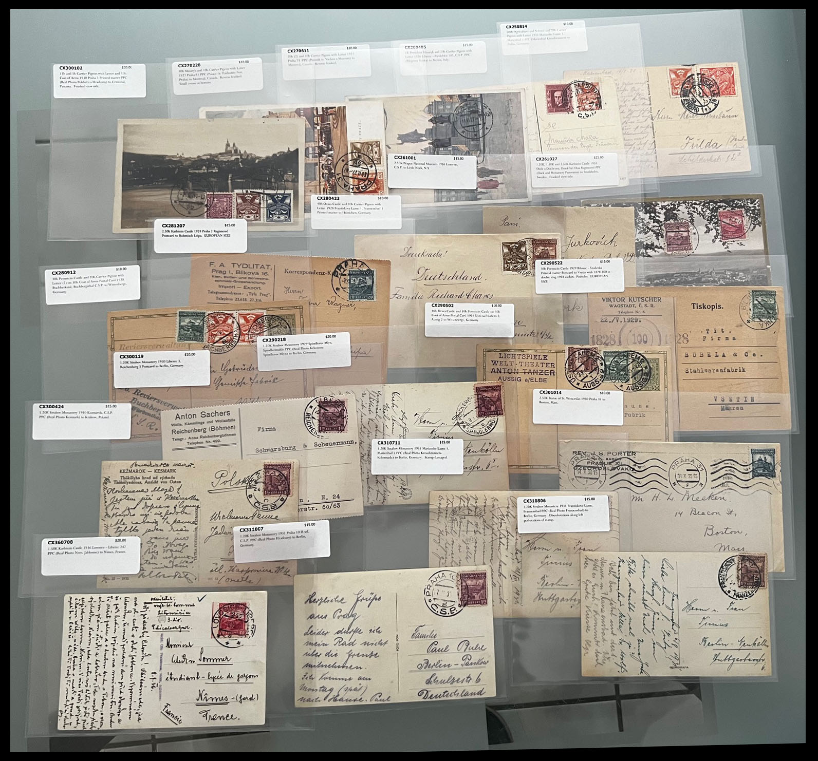 DEFINITIVE ISSUES OF: 1920 and 1926-27, Carrier Pigeon, Agriculture and Views, 106 items, including 41 covers and 65 various postcards, over a half are nice PPC of various subjects, many mixed (from different early Czech issues) franking, interesting destinations, each one individually priced and packed in protective sleeve, generally F/VF, suggested retail is about $1,400, Est. $200-$250