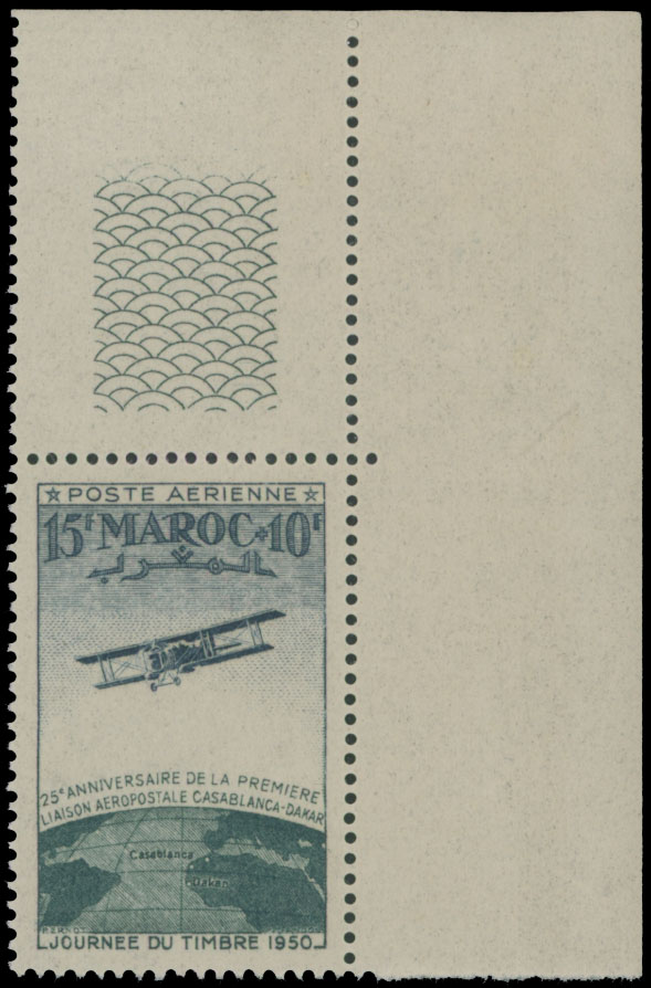 1950, 25th Anniversary of the Air Mail route Casablanca – Dakar, top right corner sheet margin single of 15fr+10fr in blue green with carmine color omitted, full OG, NH, VF and scarce, Yvert #74a, C.v. €435, Est. $250-$300 , Scott #CB35 var