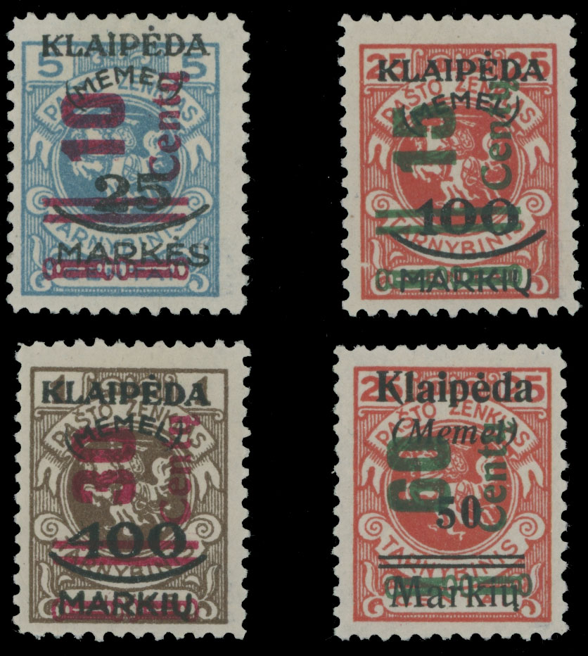 1923, red or green surcharges over black Klaipeda (Memel) surcharges on unissued Lithuanian Official stamps, 10c on 25m/5c blue, 15c on 100m/25c red, 30c on 400m/1L brown, 60c on 50m/25c red, complete set of four, full OG, NH, VF and rare, each one with expert’s mark on reverse, C.v. $1,150, Mi #230-33, C.v. €1,700, Est. $500-$600, Scott #N87-90