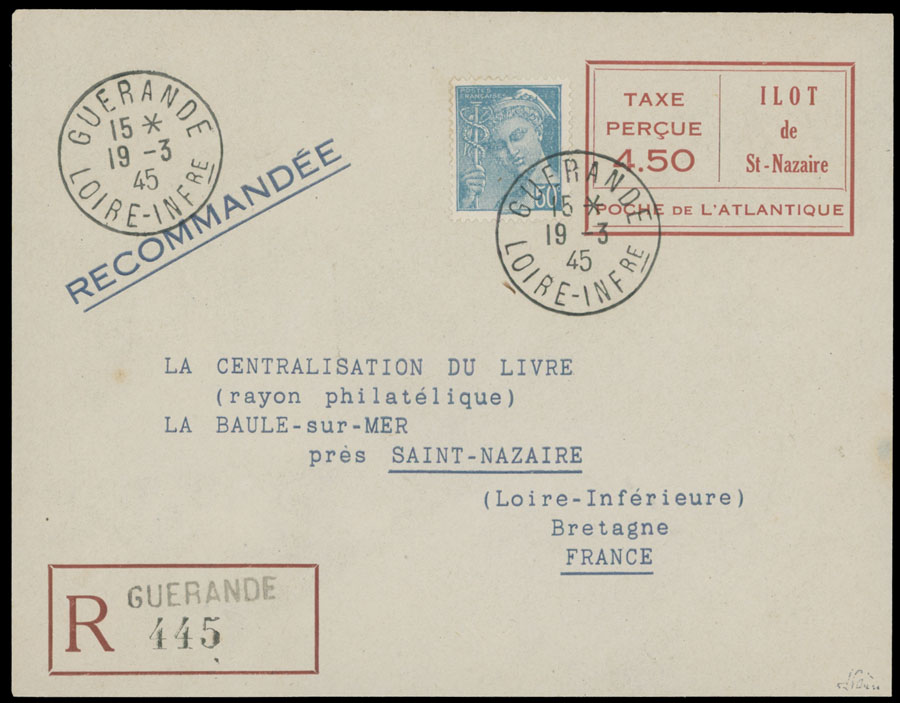 1945 (March 19), registered stationery envelope with pre-printed indicia Taxe Percue 4.50fr red, sent from Guerande to Baule-sur-Mer, uprated by Mercury 50c light blue, all appropriate markings and arrival ds, VF, Est. $200-$250