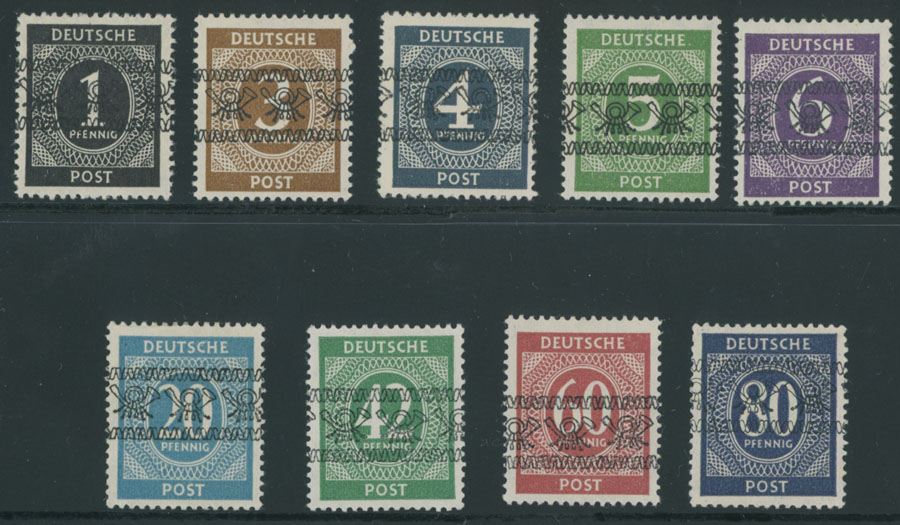 1948, Numerals, black band overprint on 1pf-80pf, complete unissued set of nine, full/large part of OG, NH (1pf, 3pf and 42pf) or LH/hinged, mostly VF, each stamp with several expert’s hs, Michel #I/I-IX/I, C.v. €478, Est. $150-$180