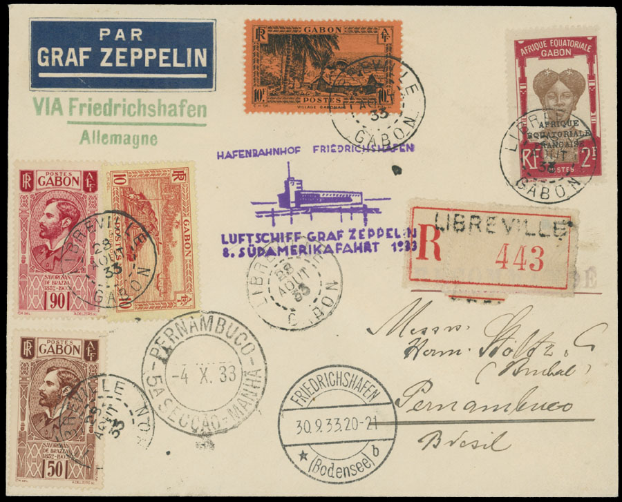1933 (September 30 – October 4), 8th South America flight registered cover to Brazil, franked by five stamps, including overprinted definitive of 2fr carmine and brown and 10fr black on orange paper issued in 1932, cancelled by Libreville ”28.AOUT.33” ds, Friedrichshafen ”30.9.33” connection and violet flight markings, Pernambuco ”4.X.33” arrival ds, mostly VF, Sieger #235, C.v. €1,000 without a premium for postage, Est. $1,000-$1,200, Scott #109, 146