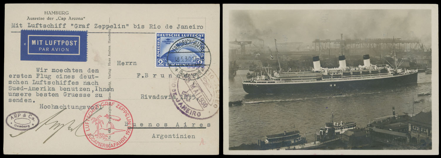 1930 (May 19-25), South America Flight cover to Argentina, franked by a single of 2m ”1 SUDAMERIKA FAHRT”, tied by Friedrichshafen ”18.5.30” ds, red Flight cachet and Rio de Janeiro ”25.MAI.1930” oval receiver, official signature, VF, Scott C.v. $300 for a stamp off cover, Sieger #57M, C.v. €500 without a premium for franking, Est. $250-$300, Scott #C38