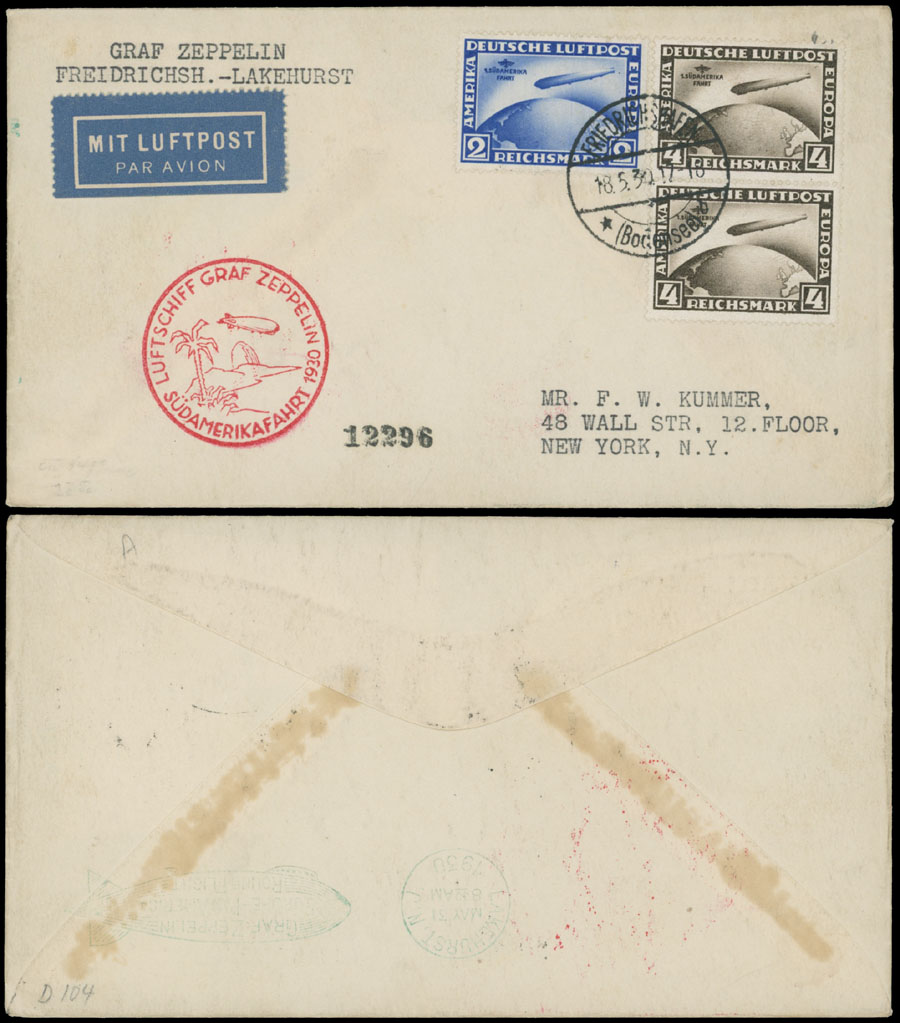 1930 (May 19-31), South America Flight cover to USA, franked by a single of 2m and vertical pair of 4m ”1 SUDAMERIKA FAHRT”, tied by Friedrichshafen ”18.5.30” ds, red Flight cachet and Lakehurst ”May 31, 1930” machine arrival ds in green on reverse, VF, Scott C.v. $900 as used stamps off cover, Sieger #57N, C.v. €675 without a premium for franking, Est. $400-$450, Scott #C38, C39 x2