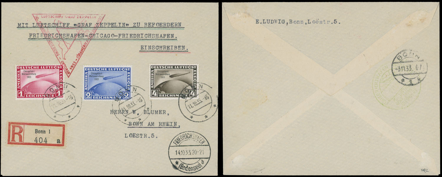 1933, Chicago (Century of Progress) Round Flight registered cover, franked by complete set of ”CHICAGOFAHRT” overprints, tied by Bonn ”11.10.33” ds, Friedrichshafen ”14.10.33” connection and red confirmation cachet, special arrival marking ”2.11.33” in green on reverse, slight traces of mounts, otherwise VF, Scott C.v. $755 for used set, Sieger #238D, C.v. €1,425, Est. $600-$700, Scott #C40-42